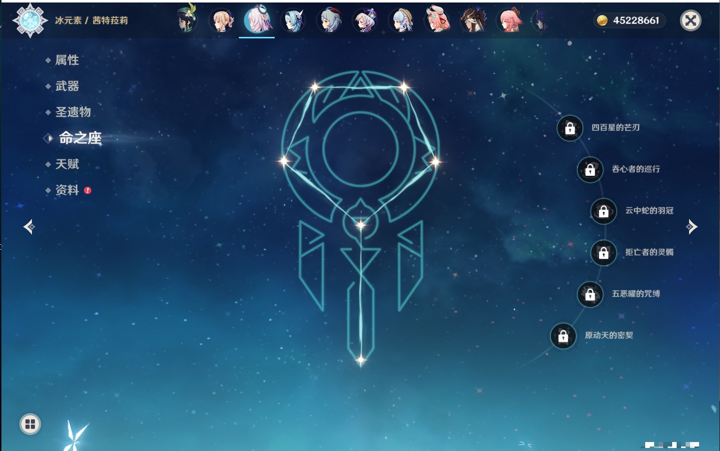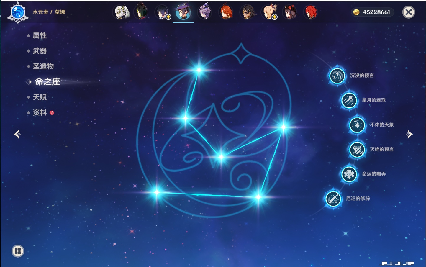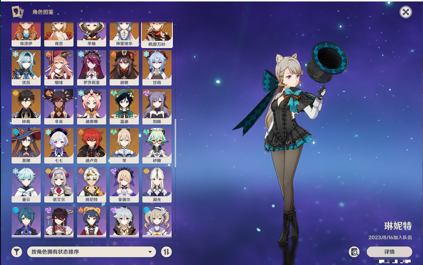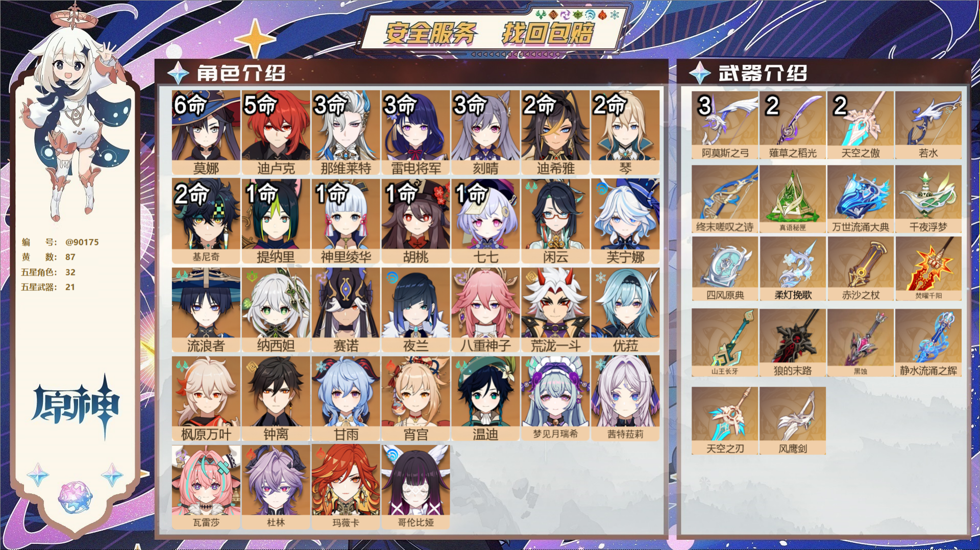 【32个五星角色】,满命莫娜,5命迪卢克,3命那维莱特,3命雷电将军,3命刻晴,2命迪希雅,2命琴,2命基尼奇,1命提纳里,1命神里绫华,1命胡桃,1命七七,0命闲云,0命芙宁娜,0命流浪者,0命纳西妲,0命赛诺,0命夜兰,0命八重神子,0命荒泷一斗,0命优菈,0命枫原万叶,0命钟离,0命甘雨,0命宵宫,0命温迪,0命梦见月瑞希,0命茜特菈莉,0命瓦雷莎,0命杜林,0命玛薇卡,0命哥伦比娅,