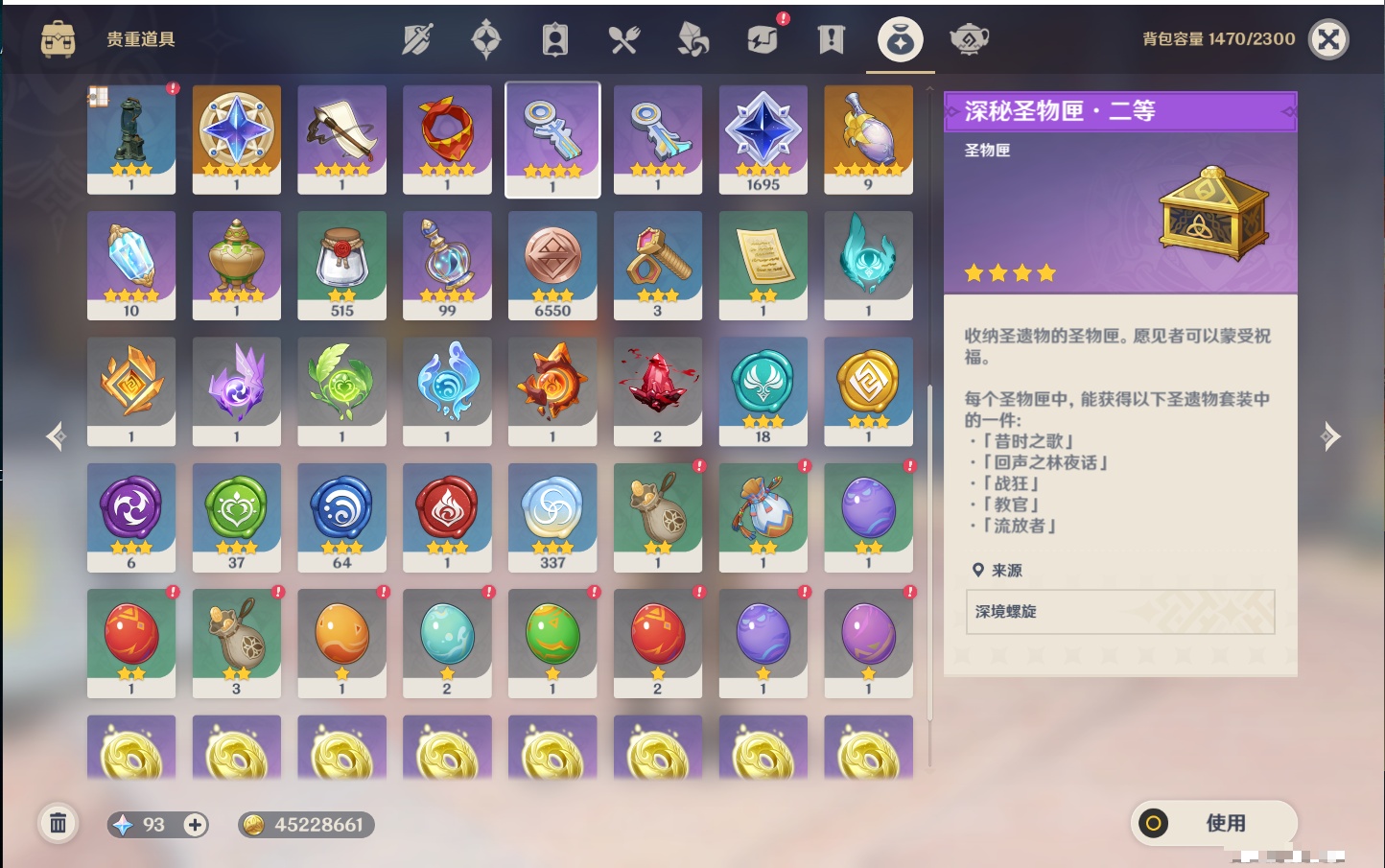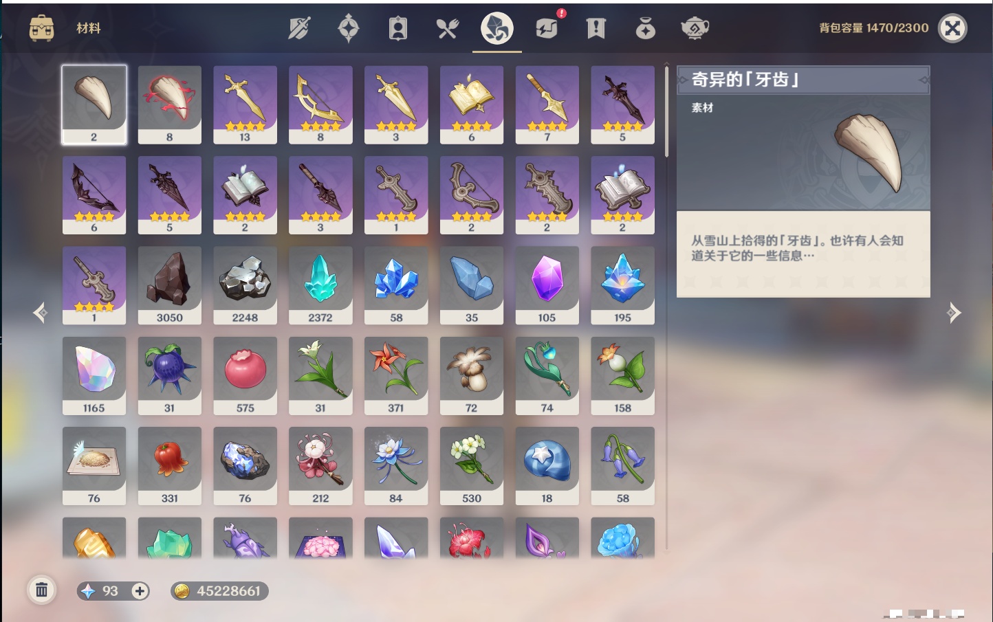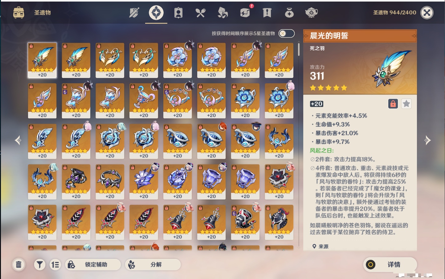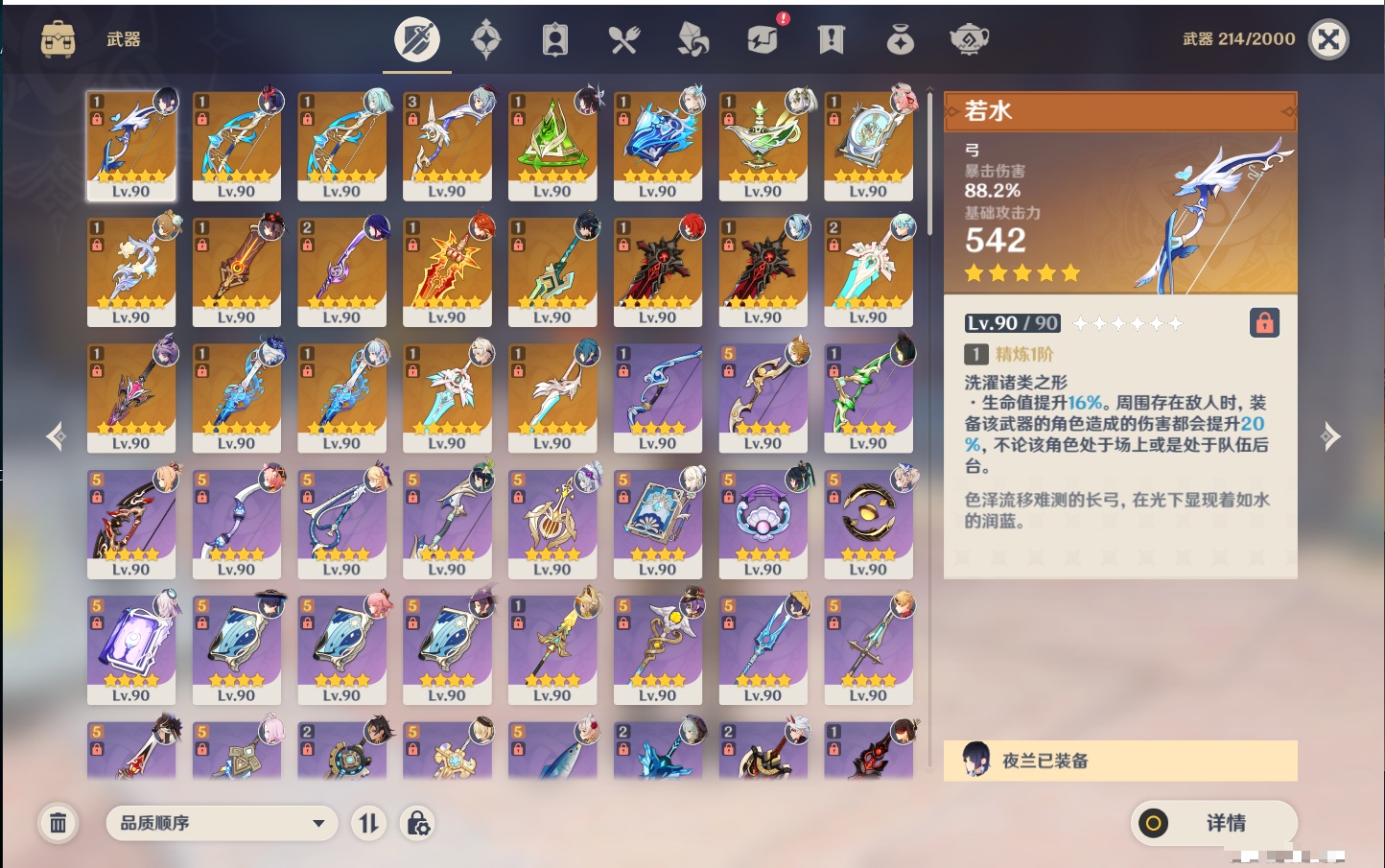 【21个五星武器】,精3阿莫斯之弓,精2薙草之稻光,精2天空之傲,精1若水,精1终末嗟叹之诗,精1真语秘匣,精1万世流涌大典,精1千夜浮梦,精1四风原典,精1柔灯挽歌,精1赤沙之杖,精1焚曜千阳,精1山王长牙,精1狼的末路,精1黑蚀,精1静水流涌之辉,精1天空之刃,精1风鹰剑,