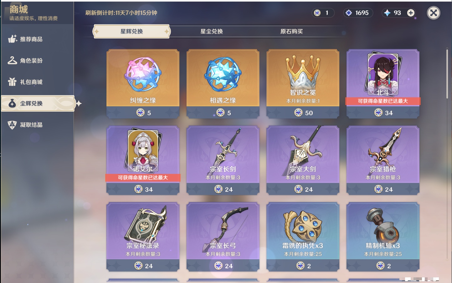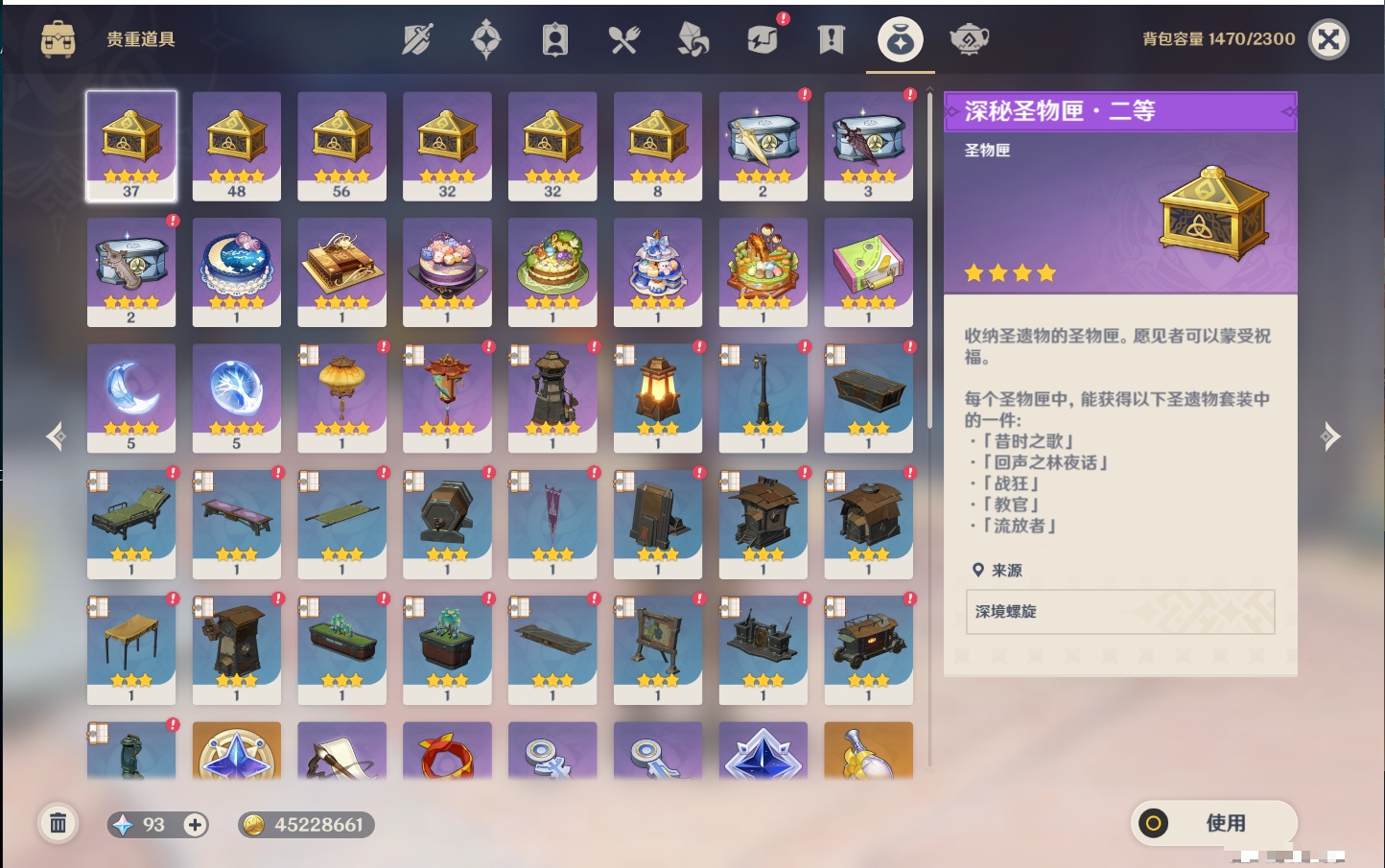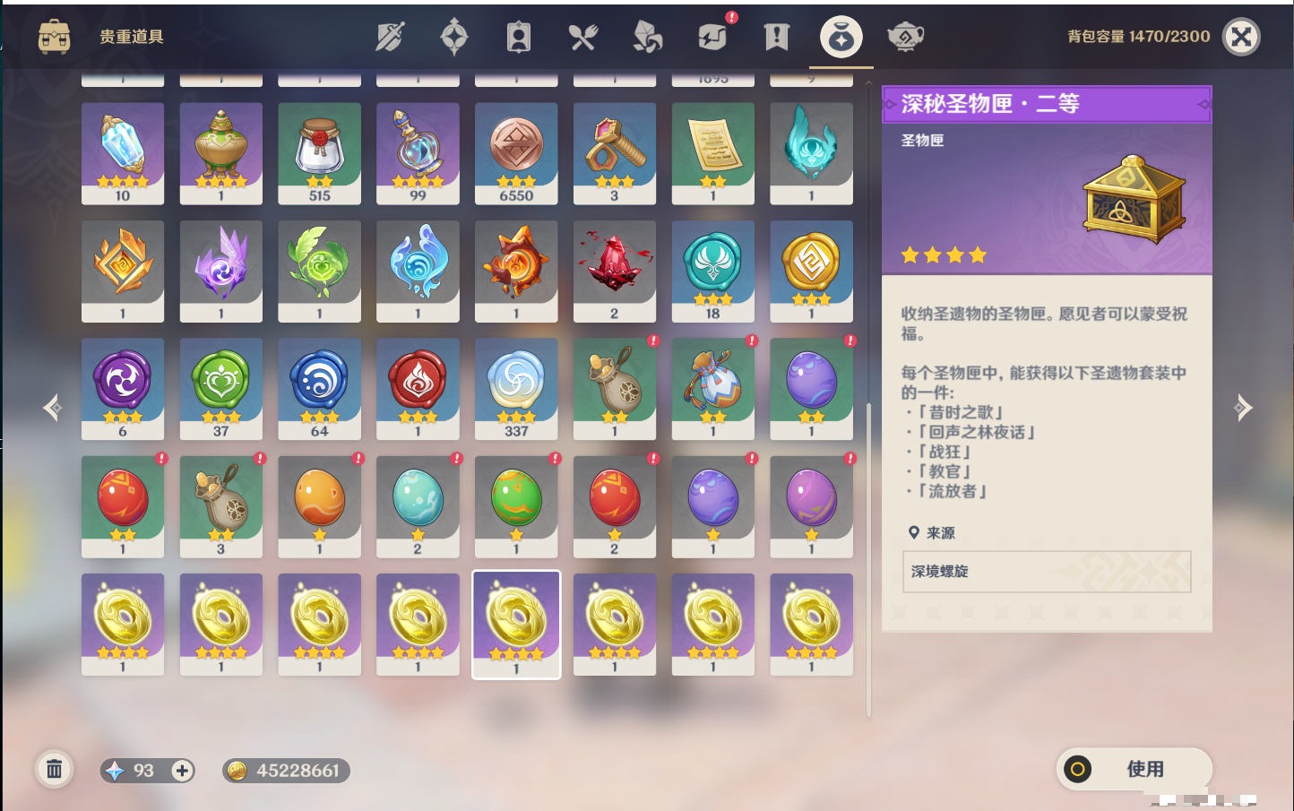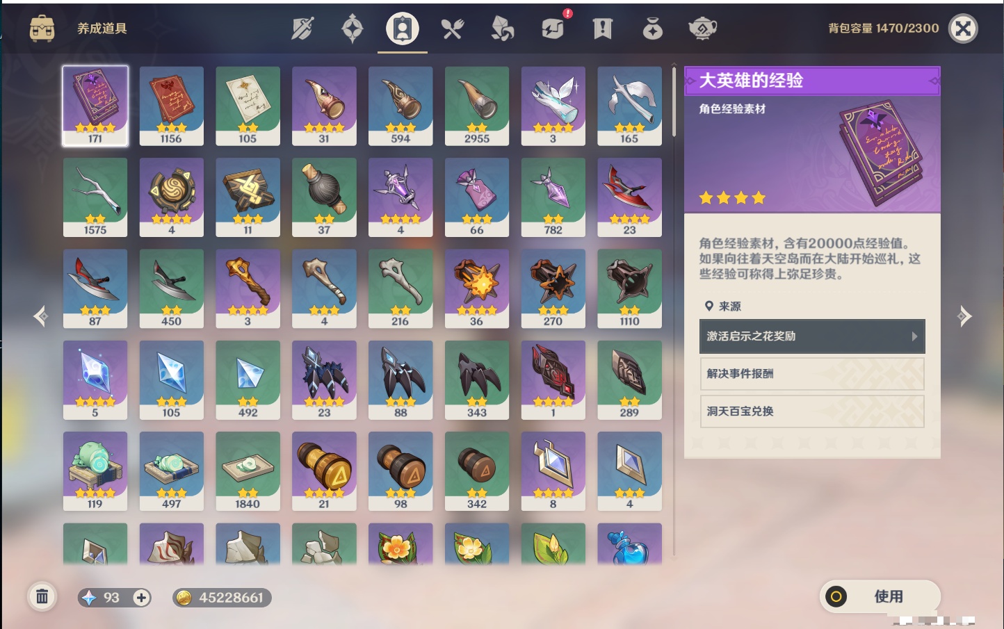 【21个五星武器】,精3阿莫斯之弓,精2薙草之稻光,精2天空之傲,精1若水,精1终末嗟叹之诗,精1真语秘匣,精1万世流涌大典,精1千夜浮梦,精1四风原典,精1柔灯挽歌,精1赤沙之杖,精1焚曜千阳,精1山王长牙,精1狼的末路,精1黑蚀,精1静水流涌之辉,精1天空之刃,精1风鹰剑,