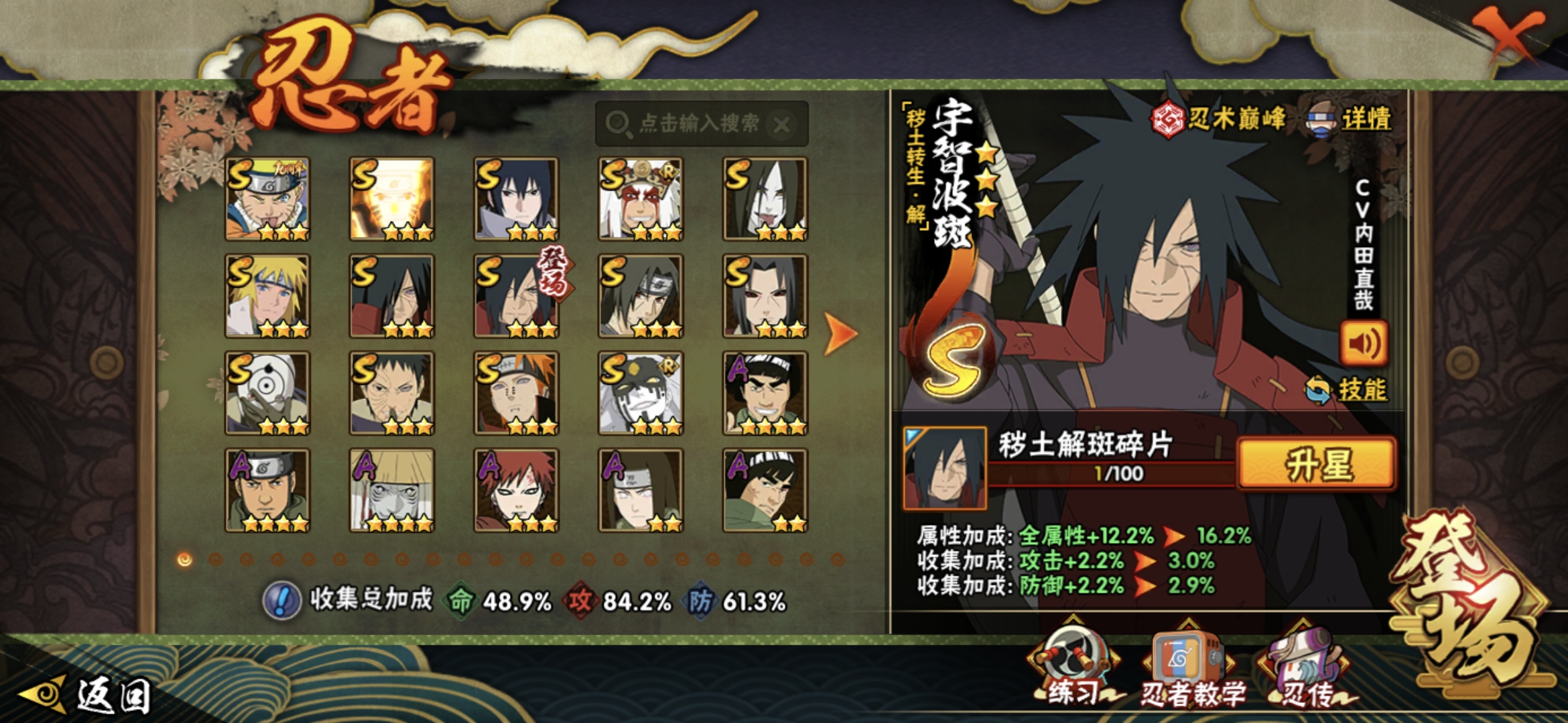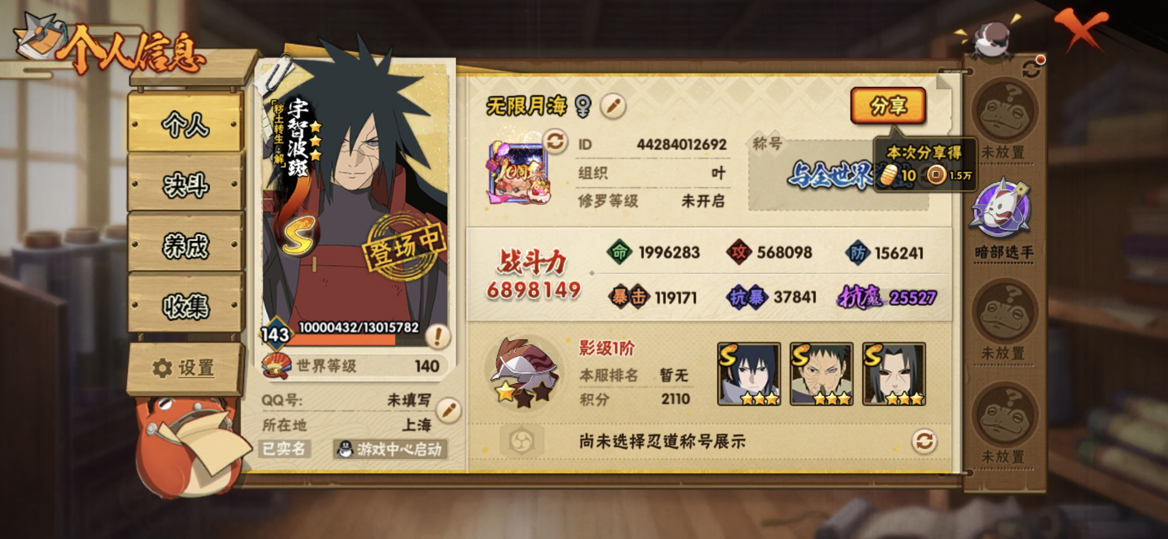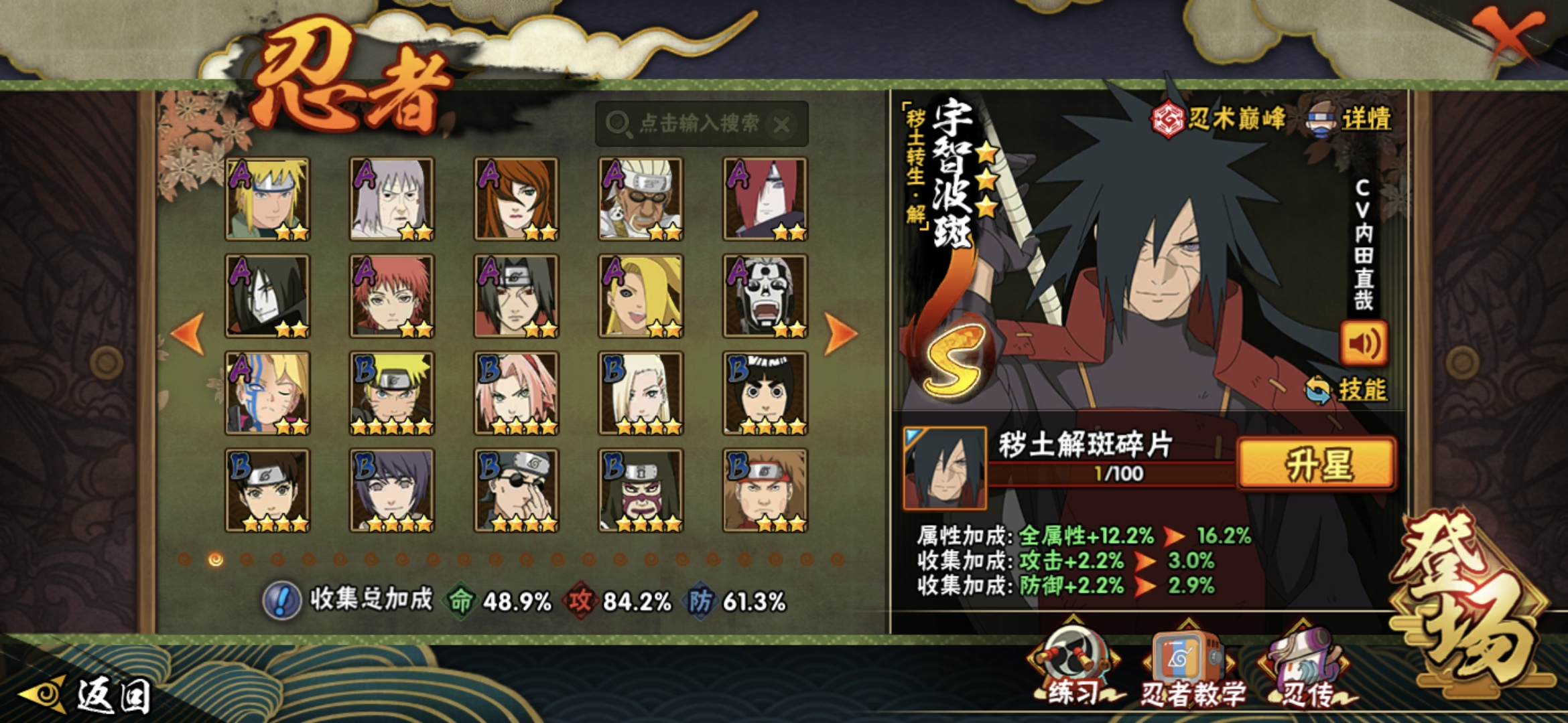 PX_2467625-服】2840【等级】143【S级数量】14【A级数量】17【B级数量】56【C级数量】49【S级】宇智波鼬「须佐能乎」,宇智波佐助「永恒万花筒」,宇智波鼬「秽土转生」,宇智波带土「忍界大战」,波风水门,漩涡鸣人·宇智波佐助,自来也「舞之豪杰」,漩涡鸣人「九喇嘛连结」,大筒木桃式,宇智波斑「秽土转生·解」,宇智波斑「白面具」,宇智波斑「秽土转生」,佩恩「天道」,大蛇丸,【A级】迪达拉「秽土