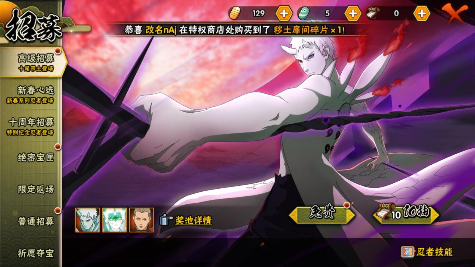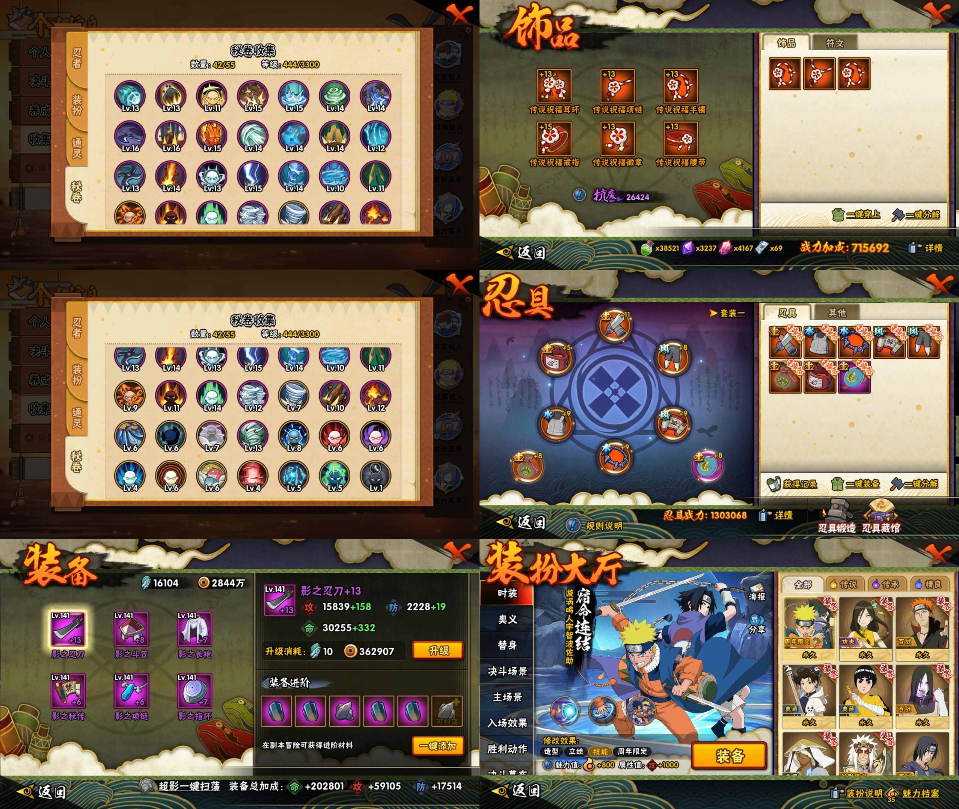 【A忍者】,机械鸣人「初始形态」,大野木「侠隐江湖」,巳月「仙人模式」,迈特凯「青春爆炸」,土台「忍界大战」,漩涡博人「桃式显现」,日向雏田「最终章」,李洛克「忍界大战」,蝎「绯流琥」,宇智波泉奈,神农「羁绊」,桃地再不斩「秽土转生」,长门「青年」,艾「青年」,达鲁伊「五代目雷影」,波风水门「青年」,奇拉比「忍界大战」,宇智波佐助「须佐能乎」,迪达拉「秽土转生」,旗木卡卡西「忍界大战」,千代「近松十人卫」,秋道丁次「忍界大战」,猿飞阿斯玛「秽土转生」,宇智波佐助「万花筒写轮眼」,飞段「死司凭血」,飞段,迪达拉,蝎,干柿鬼鲛,宇智波鼬,猿飞阿斯玛,迈特凯,