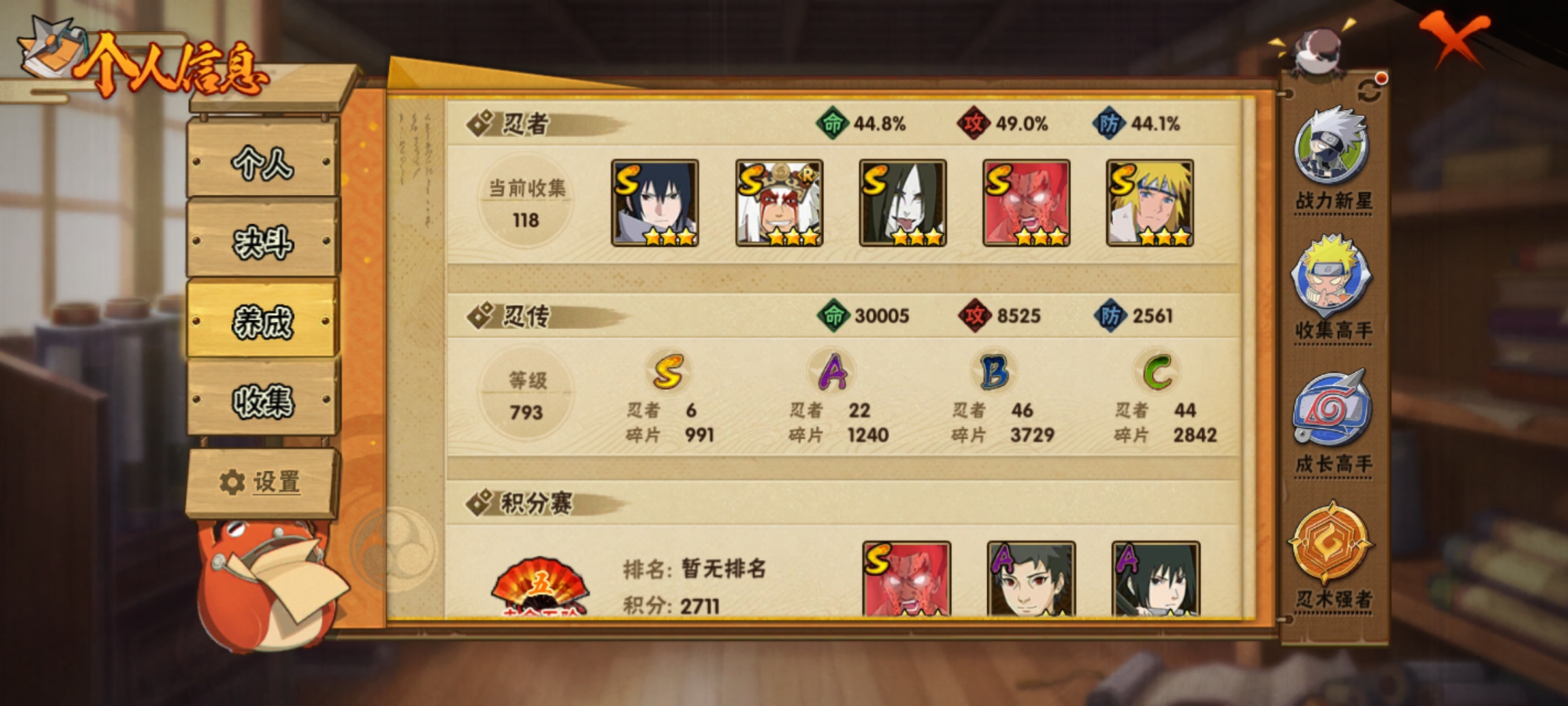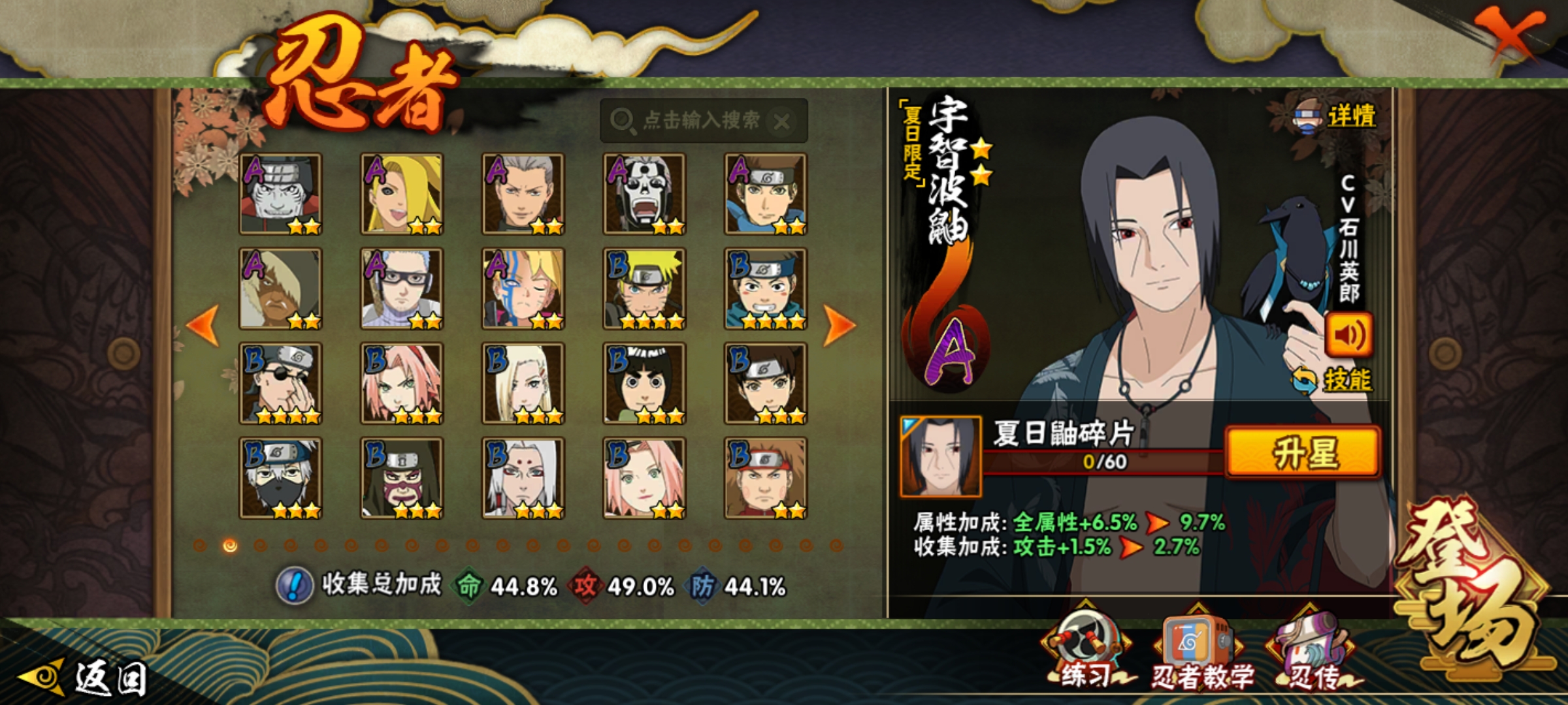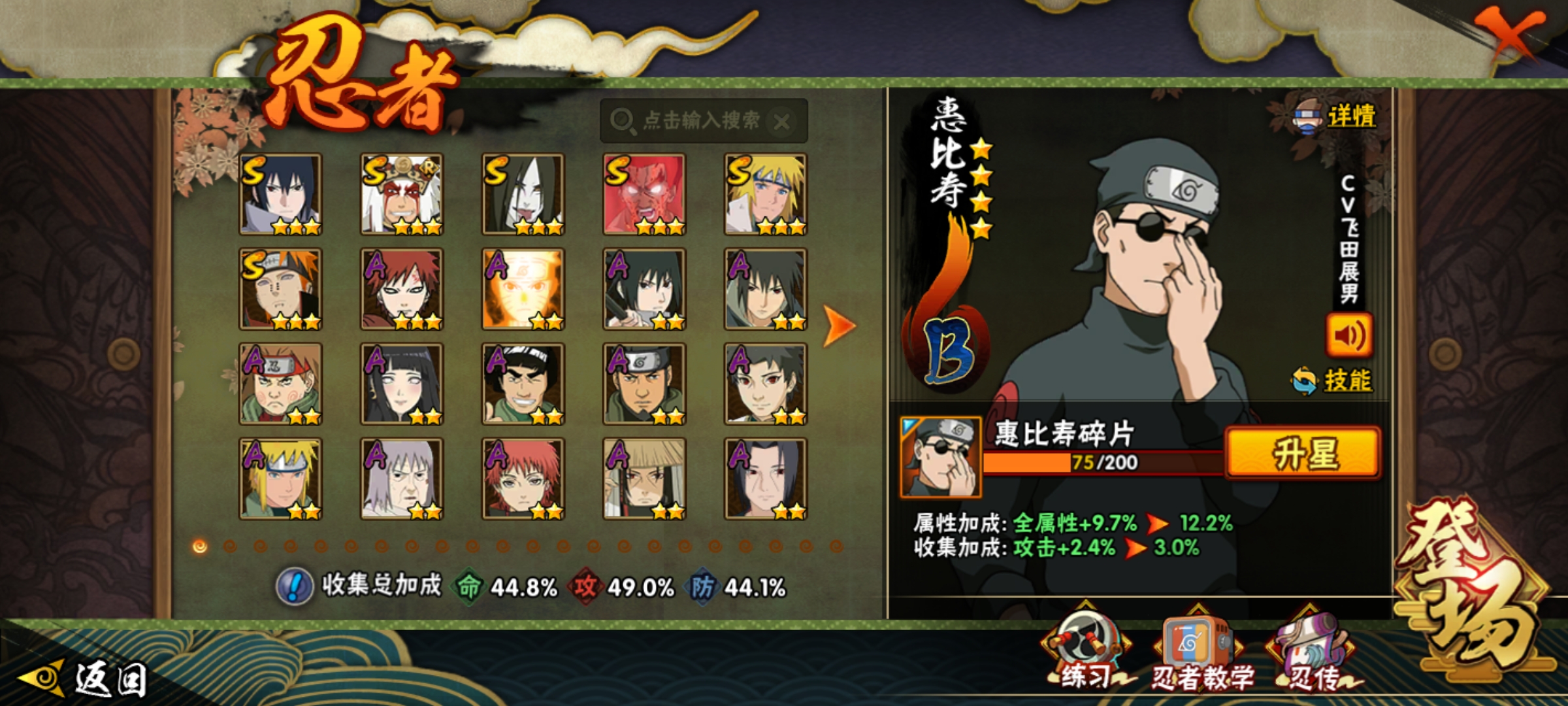 PX_2476564-509【等级】141【S级数量】6【A级数量】22【B级数量】46【C级数量】44【S级】波风水门,佩恩「天道」,自来也「舞之豪杰」,迈特凯「死门」,宇智波佐助「永恒万花筒」,大蛇丸【A级】蝎,千代「近松十人卫」,漩涡博人「桃式显现」,漩涡鸣人「九尾查克拉」,飞段,宇智波鼬「夏日限定」,我爱罗「疾风传」,猿飞阿斯玛,长十郎「六代目水影」,达鲁伊「五代目雷影」,日向雏田