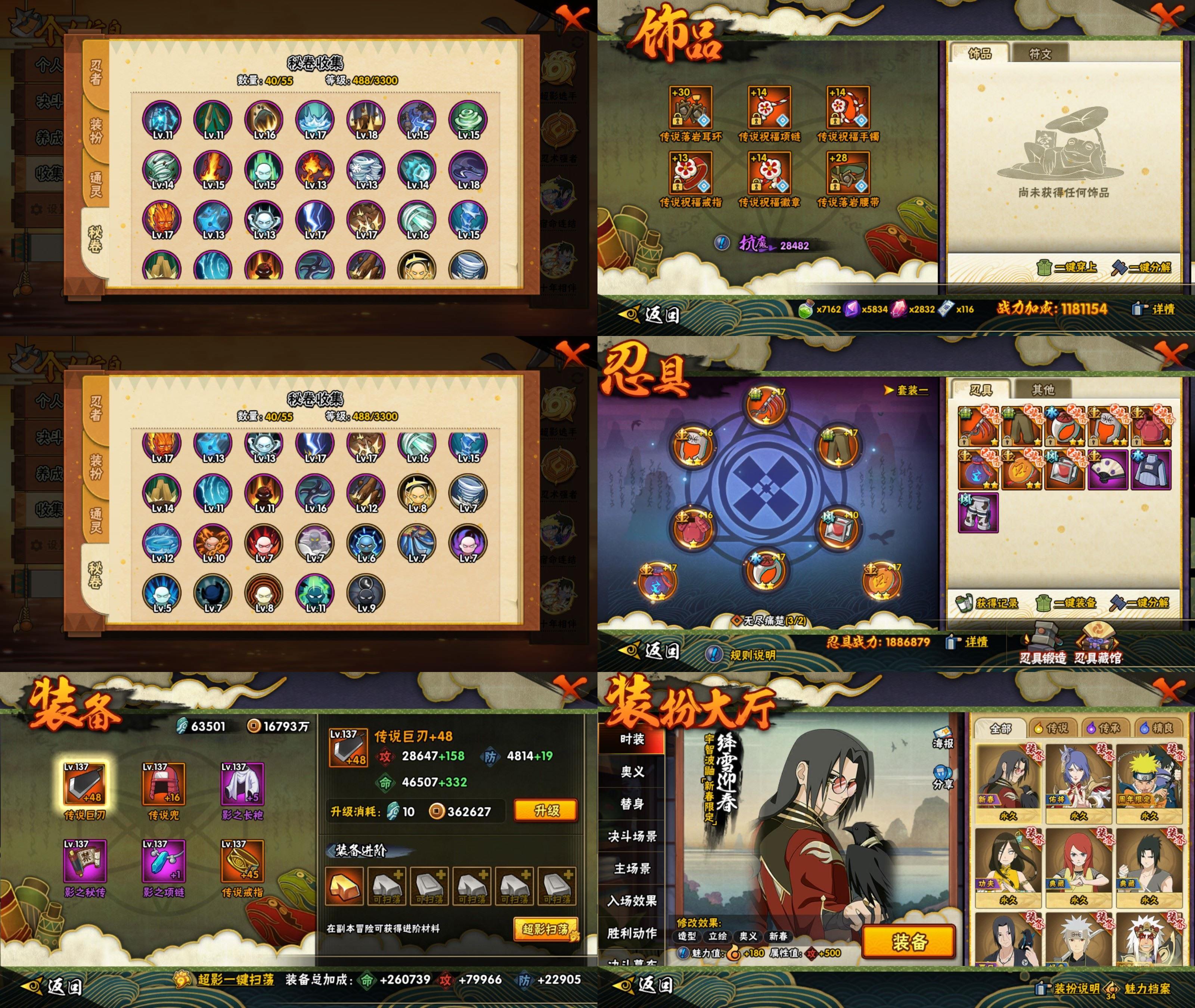 【A忍者】,小南「神驹佑将」,机械鸣人「初始形态」,大野木「侠隐江湖」,迈特凯「青春爆炸」,土台「忍界大战」,漩涡博人「桃式显现」,宇智波鼬「夏日限定」,黑绝,神农「羁绊」,药师兜「半蛇斗篷」,宇智波鼬「新春限定」,秋道丁次「忍界大战」,大蛇丸「晓」,志村团藏,飞段「死司凭血」,飞段,迪达拉,蝎,干柿鬼鲛,宇智波鼬,猿飞阿斯玛,迈特凯,