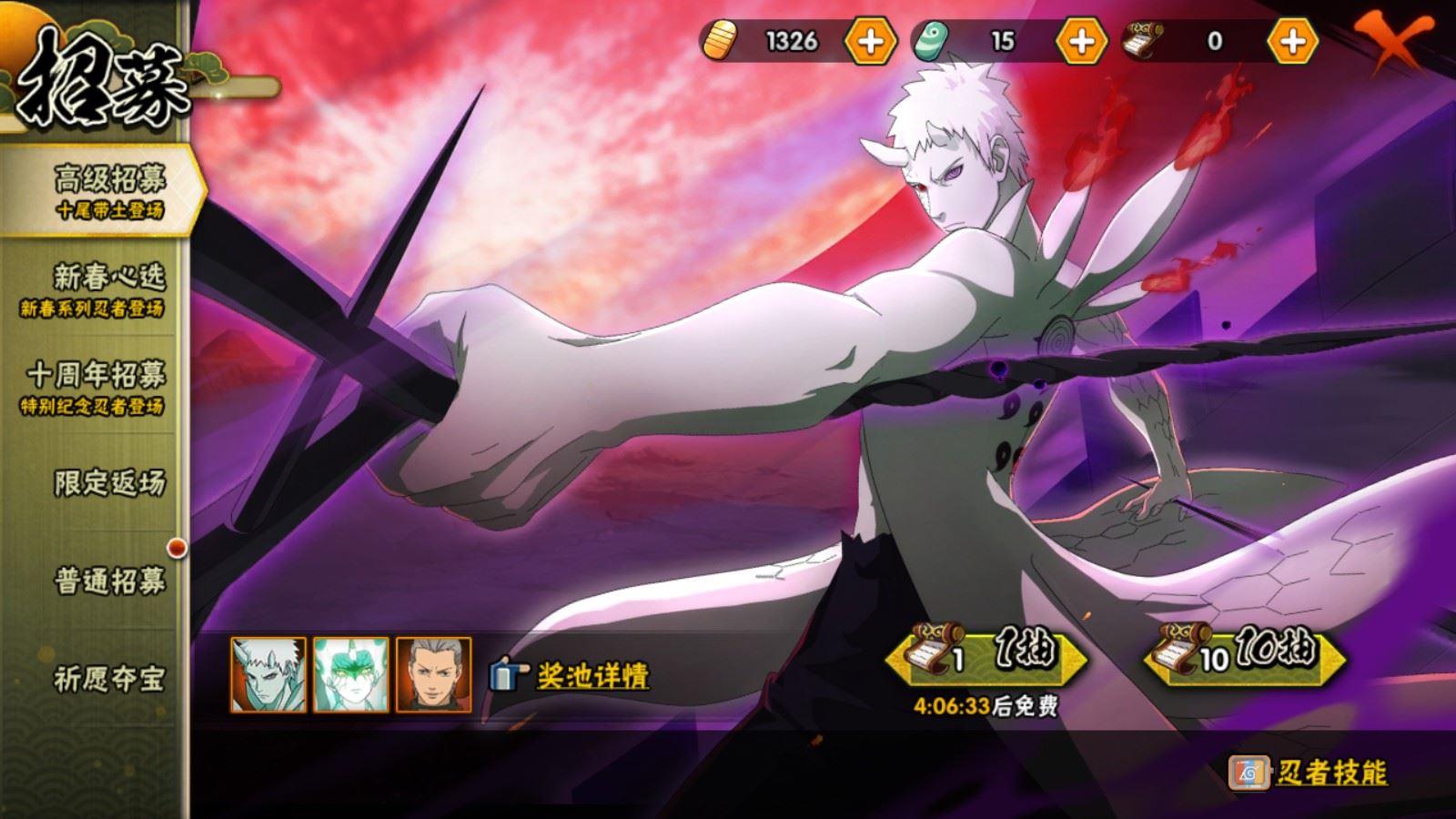 ,自来也「舞之豪杰」,自来也「传说中的三忍」,漩涡鸣人「暴怒·第六尾」,宇智波鼬「秽土转生」,宇智波鼬「须佐能乎」,