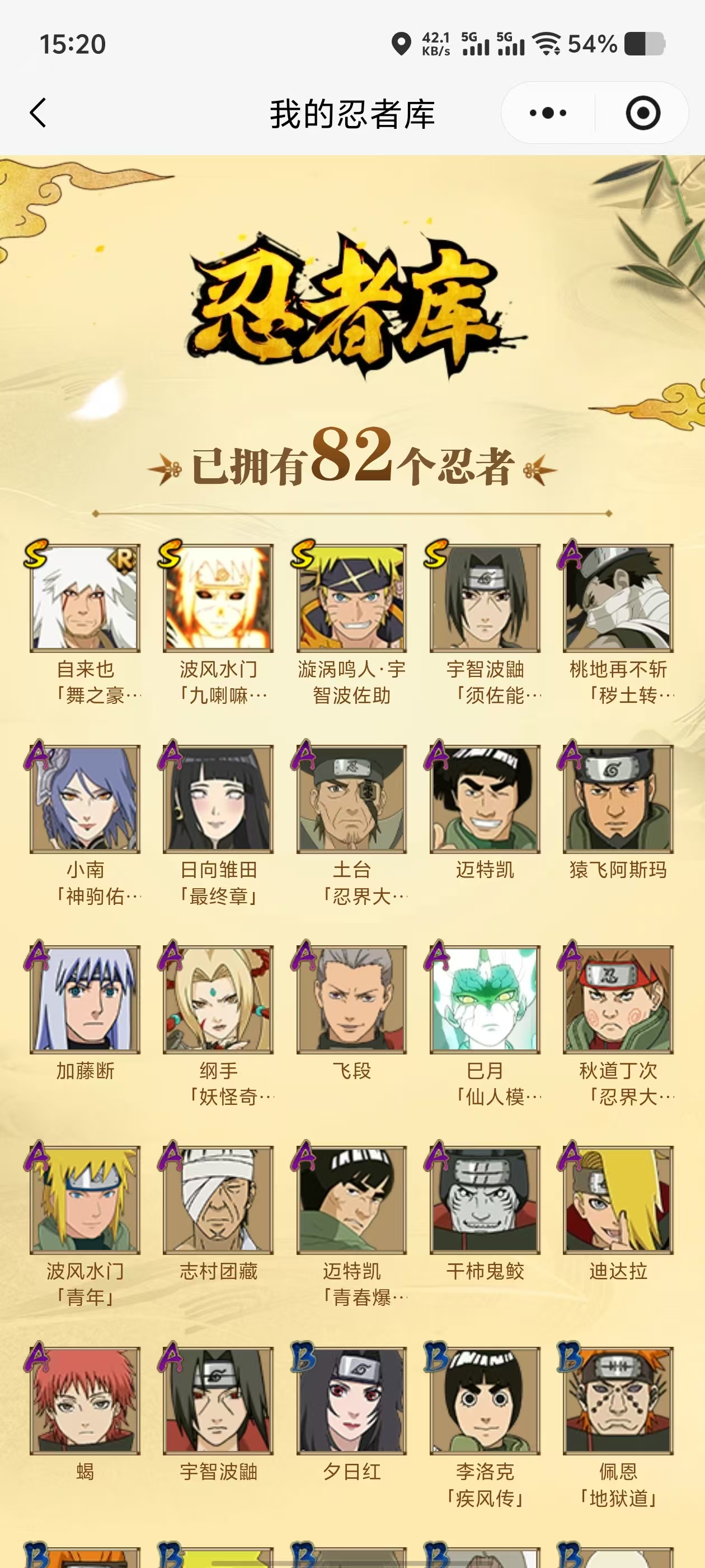 【A忍者】,小南「神驹佑将」,纲手「妖怪奇谭」,巳月「仙人模式」,迈特凯「青春爆炸」,土台「忍界大战」,日向雏田「最终章」,桃地再不斩「秽土转生」,波风水门「青年」,加藤断,秋道丁次「忍界大战」,志村团藏,飞段,迪达拉,蝎,干柿鬼鲛,宇智波鼬,猿飞阿斯玛,迈特凯,