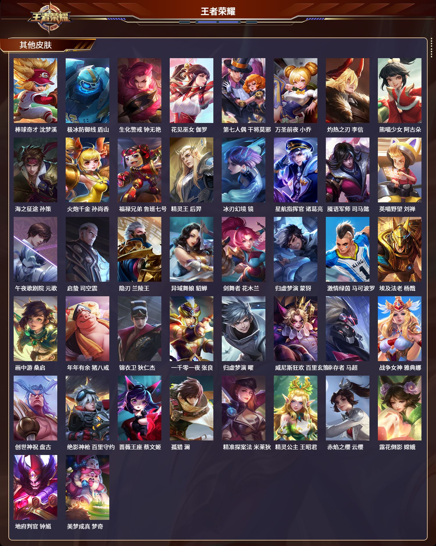 【46,其他皮肤】伊势巫女,大乔,战争骑士,夏侯惇,芝加哥教父,黄忠,三太子,哪吒,棒球奇才,沈梦溪,极冰防御线,盾山,生化警戒,钟无艳,花见巫女,伽罗,第七人偶,干将莫邪,万圣前夜,小乔,灼热之刃,李信,熊喵少女,阿古朵,海之征途,孙策,火炮千金,孙尚香,福禄兄弟,鲁班七号,精灵王,后羿,冰刃幻境,镜,星航指挥官,诸葛亮,魇语军师,司马懿,英喵野望,刘禅,午夜歌剧院,元歌,启蛰,司空震,隐刃,兰陵王,异域舞娘,貂蝉,剑舞者,花木兰,归虚梦演,蒙犽,激情绿茵,马可波罗,埃及法老,杨戬,画中游,桑启,年年有余,猪八戒,锦衣卫,狄仁杰,一千零一夜,张良,归虚梦演,曜,威尼斯狂欢,百里玄策,幸存者,马超,战争女神,雅典娜,创世神祝,盘古,绝影神枪,百里守约,蔷薇王座,蔡文姬,孤猎,澜,精准探案法,米莱狄,精灵公主,王昭君,赤焰之缨,云缨,露花倒影,嫦娥,地府判官,钟馗,美梦成真,梦奇,