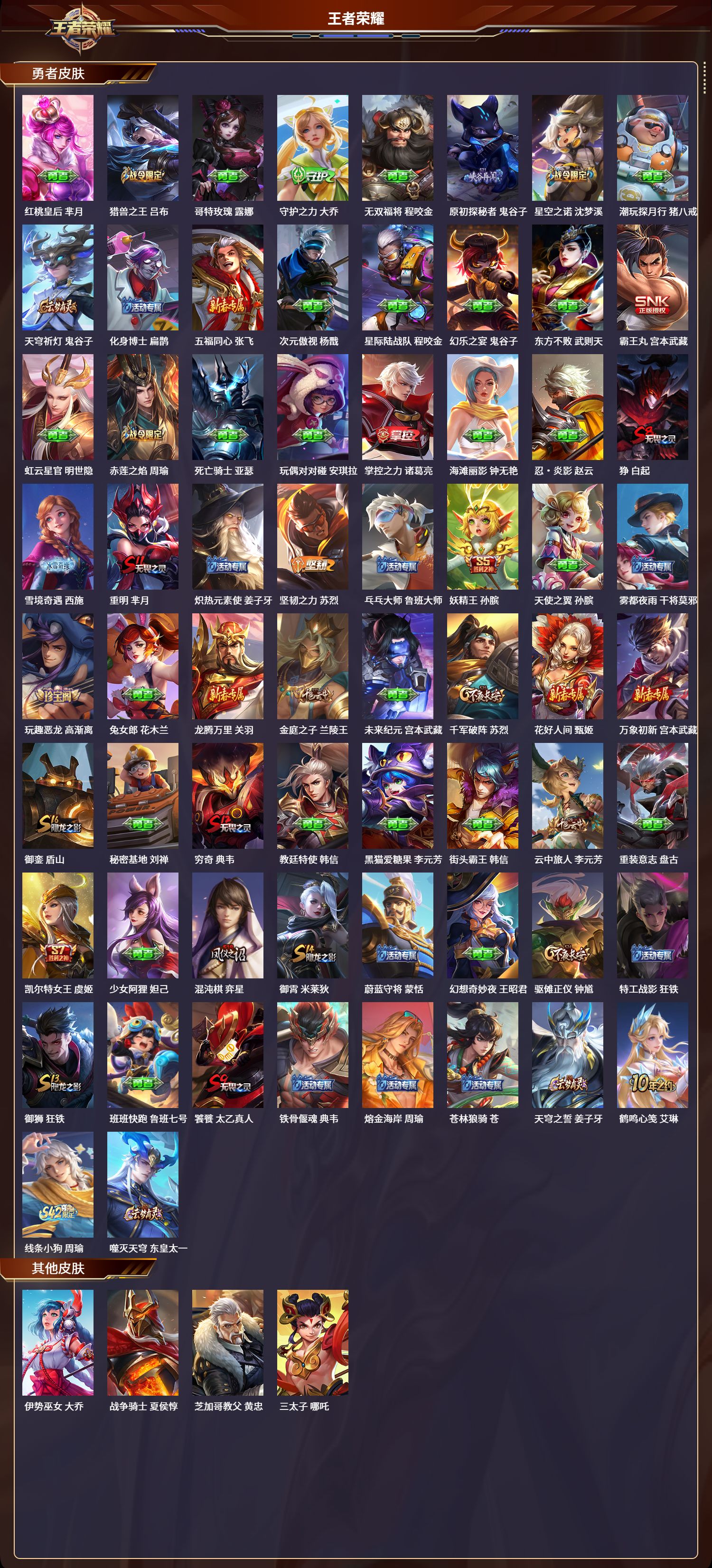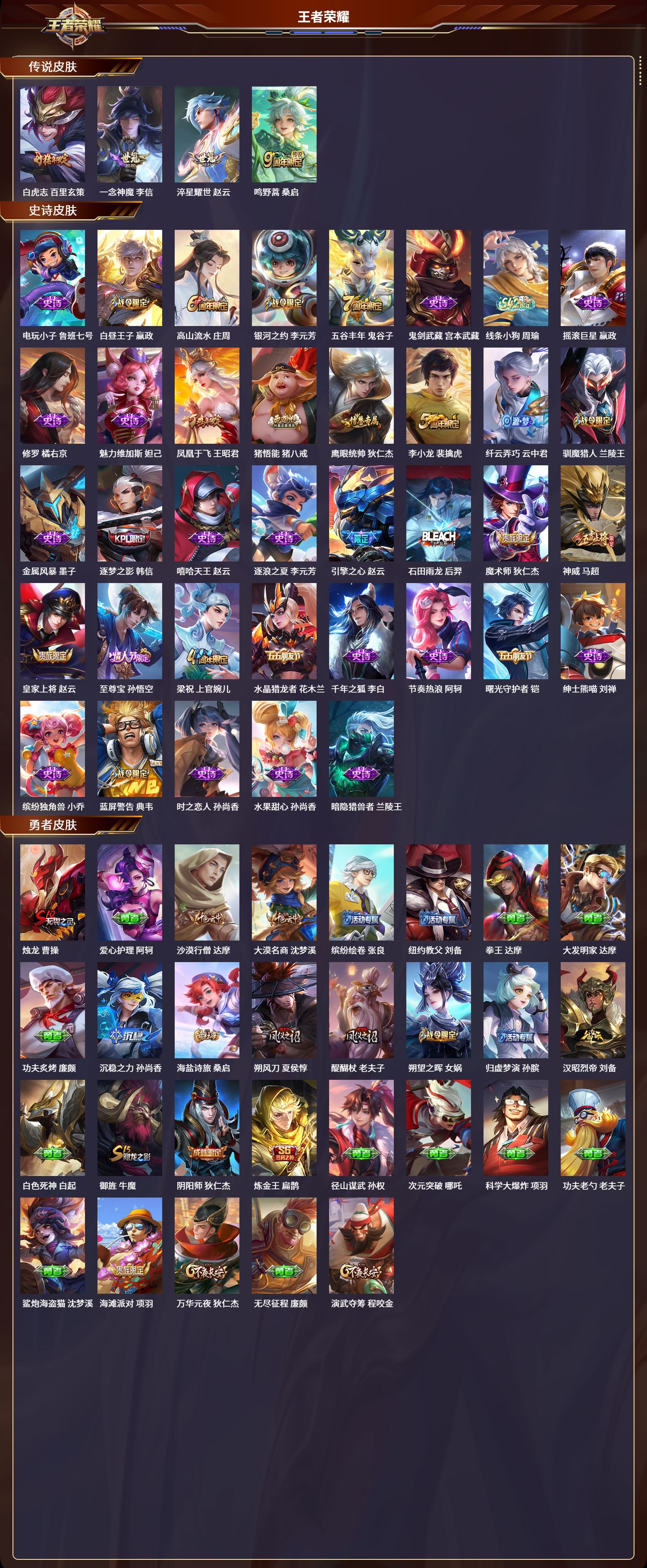 【37,史诗皮肤】电玩小子,鲁班七号,白昼王子,嬴政,高山流水,庄周,银河之约,李元芳,五谷丰年,鬼谷子,鬼剑武藏,宫本武藏,线条小狗,周瑜,摇滚巨星,嬴政,修罗,橘右京,魅力维加斯,妲己,凤凰于飞,王昭君,猪悟能,猪八戒,鹰眼统帅,狄仁杰,李小龙,裴擒虎,纤云弄巧,云中君,驯魔猎人,兰陵王,金属风暴,墨子,逐梦之影,韩信,嘻哈天王,赵云,逐浪之夏,李元芳,引擎之心,赵云,石田雨龙,后羿,魔术师,狄仁杰,神威,马超,皇家上将,赵云,至尊宝,孙悟空,梁祝,上官婉儿,水晶猎龙者,花木兰,千年之狐,李白,节奏热浪,阿轲,曙光守护者,铠,绅士熊喵,刘禅,缤纷独角兽,小乔,蓝屏警告,典韦,时之恋人,孙尚香,水果甜心,孙尚香,暗隐猎兽者,兰陵王,