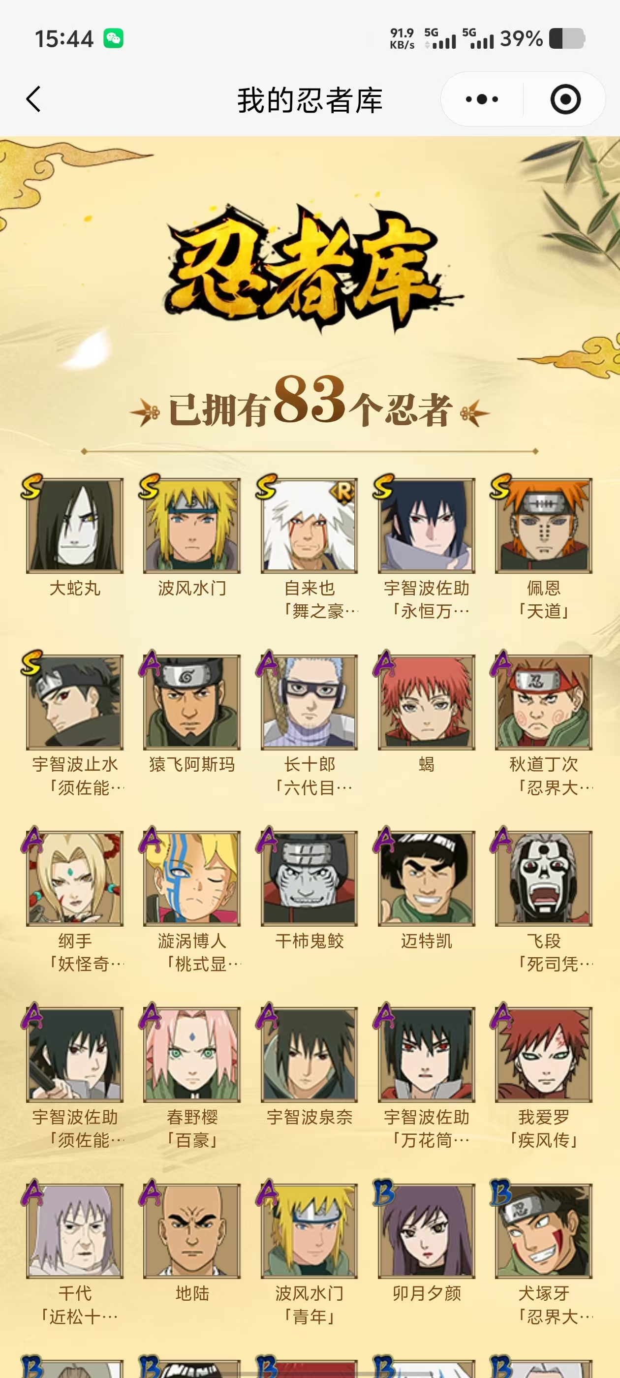 【A忍者】,纲手「妖怪奇谭」,长十郎「六代目水影」,漩涡博人「桃式显现」,宇智波泉奈,波风水门「青年」,宇智波佐助「须佐能乎」,千代「近松十人卫」,地陆,秋道丁次「忍界大战」,春野樱「百豪」,宇智波佐助「万花筒写轮眼」,飞段「死司凭血」,我爱罗「疾风传」,蝎,干柿鬼鲛,猿飞阿斯玛,迈特凯,
