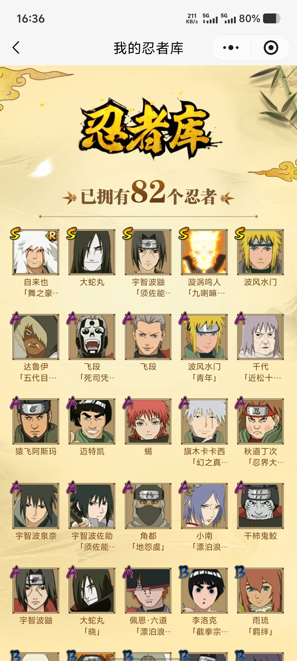 【A忍者】,佩恩·六道「漂泊浪客」,旗木卡卡西「幻之真容」,小南「漂泊浪客」,宇智波泉奈,达鲁伊「五代目雷影」,波风水门「青年」,宇智波佐助「须佐能乎」,千代「近松十人卫」,秋道丁次「忍界大战」,大蛇丸「晓」,角都「地怨虞」,飞段「死司凭血」,飞段,蝎,干柿鬼鲛,宇智波鼬,猿飞阿斯玛,迈特凯,
