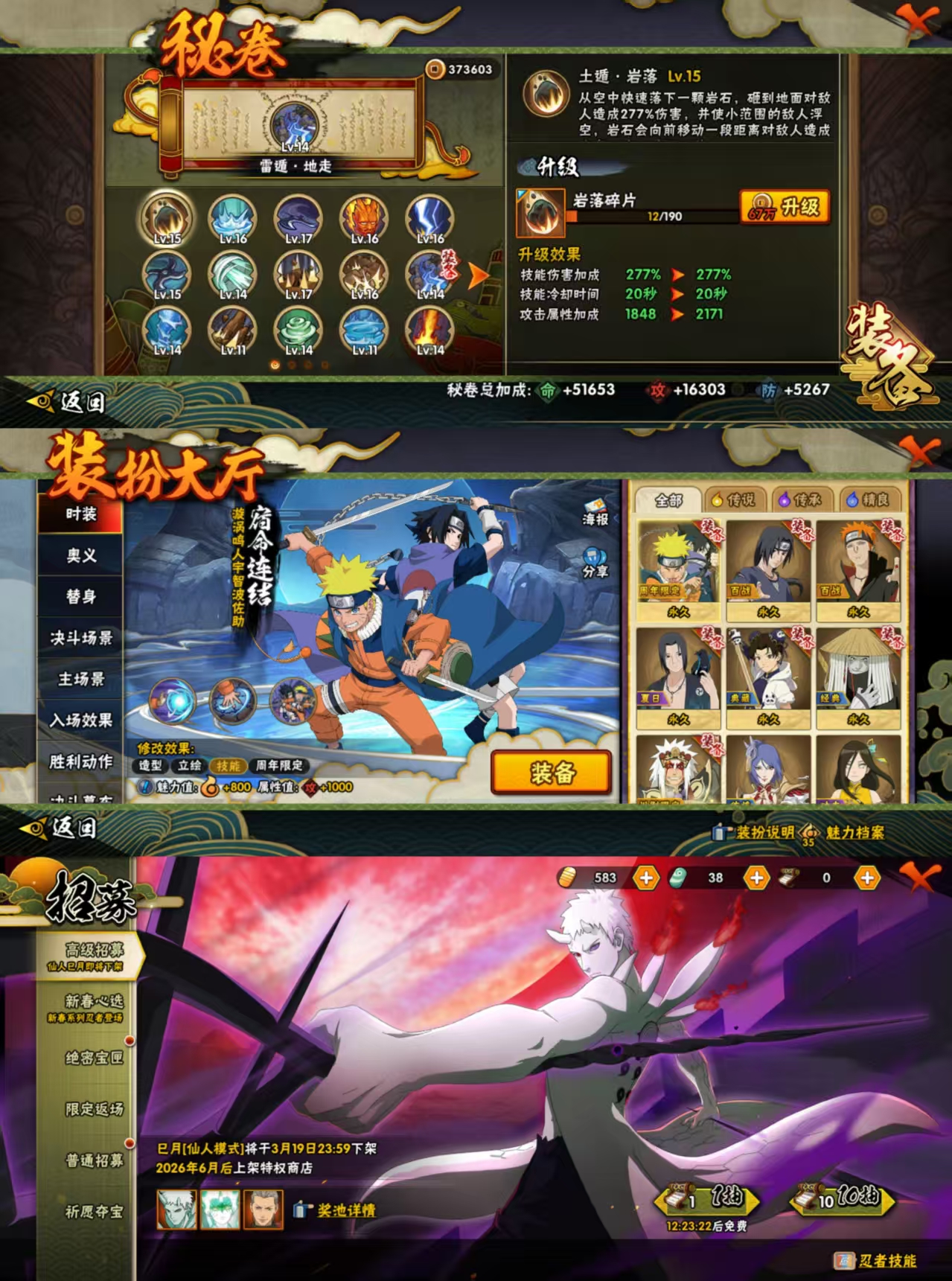 【S忍者】,宇智波佐助「漩涡鸣人」,宇智波斑「秽土转生·解」,宇智波佐助「永恒万花筒」,自来也「舞之豪杰」,旗木卡卡西「须佐能乎」,宇智波斑「白面具」,千手扉间「秽土转生」,宇智波鼬「须佐能乎」,佩恩「天道」,波风水门,波风水门「九喇嘛连结」,