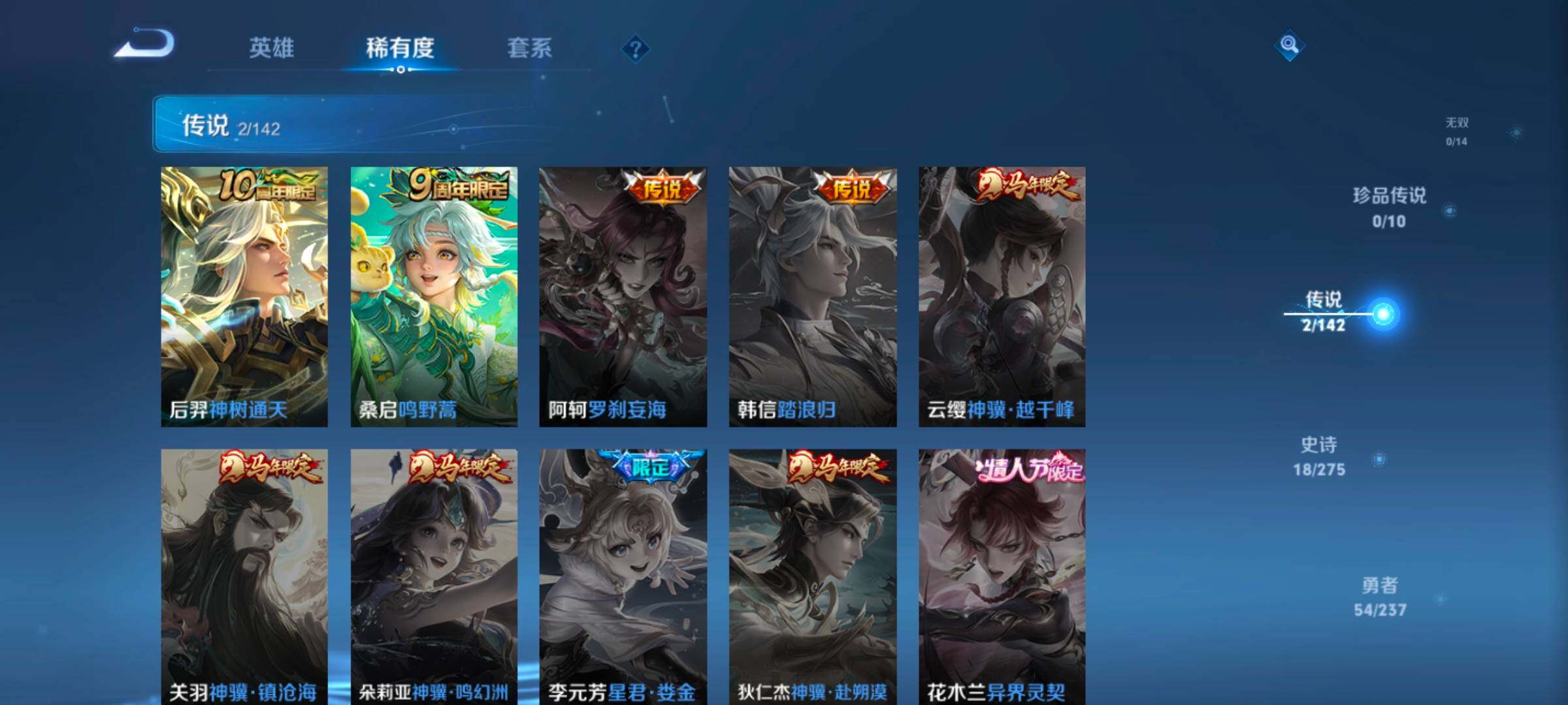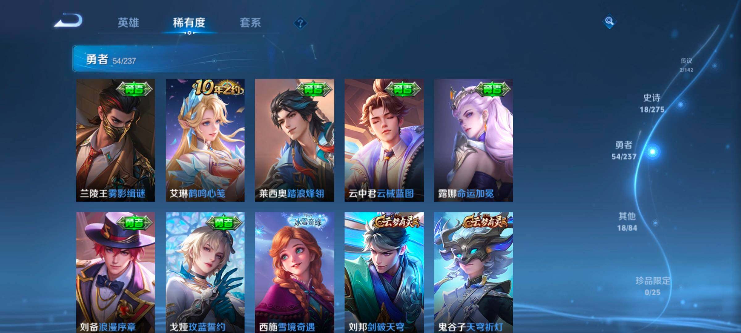 【限定皮肤】:狄仁杰阴阳师,孙尚香蔷薇恋人,高渐离死亡摇滚,狄仁杰万华元夜,达摩沙漠行僧,老夫子醍醐杖,程咬金演武夺筹,兰陵王金庭之子,李元芳云中旅人,钟馗驱傩正仪,鬼谷子原初探秘者,苏烈千军破阵,弈星混沌棋,沈梦溪大漠名商,明世隐疑决卦,裴擒虎李小龙,鲁班大师探海日志,桑启海盐诗旅,鬼谷子天穹祈灯,刘邦剑破天穹