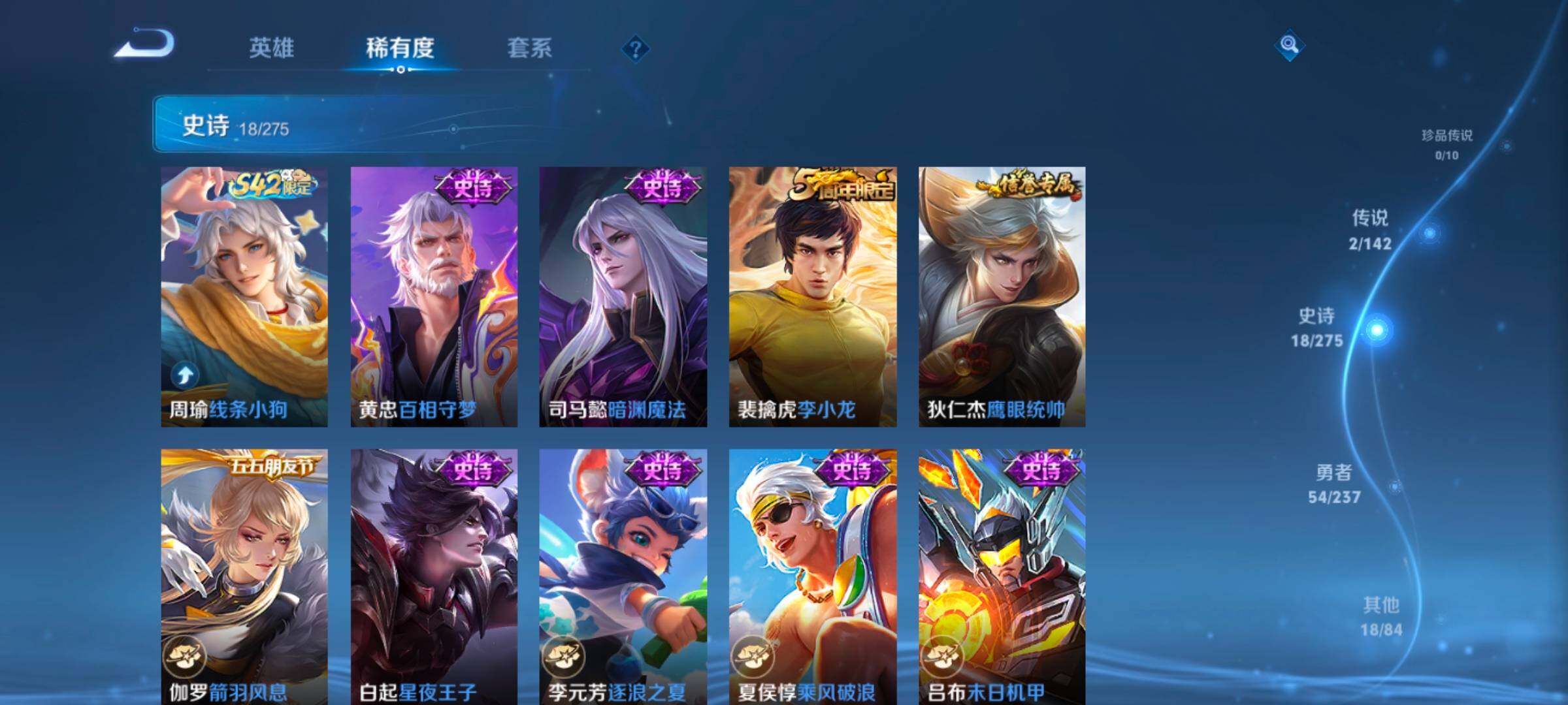 【史诗皮肤】:周瑜线条小狗,黄忠百相守梦,司马懿暗渊魔法,裴擒虎李小龙,狄仁杰鹰眼统帅,伽罗箭羽风息,白起星夜王子,李元芳逐浪之夏,夏侯惇乘风破浪,吕布末日机甲,曹操幽灵船长,吕布圣诞狂欢,妲己魅力维加斯,孙尚香水果甜心,孙尚香蔷薇恋人,宫本武藏鬼剑武藏,貂蝉圣诞恋歌,赵云未来纪元