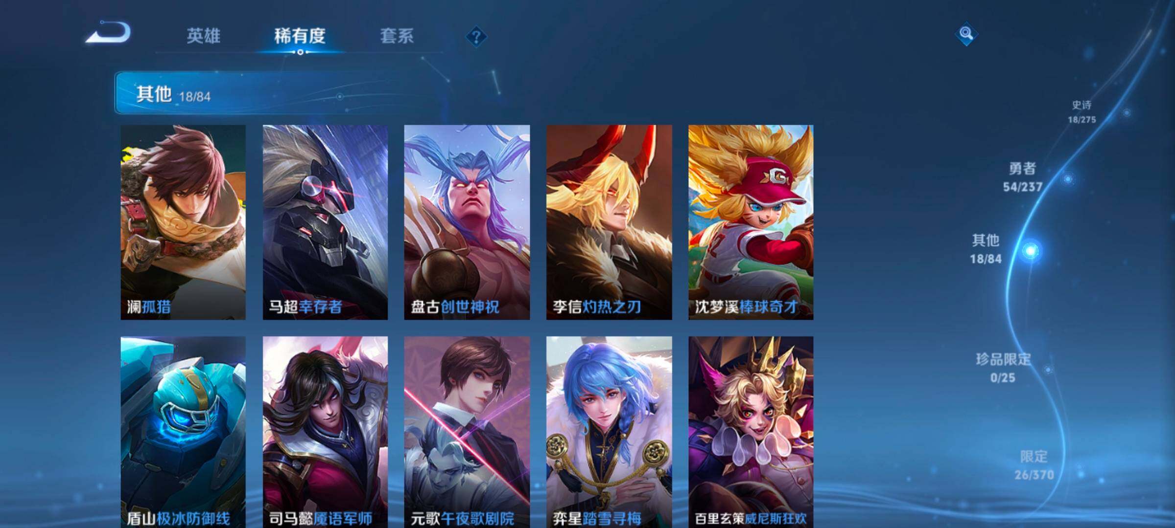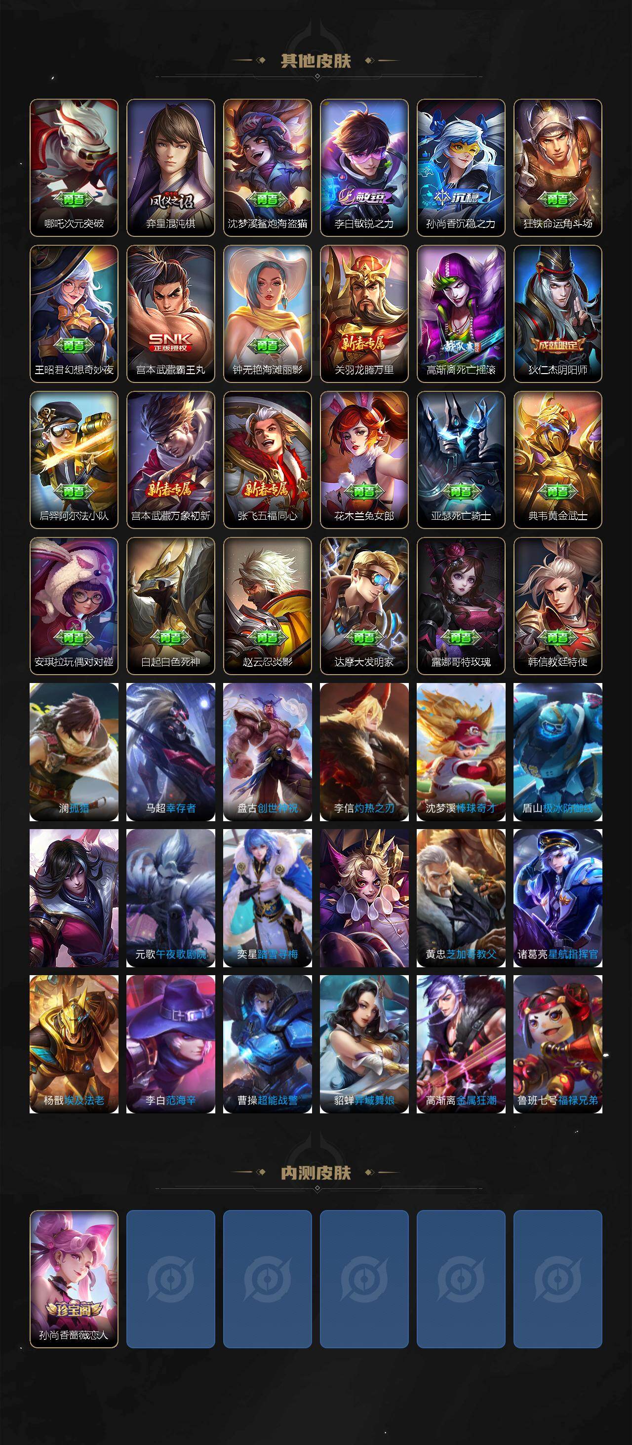 【其他皮肤】:兰陵王雾影缉谜,艾琳鹤鸣心笺,莱西奥踏浪烽翎,云中君云械蓝图,露娜命运加冕,刘备浪漫序章,戈娅玫蓝誓约,西施雪境奇遇,刘邦剑破天穹,鬼谷子天穹祈灯,后羿完美运算,姬小满零食大作战,鲁班大师探海日志,桑启海盐诗旅,李元芳云中旅人,沈梦溪大漠名商,兰陵王金庭之子,刘邦虎啸剑宗,程咬金无双福将,达摩沙漠行僧,苏烈千军破阵,鲁班大师乓乓大师,钟馗驱傩正仪,张良缤纷绘卷,程咬金演武夺筹,杨戬次元傲视,狄仁杰万华元夜,鬼谷子原初探秘者,老夫子醍醐杖,明世隐疑决卦,哪吒次元突破,弈星混沌棋,沈梦溪鲨炮海盗猫,李白敏锐之力,孙尚香沉稳之力,狂铁命运角斗场,王昭君幻想奇妙夜,宫本武藏霸王丸,钟无艳海滩丽影,关羽龙腾万里,高渐离死亡摇滚,狄仁杰阴阳师,后羿阿尔法小队,宫本武藏万象初新,张飞五福同心,花木兰兔女郎,亚瑟死亡骑士,典韦黄金武士,安琪拉玩偶对对碰,白起白色死神,赵云忍炎影,达摩大发明家,露娜哥特玫瑰,韩信教廷特使,澜孤猎,马超幸存者,盘古创世神祝,李信灼热之刃,沈梦溪棒球奇才,盾山极冰防御线,司马懿魇语军师,元歌午夜歌剧院,弈星踏雪寻梅,百里玄策威尼斯狂欢,黄