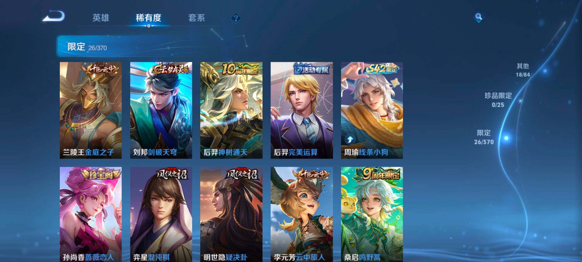 【赛季限定】:弈星混沌棋,明世隐疑决卦,老夫子醍醐杖,鬼谷子原初探秘者,狄仁杰万华元夜,程咬金演武夺筹,钟馗驱傩正仪,苏烈千军破阵,达摩沙漠行僧,兰陵王金庭之子,沈梦溪大漠名商,李元芳云中旅人,桑启海盐诗旅,鲁班大师探海日志,鬼谷子天穹祈灯,刘邦剑破天穹