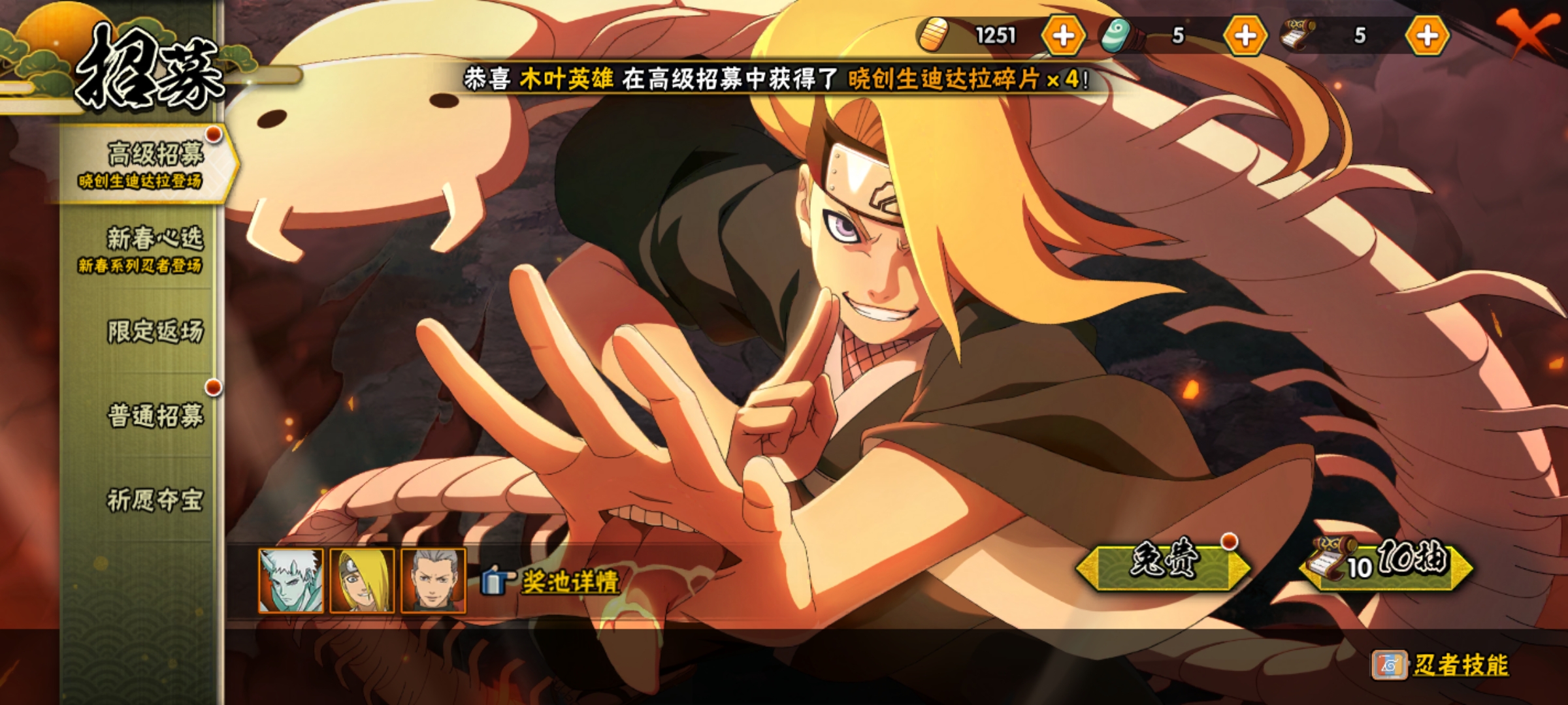 【A忍者】,小南「神驹佑将」,大野木「侠隐江湖」,巳月「仙人模式」,迈特凯「青春爆炸」,长十郎「六代目水影」,不缘,日向宁次「忍界大战」,漩涡博人「桃式显现」,李洛克「忍界大战」,蝎「绯流琥」,宇智波泉奈,长门「青年」,艾「青年」,波风水门「青年」,迪达拉「秽土转生」,千代「近松十人卫」,秋道丁次「忍界大战」,照美冥「五代目水影」,飞段「死司凭血」,飞段,迪达拉,我爱罗「疾风传」,蝎,干柿鬼鲛,猿飞阿斯玛,迈特凯,卑留呼「火之意志继承者」,