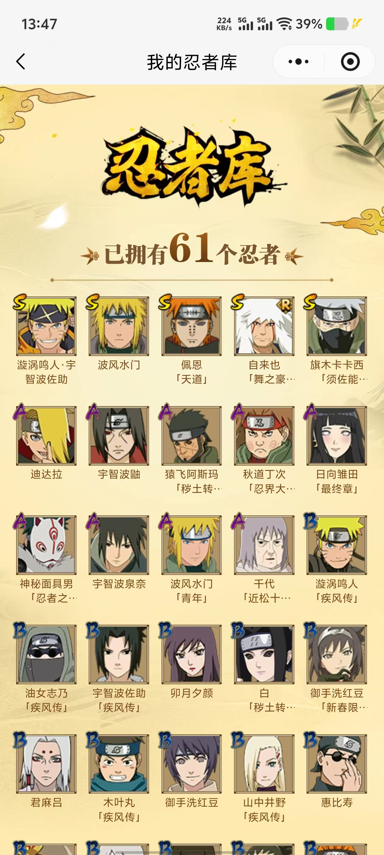 PX_2531247-5S忍/9A忍/战力203W/V1/区服3822 【S忍者】,宇智波佐助「漩涡鸣人」,自来也「舞之豪杰」,旗木卡卡西「须佐能乎」,佩恩「天道」,波风水门, 【A忍者】,日向雏田「最终章」,宇智波泉奈,神秘面具男「忍者之路」,波风水门「青年」,千代「近松十人卫」,秋道丁次「忍界大战」,猿飞阿斯玛「秽土转生」,迪达拉,宇智波鼬,