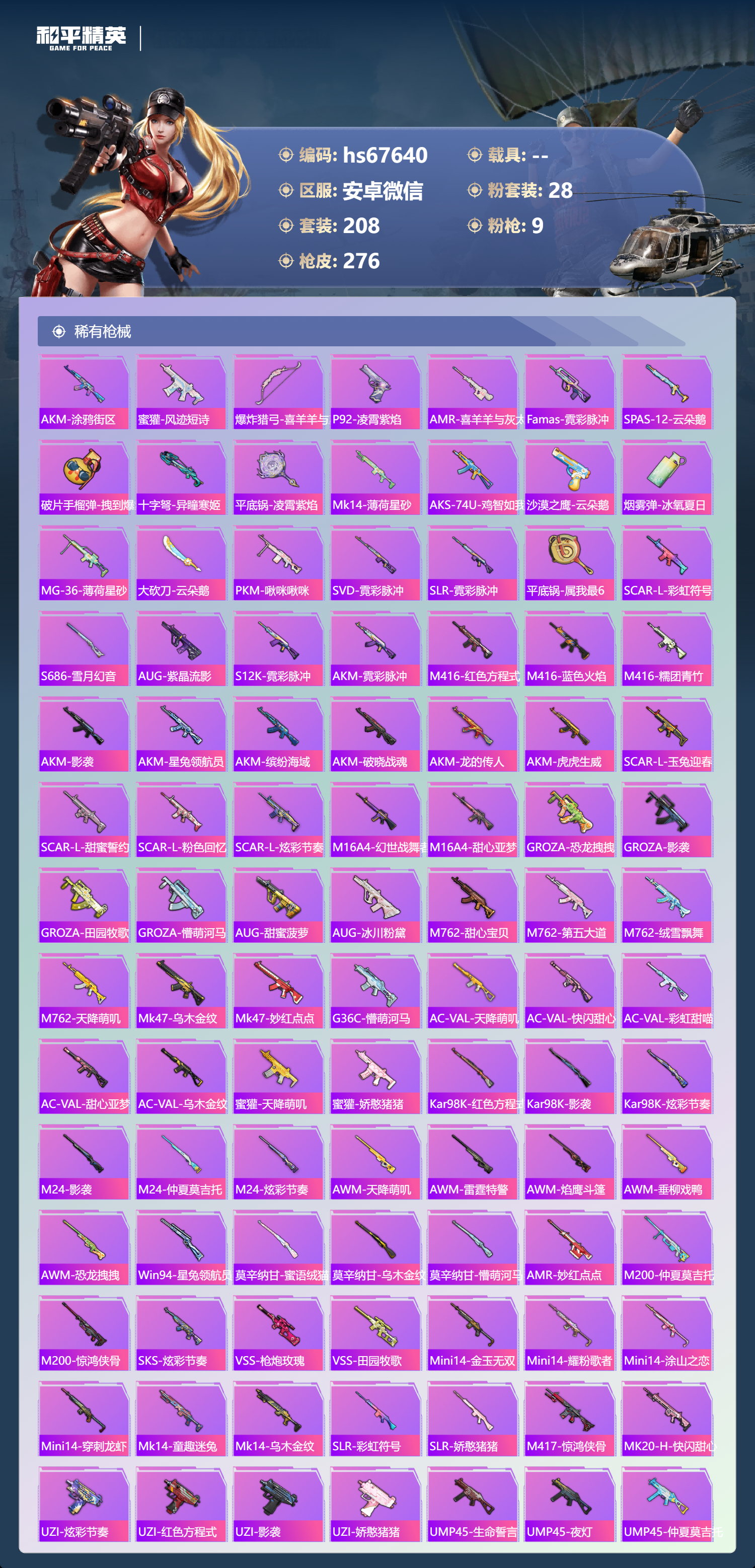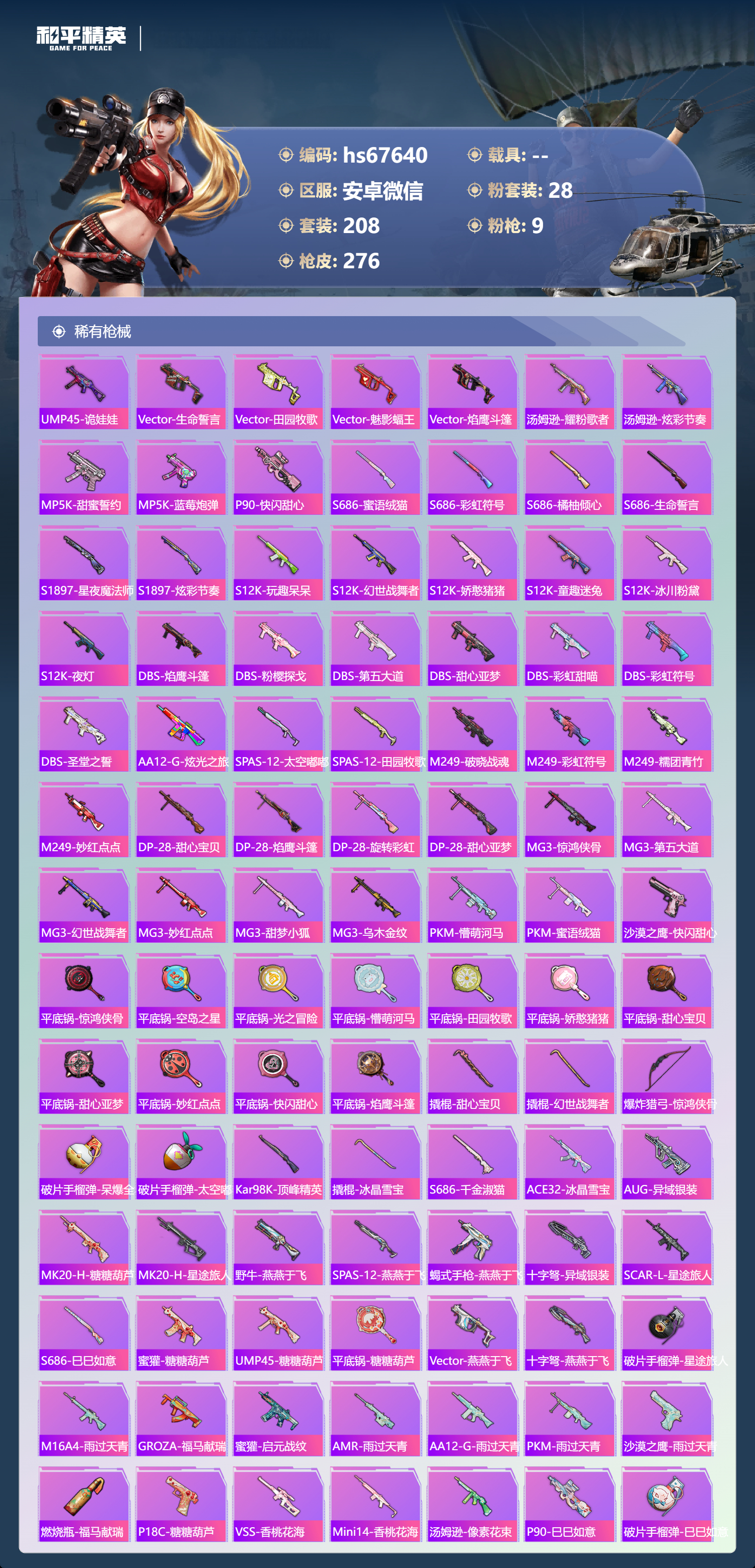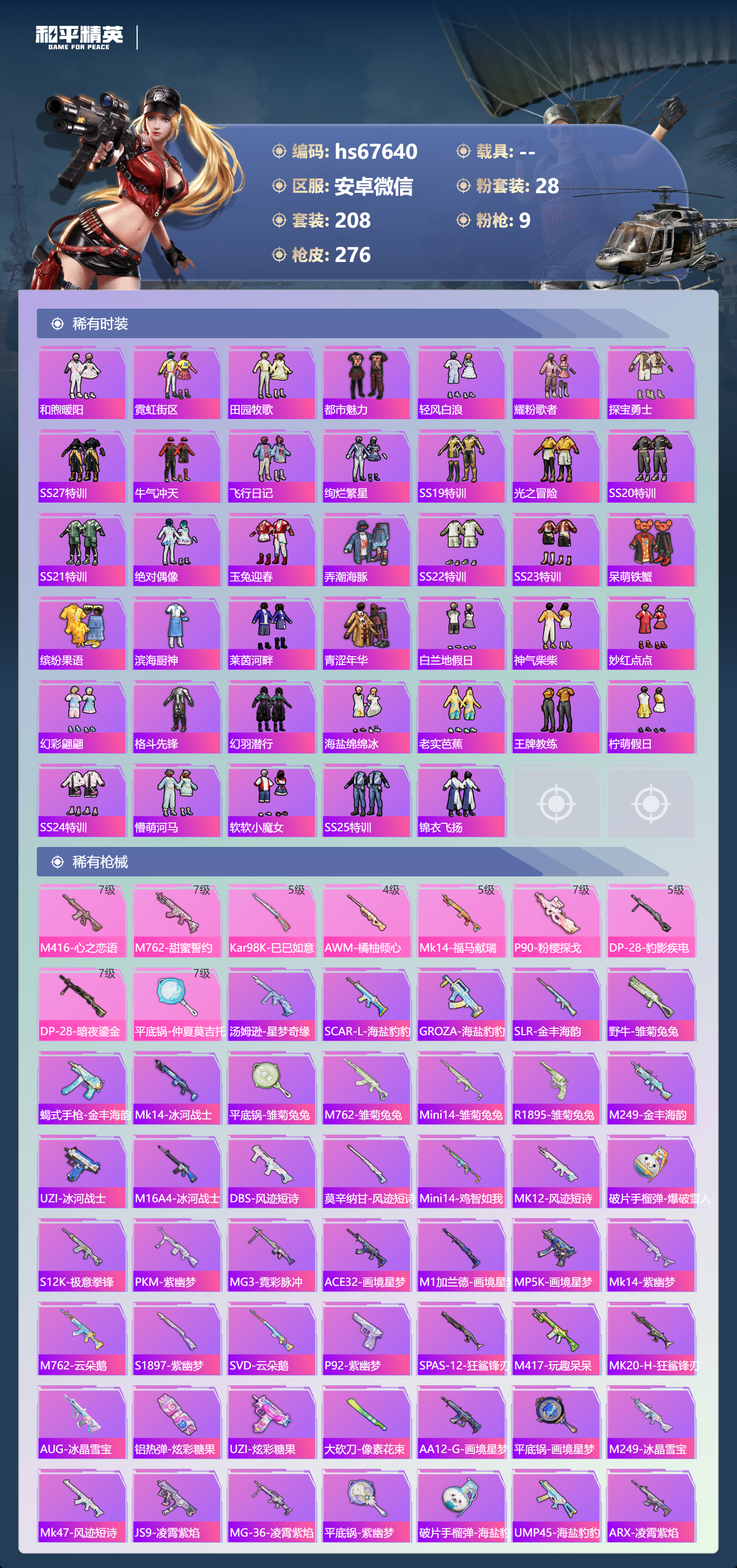 PX_2535538-,安卓微信-19王牌印记-28粉装-9特效枪-95427热力值-208套装-276枪皮-7卓越印记-1传奇印记