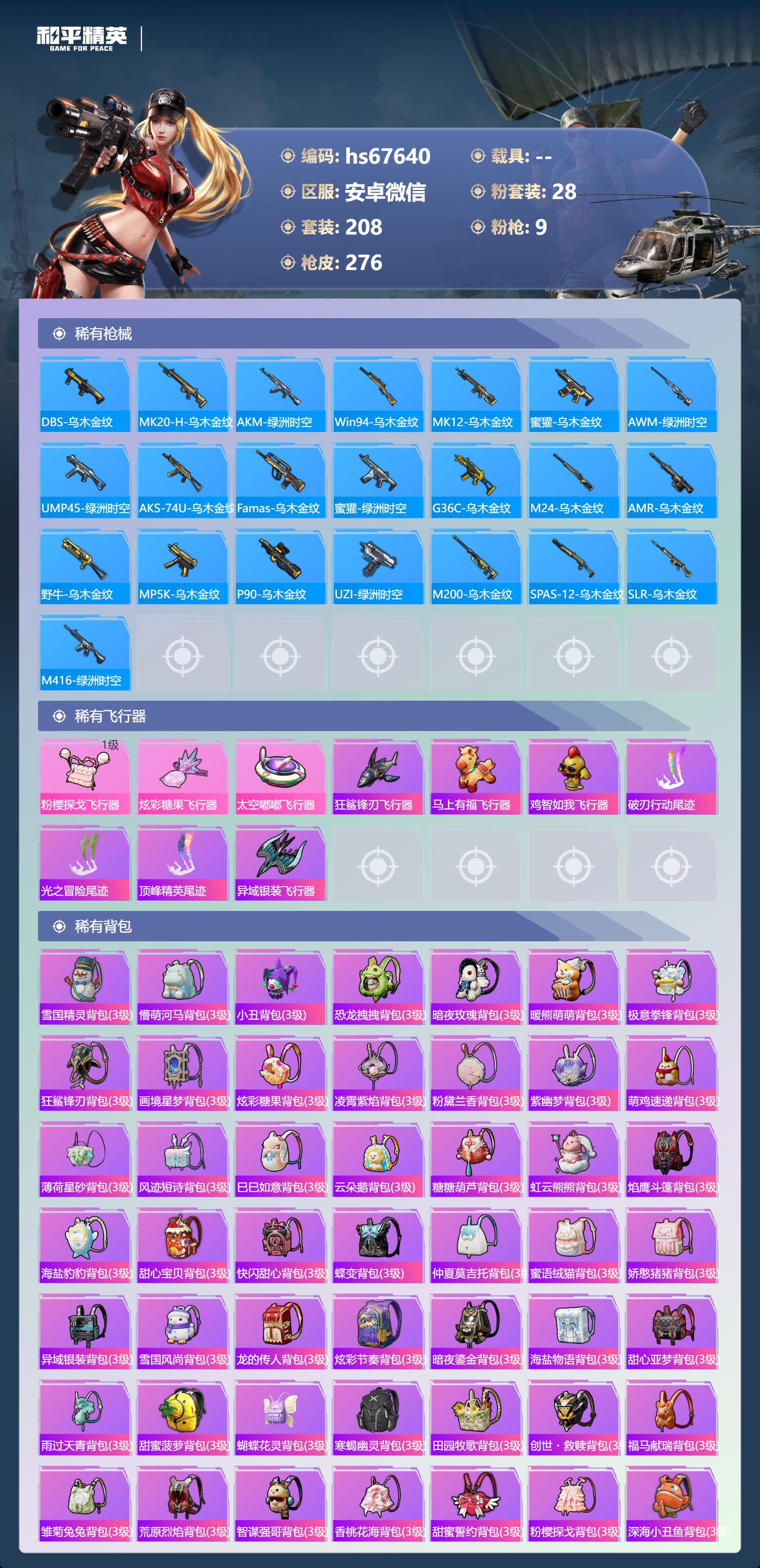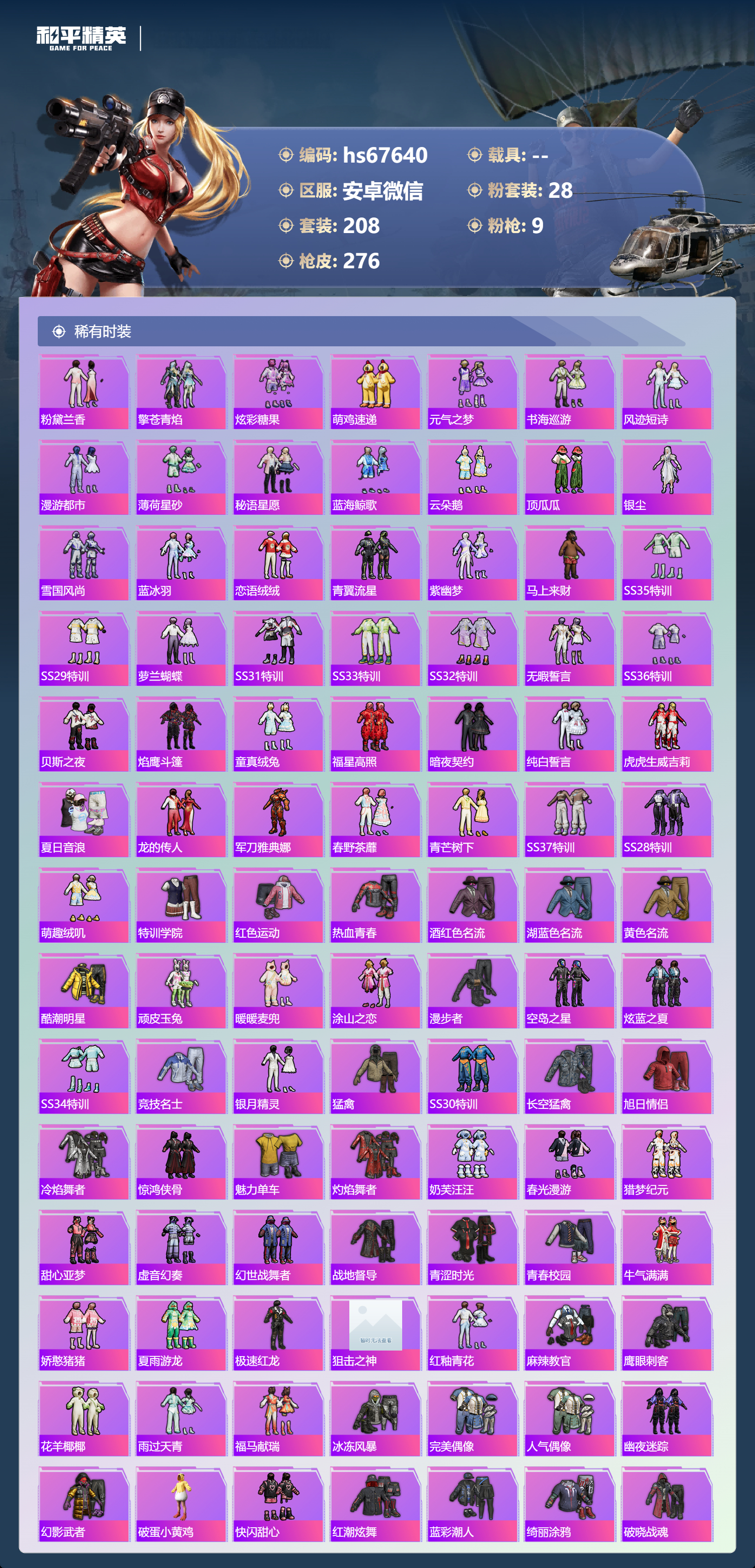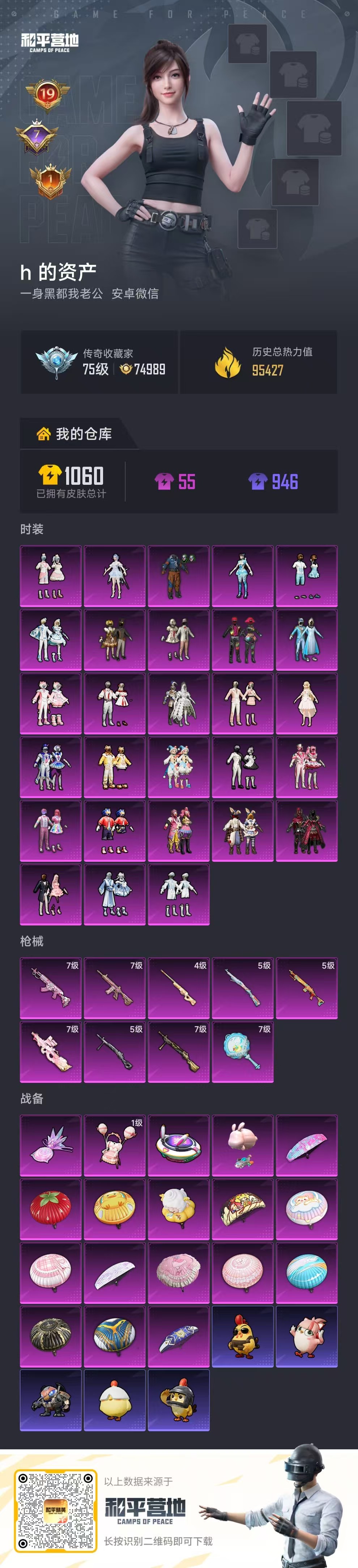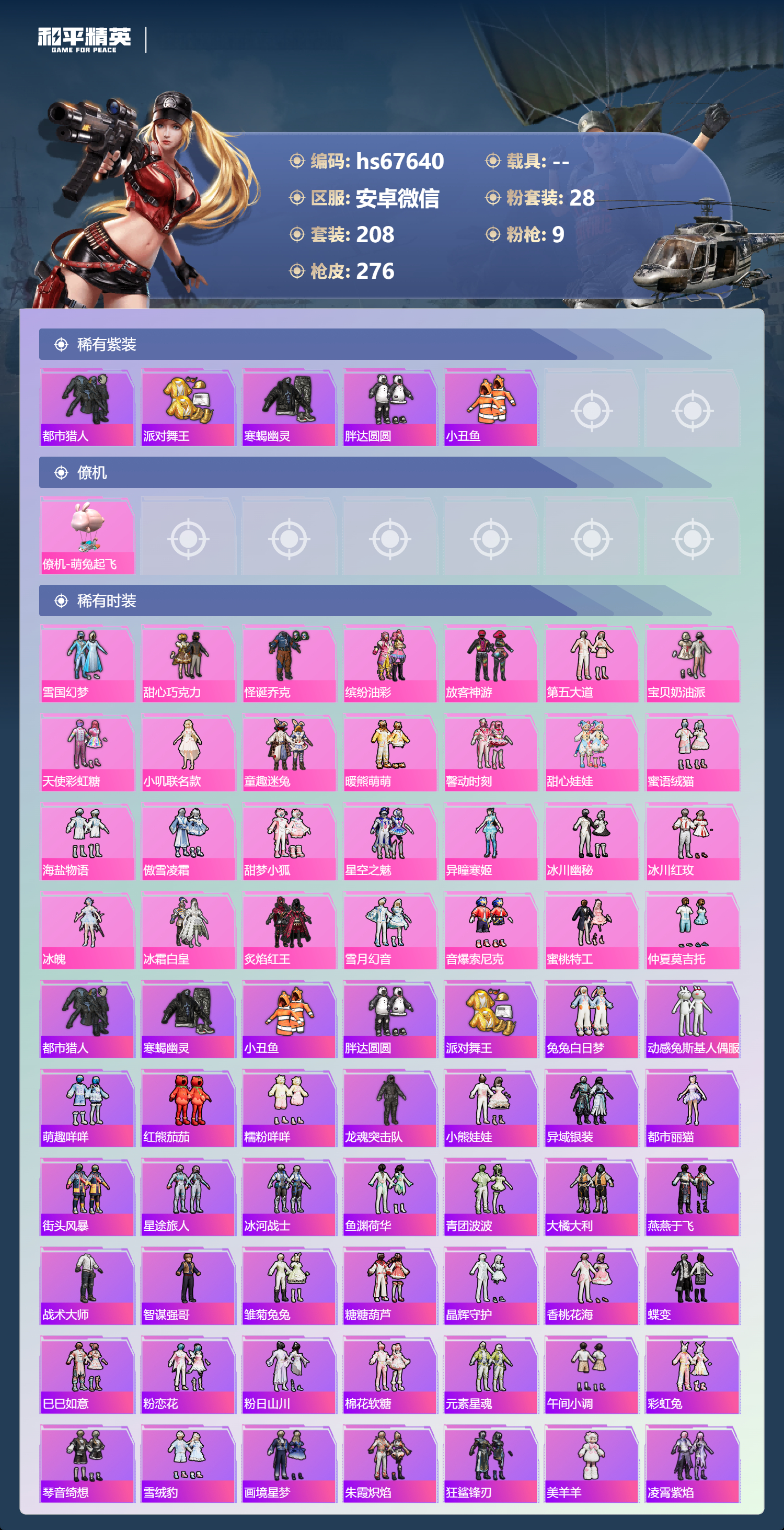 PX_2535538-,安卓微信-19王牌印记-28粉装-9特效枪-95427热力值-208套装-276枪皮-7卓越印记-1传奇印记