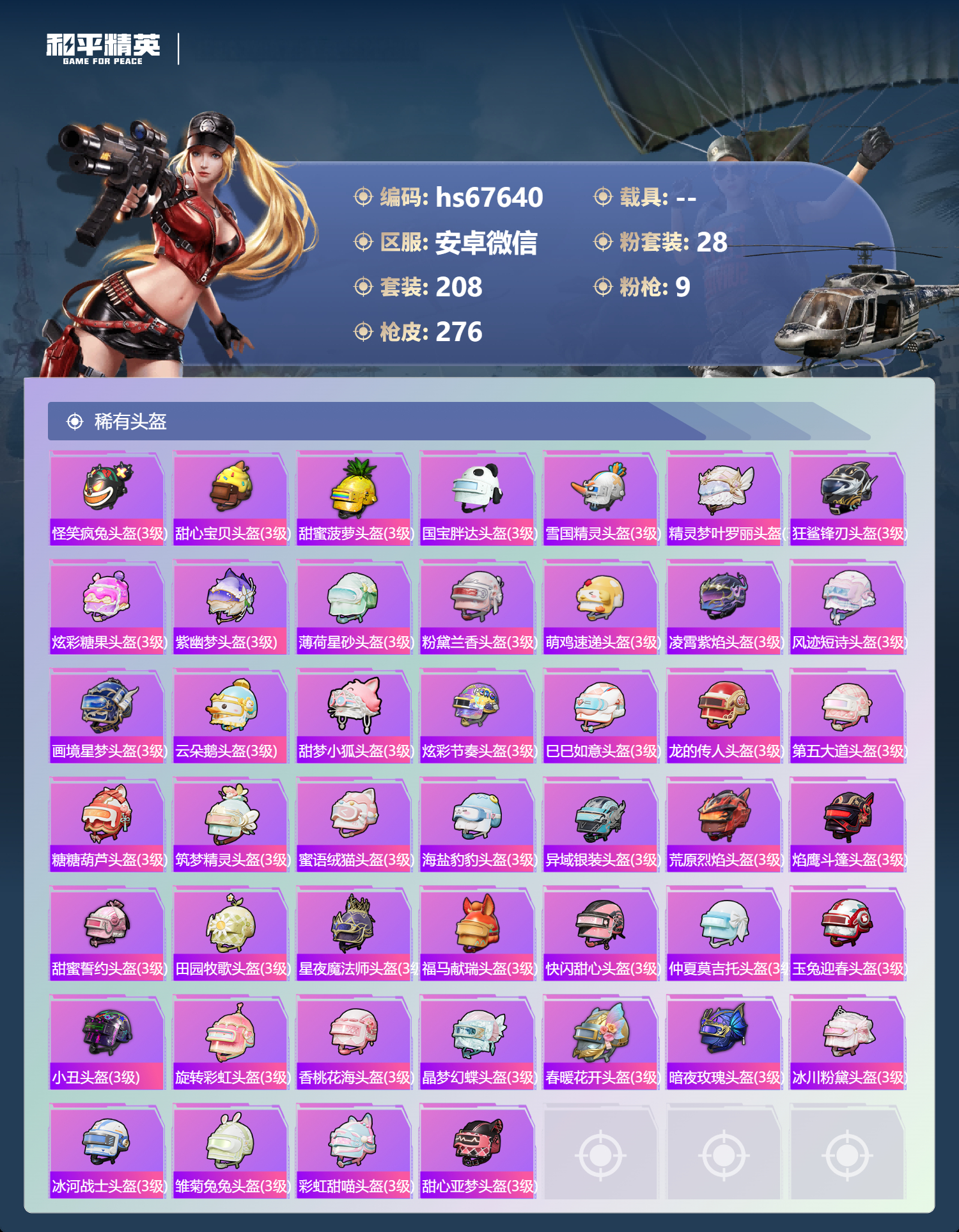 【46稀有头盔】怪笑疯兔头盔(3级),甜心宝贝头盔(3级),甜蜜菠萝头盔(3级),国宝胖达头盔(3级),雪国精灵头盔(3级),精灵梦叶罗丽头盔(3级),狂鲨锋刃头盔(3级),炫彩糖果头盔(3级),紫幽梦头盔(3级),薄荷星砂头盔(3级),粉黛兰香头盔(3级),萌鸡速递头盔(3级),凌霄紫焰头盔(3级),风迹短诗头盔(3级),画境星梦头盔(3级),云朵鹅头盔(3级),甜梦小狐头盔(3级),炫彩节奏头盔(3级),巳巳如意头盔(3级),龙的传人头盔(3级),第五大道头盔(3级),糖糖葫芦头盔(3级),筑梦精灵头盔(3级),蜜语绒猫头盔(3级),海盐豹豹头盔(3级),异域银装头盔(3级),荒原烈焰头盔(3级),焰鹰斗篷头盔(3级),甜蜜誓约头盔(3级),田园牧歌头盔(3级),星夜魔法师头盔(3级),福马献瑞头盔(3级),快闪甜心头盔(3级),仲夏莫吉托头盔(3级),玉兔迎春头盔(3级),小丑头盔(3级),旋转彩虹头盔(3级),香桃花海头盔(3级),晶梦幻蝶头盔(3级),春暖花开头盔(3级),暗夜玫瑰头盔(3级),冰川粉黛头盔(3级),冰河战士头盔(3级),雏菊兔兔头盔(3级),彩虹甜喵头盔(3级),甜心亚梦头盔(3级)