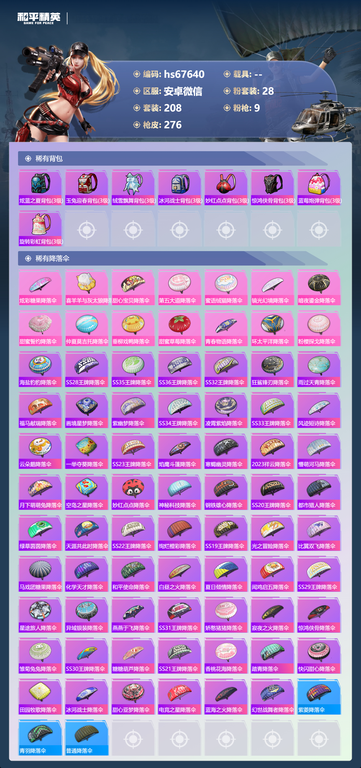 【79稀有降落伞】海盐豹豹降落伞,SS28王牌降落伞,SS35王牌降落伞,SS36王牌降落伞,SS32王牌降落伞,炫彩糖果降落伞,狂鲨锋刃降落伞,雨过天青降落伞,福马献瑞降落伞,画境星梦降落伞,紫幽梦降落伞,SS34王牌降落伞,喜羊羊与灰太狼降落伞,凌霄紫焰降落伞,SS33王牌降落伞,风迹短诗降落伞,云朵鹅降落伞,一举夺葵降落伞,SS23王牌降落伞,焰鹰斗篷降落伞,寒蝎幽灵降落伞,2023祥云降落伞,懵萌河马降落伞,月下萌萌兔降落伞,甜心宝贝降落伞,空岛之星降落伞,第五大道降落伞,紫菱降落伞,妙红点点降落伞,神秘科技降落伞,钢铁雄心降落伞,SS20王牌降落伞,都市猎人降落伞,绿草茵茵降落伞,青羽降落伞,天涯共此时降落伞,SS22王牌降落伞,绚烂橙彩降落伞,SS19王牌降落伞,光之冒险降落伞,普通降落伞,比翼双飞降落伞,马戏团糖果降落伞,化学天才降落伞,和平使命降落伞,白昼之火降落伞,夏日倾情降落伞,蜜语绒猫降落伞,镜光幻境降落伞,暗夜鎏金降落伞,甜蜜誓约降落伞,闻鸡启五降落伞,SS29王牌降落伞,星途旅人降落伞,异域银装降落伞,燕燕于飞降落伞,SS31王牌降落伞,娇憨猪猪降落伞,寂夜之火降落伞,惊鸿侠骨降落伞,仲夏莫吉托降落伞,垂柳戏鸭降落伞,雏菊兔兔降落伞,甜蜜草莓降落伞,青春物语降落伞,SS30王牌降落伞,糖糖葫芦降落伞,SS21王牌降落伞,香桃花海降落伞,踏青降落伞,快闪甜心降落伞,环太平洋降落伞,田园牧歌降落伞,冰河战士降落伞,甜心亚梦降落伞,电竞之星降落伞,粉樱探戈降落伞,蓝海之火降落伞,幻世战舞者降落伞