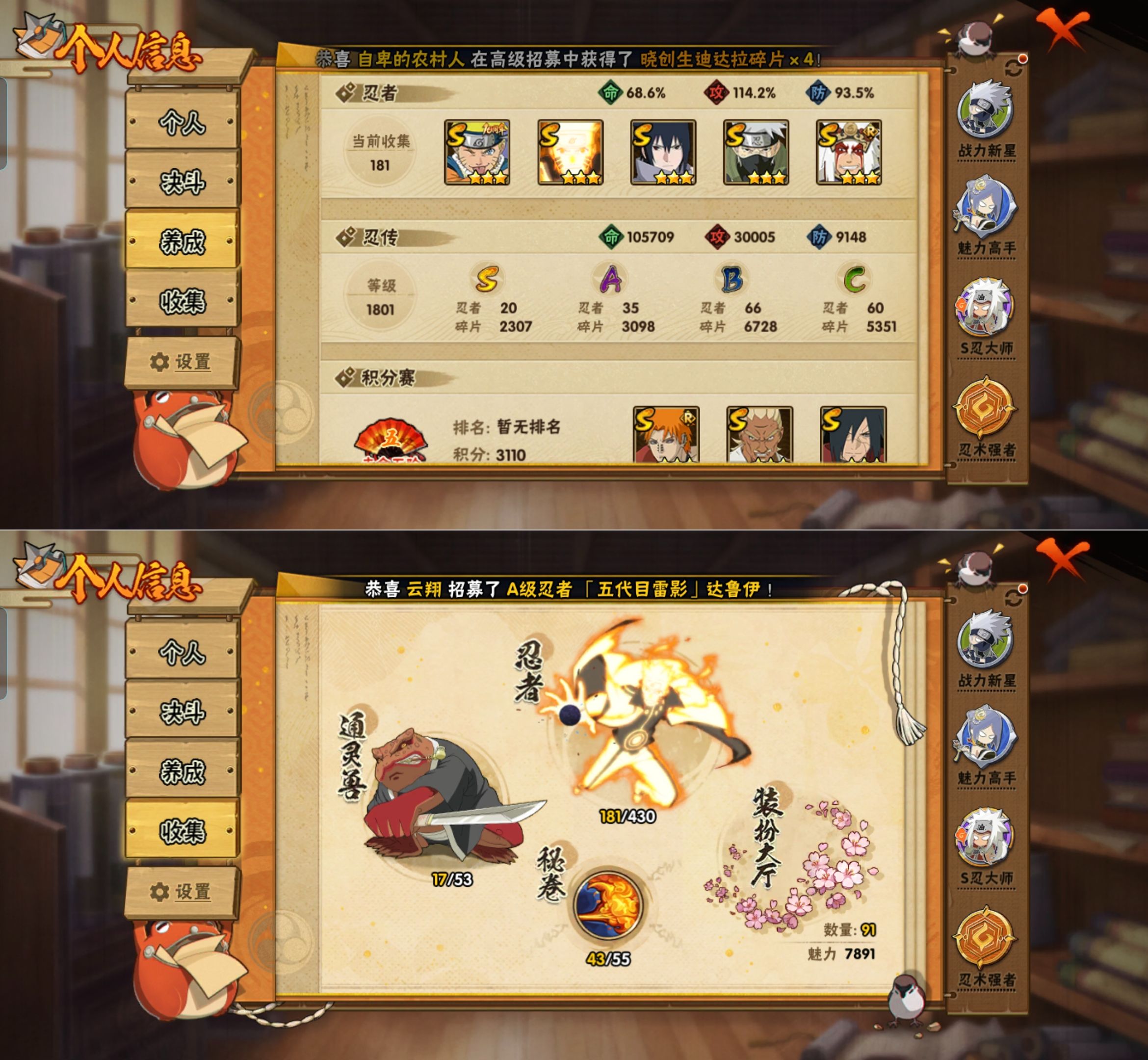 PX_2535579-不可二次包,安卓Q【区服】2912【等级】144【S级数量】20【A级数量】35【B级数量】66【C级数量】60【S级】漩涡鸣人·宇智波佐助,自来也「传说中的三忍」,宇智波斑「神驹佑将」,千手柱间「木叶创立」,波风水门,艾「忍界大战」,自来也「舞之豪杰」,佩恩「天道」,宇智波鼬「须佐能乎」,大蛇丸,宇智波带土「忍界大战」,漩涡鸣人「九喇嘛连结」,迈特凯「死门」,宇智波佐助「永恒万花筒」,