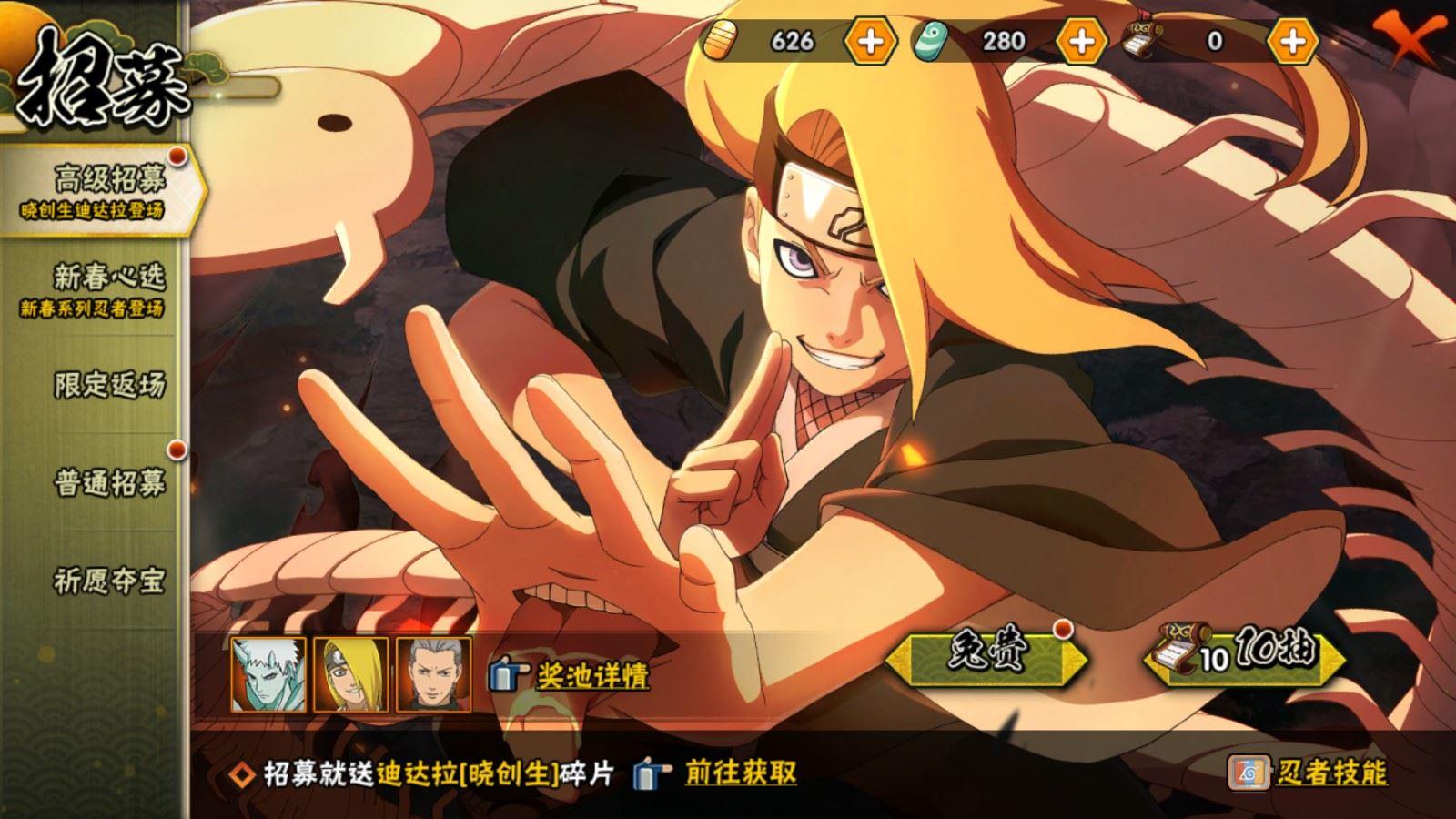 【A忍者】,佩恩·六道「漂泊浪客」,小南「神驹佑将」,旗木卡卡西「神威对决」,机械鸣人「初始形态」,大野木「侠隐江湖」,纲手「妖怪奇谭」,迈特凯「青春爆炸」,土台「忍界大战」,日向宁次「忍界大战」,漩涡博人「桃式显现」,李洛克「忍界大战」,蝎「绯流琥」,宇智波泉奈,桃地再不斩「秽土转生」,角都「秽土转生」,长门「青年」,神秘面具男「忍者之路」,波风水门「青年」,宇智波佐助「须佐能乎」,加藤断,小南「新春限定」,漩涡鸣人「九尾查克拉」,千代「近松十人卫」,秋道丁次「忍界大战」,大蛇丸「晓」,春野樱「百豪」,宇智波佐助「万花筒写轮眼」,飞段「死司凭血」,飞段,迪达拉,我爱罗「疾风传」,蝎,干柿鬼鲛,宇智波鼬,猿飞阿斯玛,迈特凯,
