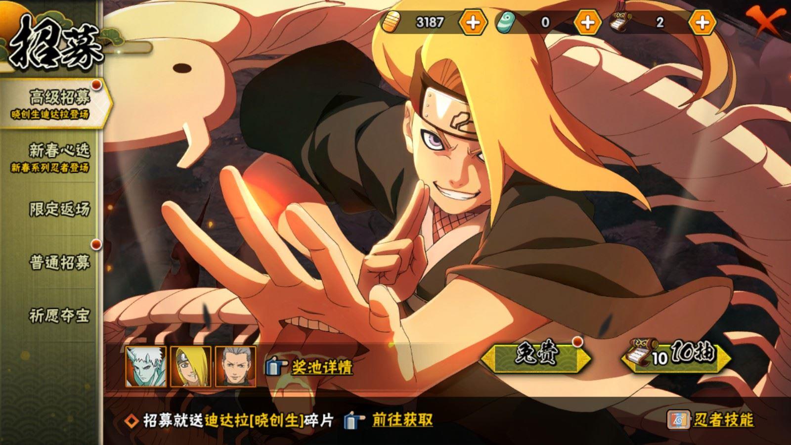 【A忍者】,宇智波带土「漂泊浪客」,小南「神驹佑将」,迈特凯「青春爆炸」,漩涡博人「桃式显现」,旗木卡卡西「幻之真容」,宇智波泉奈,长门「青年」,艾「青年」,达鲁伊「五代目雷影」,神秘面具男「忍者之路」,波风水门「青年」,宇智波佐助「须佐能乎」,迪达拉「秽土转生」,漩涡鸣人「九尾查克拉」,千代「近松十人卫」,秋道丁次「忍界大战」,大蛇丸「晓」,春野樱「百豪」,宇智波佐助「万花筒写轮眼」,飞段「死司凭血」,飞段,我爱罗「疾风传」,蝎,干柿鬼鲛,宇智波鼬,猿飞阿斯玛,迈特凯,