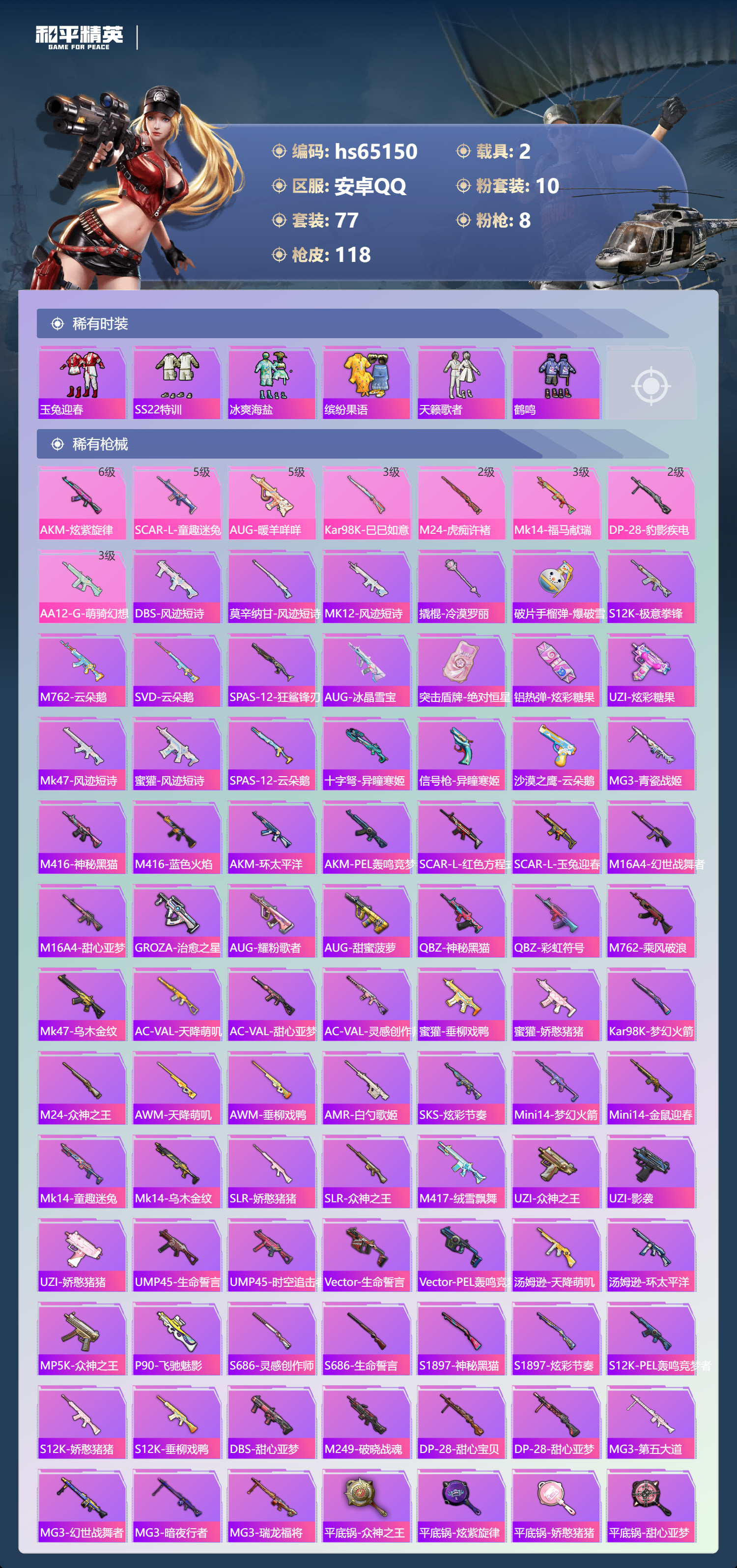 【118稀有枪械】AKM-炫紫旋律/6级,SCAR-L-童趣迷兔/5级,AUG-暖羊咩咩/5级,Kar98K-巳巳如意/3级,M24-虎痴许褚/2级,Mk14-福马献瑞/3级,DP-28-豹影疾电/2级,AA12-G-萌骑幻想/3级,DBS-风迹短诗,莫辛纳甘-风迹短诗,Win94-乌木金纹,MK12-风迹短诗,MK12-乌木金纹,撬棍-冷漠罗丽,破片手榴弹-爆破雪人,S12K-极意拳锋,M762-云朵鹅,SVD-云朵鹅,SPAS-12-狂鲨锋刃,AUG-冰晶雪宝,突击盾牌-绝对恒星,铝热弹-炫彩糖果,UZI-炫彩糖果,Mk47-风迹短诗,蜜獾-风迹短诗,Famas-乌木金纹,SPAS-12-云朵鹅,十字弩-异瞳寒姬,信号枪-异瞳寒姬,沙漠之鹰-云朵鹅,MG3-青瓷战姬,M416-神秘黑猫,M416-乌木金纹,M416-蓝色火焰,AKM-环太平洋,AKM-PEL轰鸣竞梦者,SCAR-L-红色方程式,SCAR-L-玉兔迎春,M16A4-幻世战舞者,M16A4-甜心亚梦,GROZA-治愈之星,AUG-耀粉歌者,AUG-甜蜜菠萝,QBZ-神秘黑猫,QBZ-乌木金纹,QBZ-彩虹符号,M762-乘风破浪,Mk47-乌木金纹,AC-VAL-天降萌叽,AC-VAL-甜心亚梦,AC-VAL-灵感创作师,蜜獾-垂柳戏鸭,蜜獾-娇憨猪猪,Kar98K-梦幻火箭,M24-众神之王,AWM-天降萌叽,AWM-垂柳戏鸭,AMR-白勺歌姬,SKS-炫彩节奏,Mini14-梦幻火箭,Mini14-金鼠迎春,Mk14-童趣迷兔,Mk14-乌木金纹,SLR-娇憨猪猪,SLR-众神之王,M417-绒雪飘舞,UZI-众神之王,UZI-影袭,UZI-娇憨猪猪,UMP45-生命誓言,UMP45-时空追击者,Vector-生命誓言,Vector-PEL轰鸣竞梦者,汤姆逊-天降萌叽,汤姆逊-环太平洋,MP5K-众神之王,P90-飞驰魅影,S686-灵感创作师,S686-生命誓言,S1897-神秘黑猫,S1897-炫彩节奏,S12K-PEL轰鸣竞梦者,S12K-娇憨猪猪,S12K-垂柳戏鸭,DBS-甜心亚梦,M249-破晓战魂,DP-28-甜心宝贝,DP-28-甜心亚梦,MG3-第五大道,MG3-幻世战舞者,MG3-暗夜行者,MG3-瑞龙福将,平底锅-众神之王,平底锅-炫紫旋律,平底锅-娇憨猪猪,平底锅-甜心亚梦,撬棍-甜心宝贝,撬棍-环太平洋,Famas-霜月狼主,AUG-异域银装,野牛-燕燕于飞,M200-乌木金纹,SPAS-12-燕燕于飞,蝎式手枪-燕燕于飞,MK20-H-绶带小兔,Vector-燕燕于飞,十字弩-燕燕于飞,M16A4-雨过天青,GROZA-福马献瑞,AMR-雨过天青,SLR-乌木金纹,AA12-G-雨过天青,PKM-雨过天青,沙漠之鹰-雨过天青,S12K-蓝晶绮麟,汤姆逊-像素花束,破片手榴弹-巳巳如意,M417-幻影飞狐