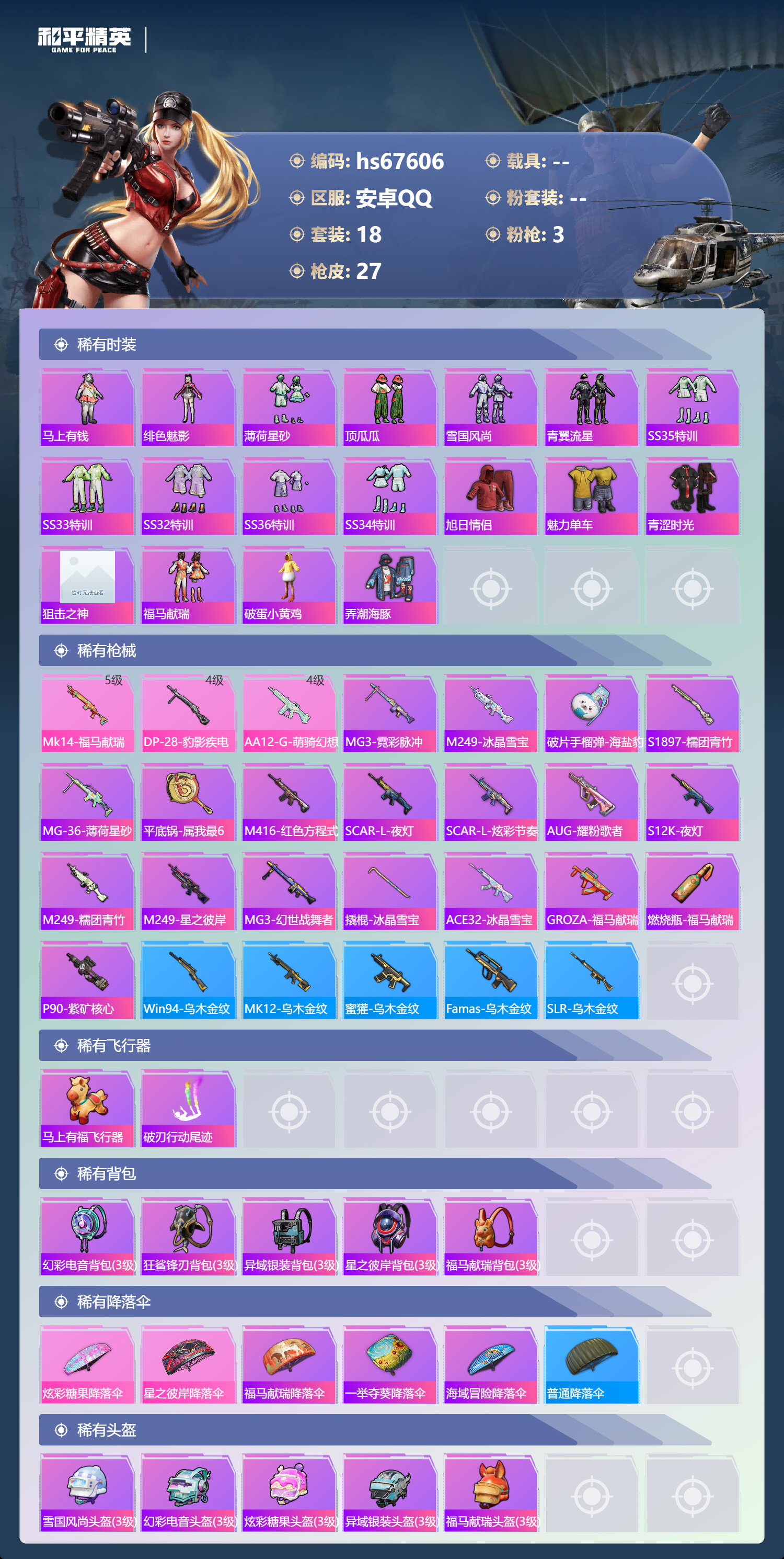 【27稀有枪械】Mk14-福马献瑞/5级,DP-28-豹影疾电/4级,AA12-G-萌骑幻想/4级,Win94-乌木金纹,MK12-乌木金纹,MG3-霓彩脉冲,蜜獾-乌木金纹,M249-冰晶雪宝,破片手榴弹-海盐豹豹,Famas-乌木金纹,S1897-糯团青竹,MG-36-薄荷星砂,平底锅-属我最6,M416-红色方程式,SCAR-L-夜灯,SCAR-L-炫彩节奏,AUG-耀粉歌者,S12K-夜灯,M249-糯团青竹,M249-星之彼岸,MG3-幻世战舞者,撬棍-冰晶雪宝,ACE32-冰晶雪宝,GROZA-福马献瑞,SLR-乌木金纹,燃烧瓶-福马献瑞,P90-紫矿核心