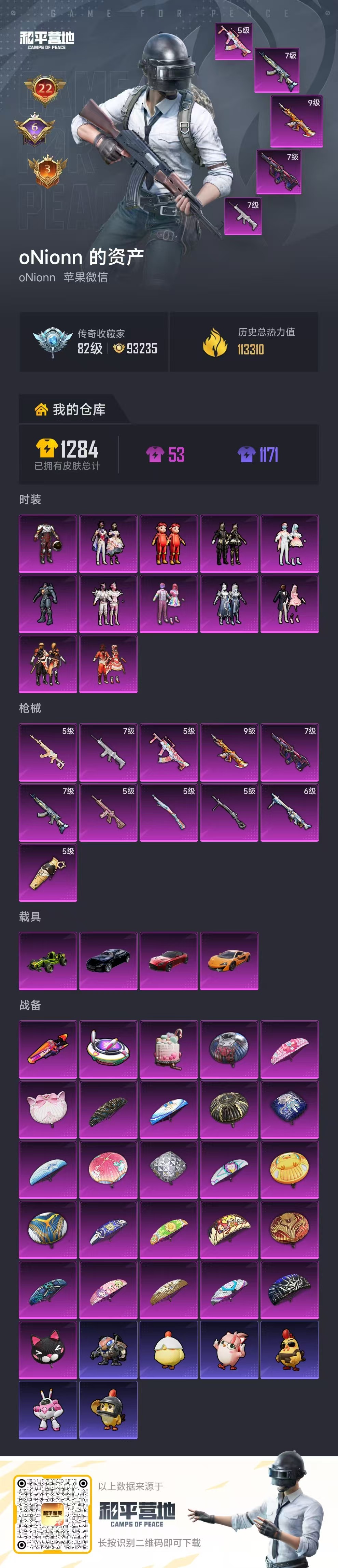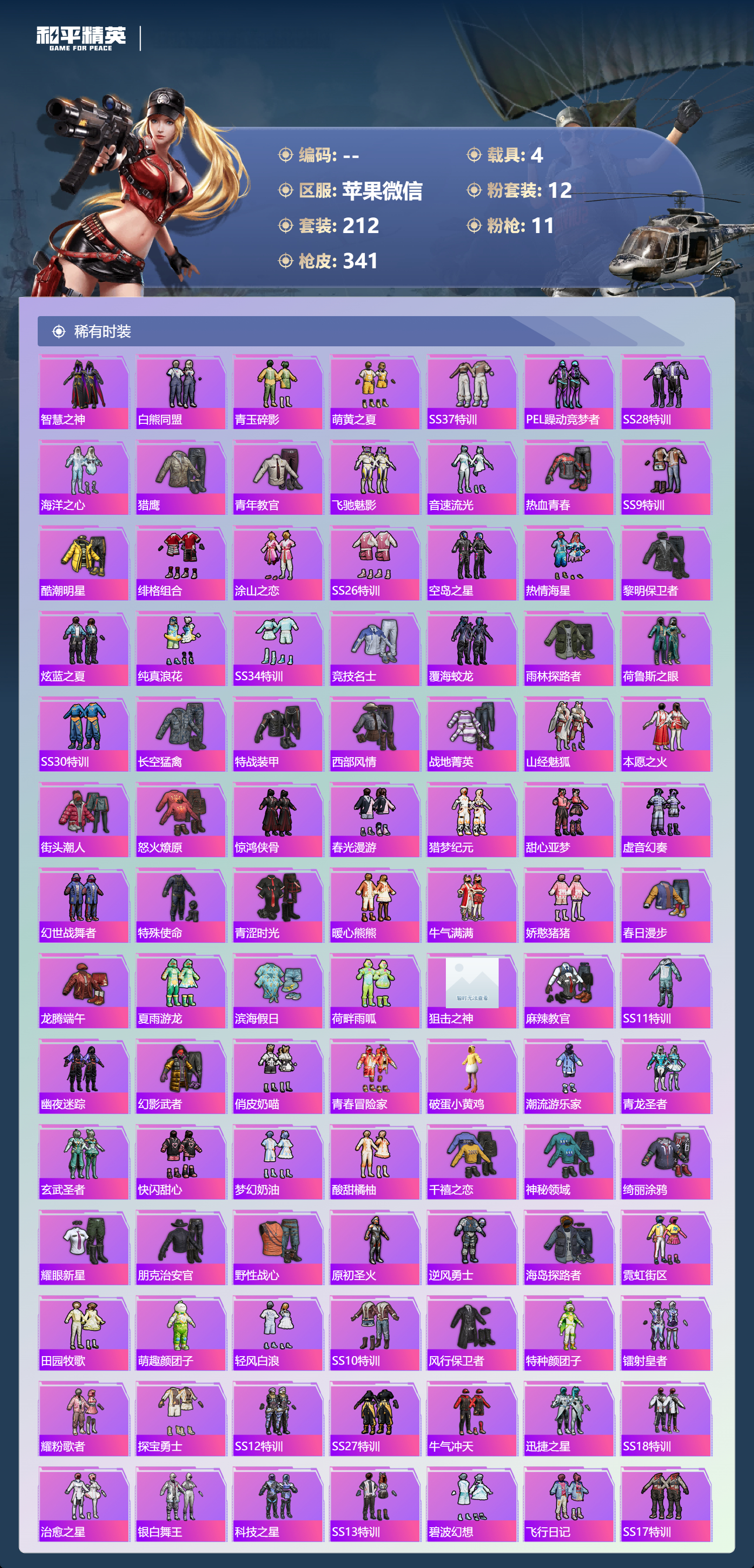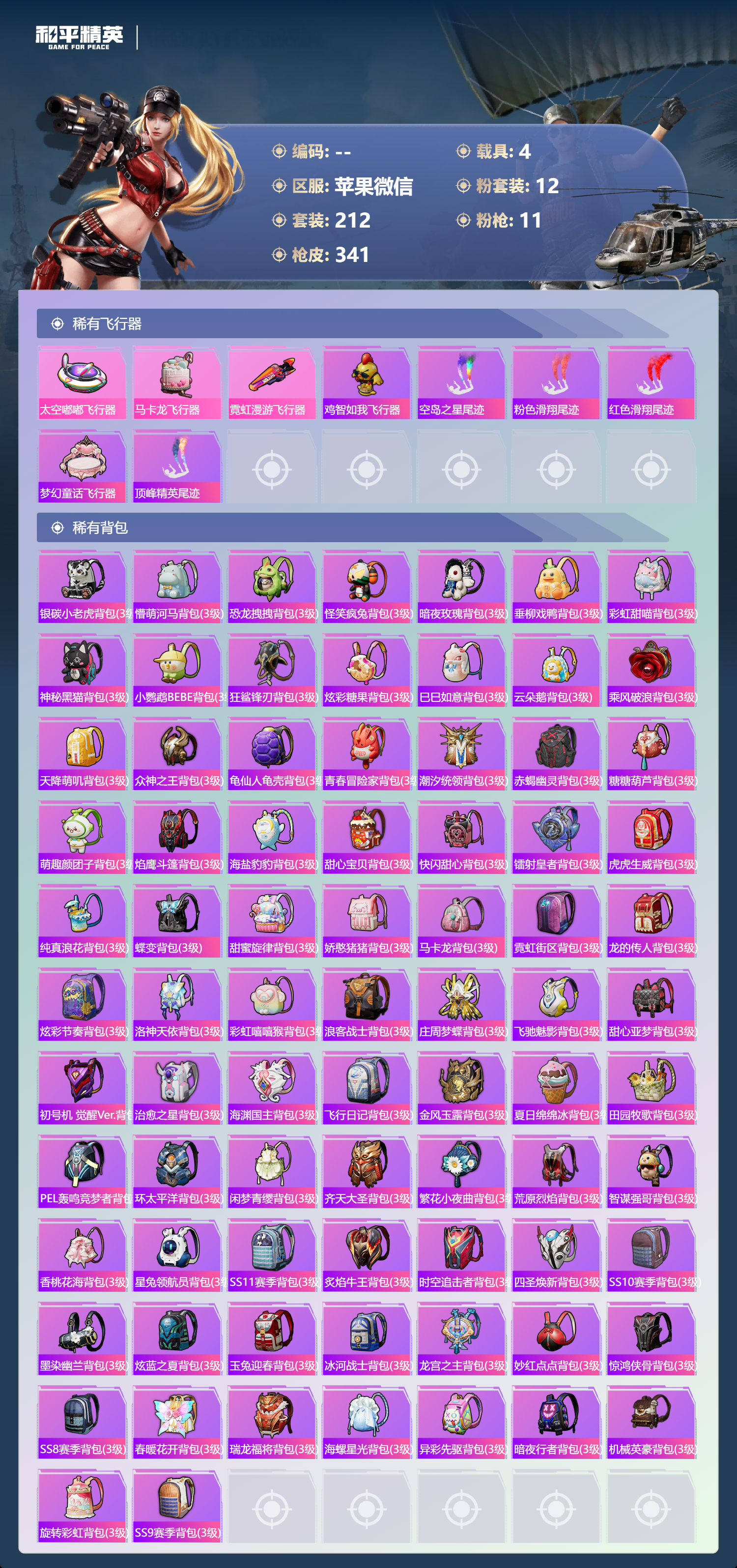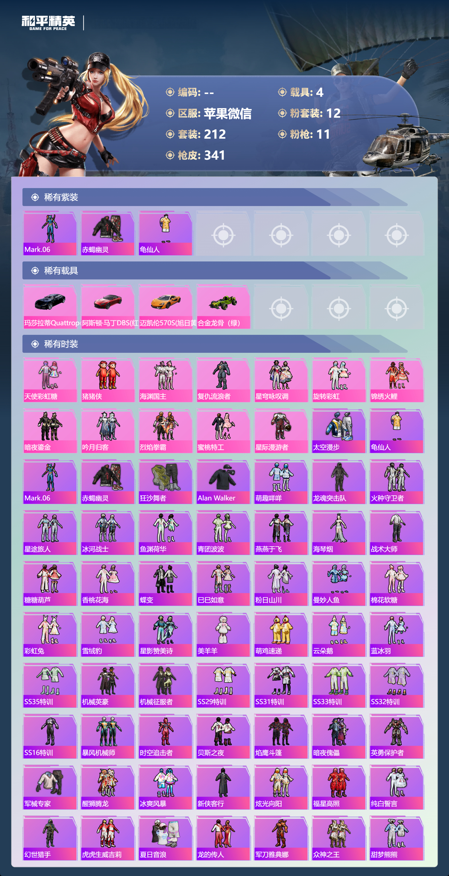 PX_2543209-,苹果微信-22王牌印记-12粉装-11特效枪-4载具-热力值-212套装-341枪皮-6卓越印记-3传奇印记