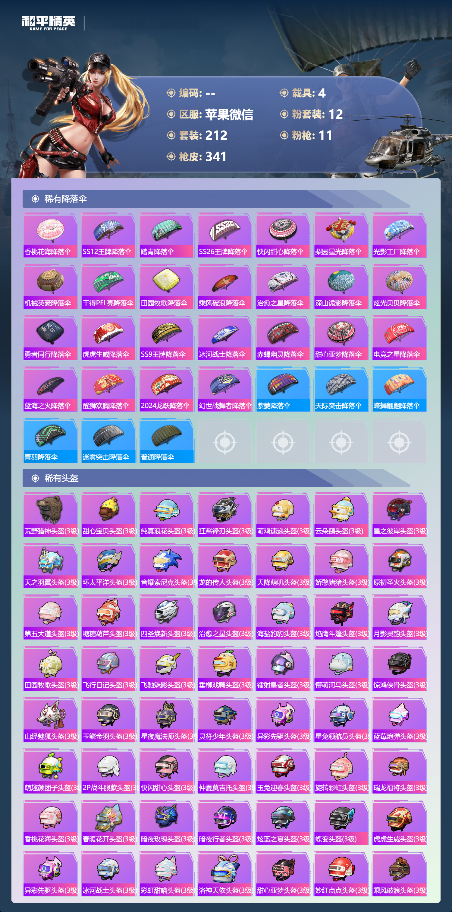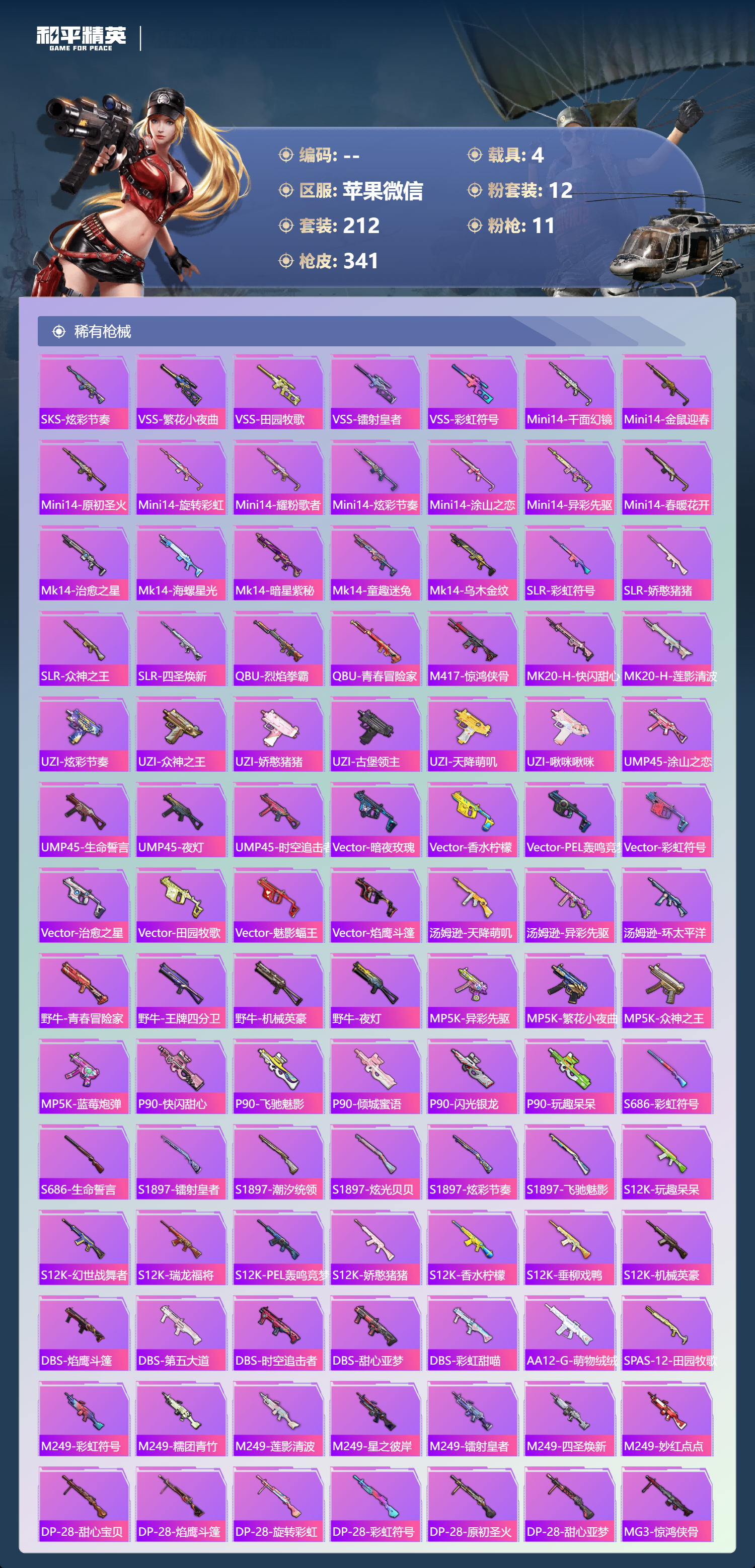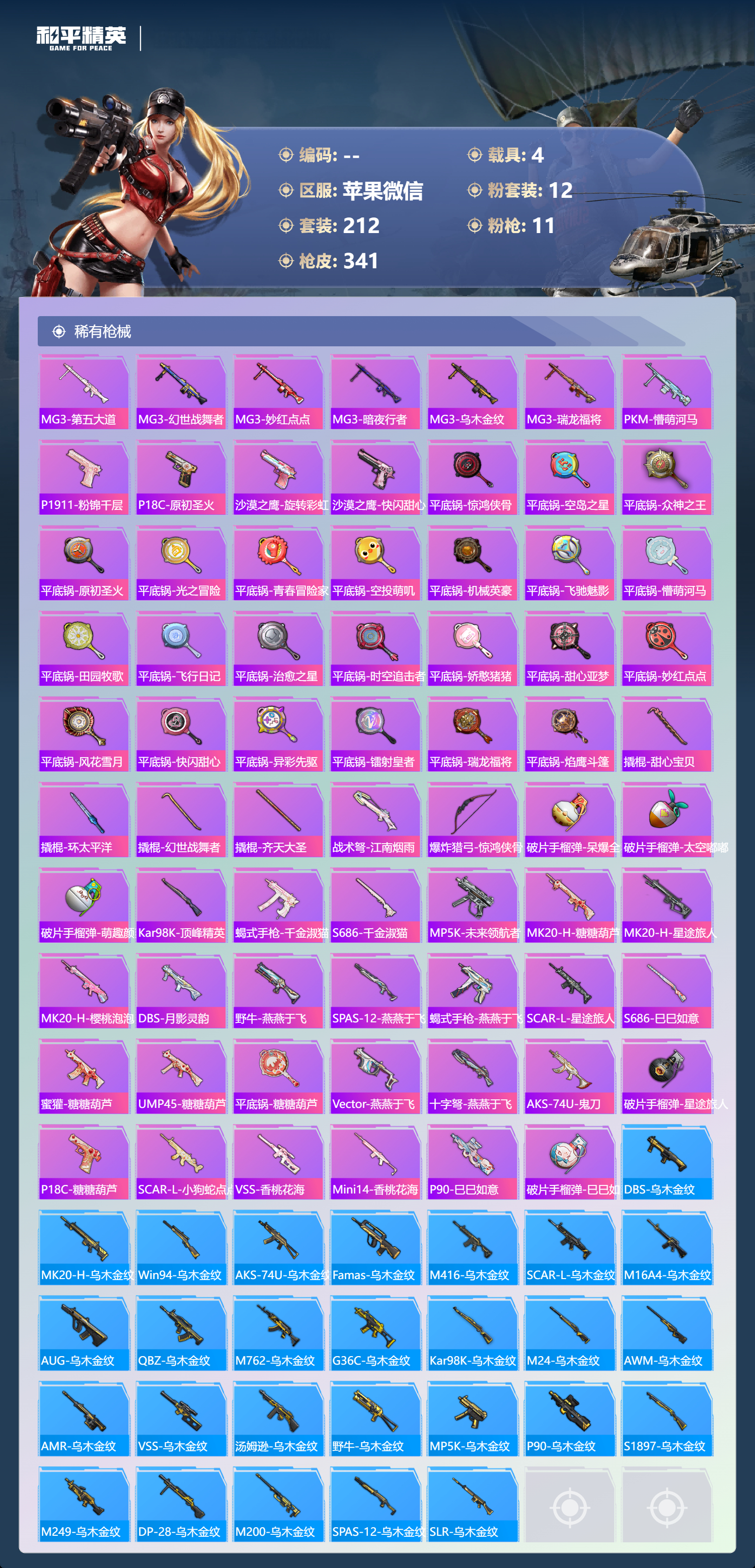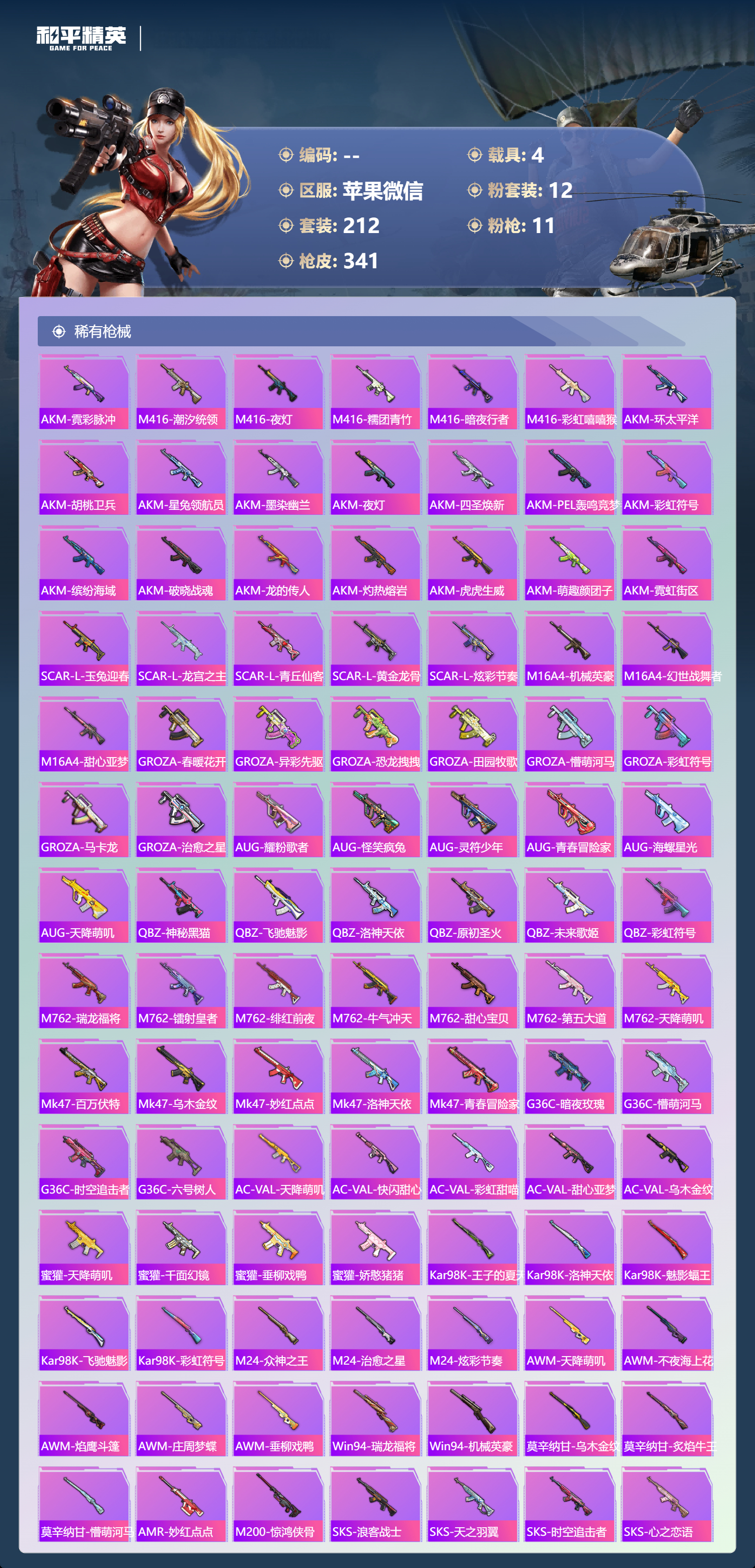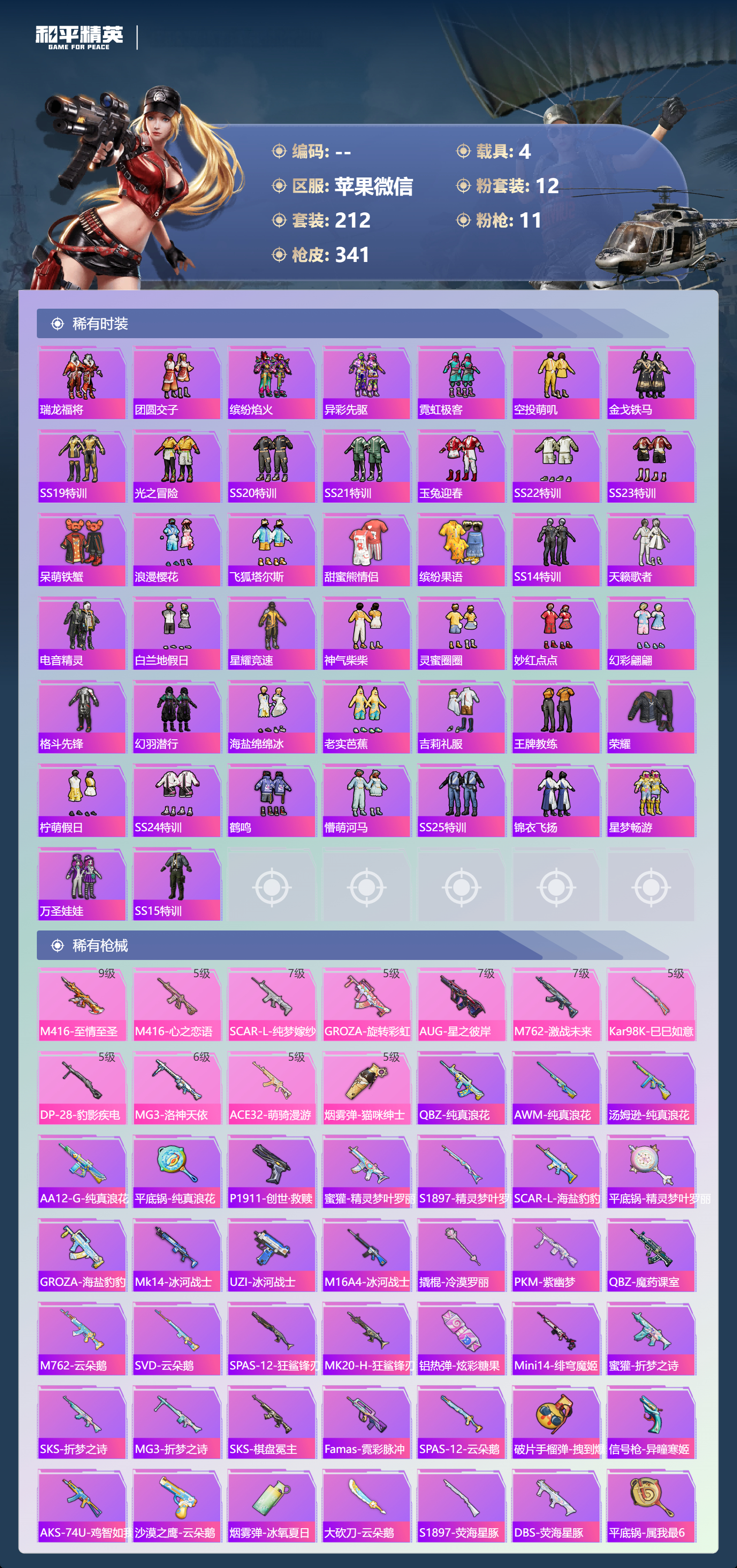 【341稀有枪械】M416-至情至圣/9级,M416-心之恋语/5级,SCAR-L-纯梦嫁纱/7级,GROZA-旋转彩虹/5级,AUG-星之彼岸/7级,M762-激战未来/7级,Kar98K-巳巳如意/5级,DP-28-豹影疾电/5级,MG3-洛神天依/6级,ACE32-萌骑漫游/5级,烟雾弹-猫咪绅士/5级,QBZ-纯真浪花,AWM-纯真浪花,汤姆逊-纯真浪花,DBS-乌木金纹,AA12-G-纯真浪花,平底锅-纯真浪花,P1911-创世·救赎,蜜獾-精灵梦叶罗丽,S1897-精灵梦叶罗丽,SCAR-L-海盐豹豹,平底锅-精灵梦叶罗丽,GROZA-海盐豹豹,Mk14-冰河战士,UZI-冰河战士,M16A4-冰河战士,MK20-H-乌木金纹,Win94-乌木金纹,撬棍-冷漠罗丽,PKM-紫幽梦,QBZ-魔药课室,M762-云朵鹅,SVD-云朵鹅,SPAS-12-狂鲨锋刃,MK20-H-狂鲨锋刃,铝热弹-炫彩糖果,Mini14-绯穹魔姬,蜜獾-折梦之诗,SKS-折梦之诗,MG3-折梦之诗,AKS-74U-乌木金纹,SKS-棋盘冕主,Famas-乌木金纹,Famas-霓彩脉冲,SPAS-12-云朵鹅,破片手榴弹-拽到爆炸,信号枪-异瞳寒姬,AKS-74U-鸡智如我,沙漠之鹰-云朵鹅,烟雾弹-冰氧夏日,大砍刀-云朵鹅,S1897-荧海星豚,DBS-荧海星豚,平底锅-属我最6,AKM-霓彩脉冲,M416-潮汐统领,M416-乌木金纹,M416-夜灯,M416-糯团青竹,M416-暗夜行者,M416-彩虹嘻嘻猴,AKM-环太平洋,AKM-胡桃卫兵,AKM-星兔领航员,AKM-墨染幽兰,AKM-夜灯,AKM-四圣焕新,AKM-PEL轰鸣竞梦者,AKM-彩虹符号,AKM-缤纷海域,AKM-破晓战魂,AKM-龙的传人,AKM-灼热熔岩,AKM-虎虎生威,AKM-萌趣颜团子,AKM-霓虹街区,SCAR-L-玉兔迎春,SCAR-L-乌木金纹,SCAR-L-龙宫之主,SCAR-L-青丘仙客,SCAR-L-黄金龙骨,SCAR-L-炫彩节奏,M16A4-机械英豪,M16A4-幻世战舞者,M16A4-甜心亚梦,M16A4-乌木金纹,GROZA-春暖花开,GROZA-异彩先驱,GROZA-恐龙拽拽,GROZA-田园牧歌,GROZA-懵萌河马,GROZA-彩虹符号,GROZA-马卡龙,GROZA-治愈之星,AUG-乌木金纹,AUG-耀粉歌者,AUG-怪笑疯兔,AUG-灵符少年,AUG-青春冒险家,AUG-海螺星光,AUG-天降萌叽,QBZ-神秘黑猫,QBZ-飞驰魅影,QBZ-洛神天依,QBZ-原初圣火,QBZ-乌木金纹,QBZ-未来歌姬,QBZ-彩虹符号,M762-瑞龙福将,M762-镭射皇者,M762-乌木金纹,M762-绯红前夜,M762-牛气冲天,M762-甜心宝贝,M762-第五大道,M762-天降萌叽,Mk47-百万伏特,Mk47-乌木金纹,Mk47-妙红点点,Mk47-洛神天依,Mk47-青春冒险家,G36C-乌木金纹,G36C-暗夜玫瑰,G36C-懵萌河马,G36C-时空追击者,G36C-六号树人,AC-VAL-天降萌叽,AC-VAL-快闪甜心,AC-VAL-彩虹甜喵,AC-VAL-甜心亚梦,AC-VAL-乌木金纹,蜜獾-天降萌叽,蜜獾-千面幻镜,蜜獾-垂柳戏鸭,蜜獾-娇憨猪猪,Kar98K-乌木金纹,Kar98K-王子的夏天,Kar98K-洛神天依,Kar98K-魅影蝠王,Kar98K-飞驰魅影,Kar98K-彩虹符号,M24-乌木金纹,M24-众神之王,M24-治愈之星,M24-炫彩节奏,AWM-天降萌叽,AWM-乌木金纹,AWM-不夜海上花,AWM-焰鹰斗篷,AWM-庄周梦蝶,AWM-垂柳戏鸭,Win94-瑞龙福将,Win94-机械英豪,莫辛纳甘-乌木金纹,莫辛纳甘-炙焰牛王,莫辛纳甘-懵萌河马,AMR-乌木金纹,AMR-妙红点点,M200-惊鸿侠骨,SKS-浪客战士,SKS-天之羽翼,SKS-时空追击者,SKS-心之恋语,SKS-炫彩节奏,VSS-乌木金纹,VSS-繁花小夜曲,VSS-田园牧歌,VSS-镭射皇者,VSS-彩虹符号,Mini14-千面幻镜,Mini14-金鼠迎春,Mini14-原初圣火,Mini14-旋转彩虹,Mini14-耀粉歌者,Mini14-炫彩节奏,Mini14-涂山之恋,Mini14-异彩先驱,Mini14-春暖花开,Mk14-治愈之星,Mk14-海螺星光,Mk14-暗星紫秘,Mk14-童趣迷兔,Mk14-乌木金纹,SLR-彩虹符号,SLR-娇憨猪猪,SLR-众神之王,SLR-四圣焕新,QBU-烈焰拳霸,QBU-青春冒险家,M417-惊鸿侠骨,MK20-H-快闪甜心,MK20-H-莲影清波,UZI-炫彩节奏,UZI-众神之王,UZI-娇憨猪猪,UZI-古堡领主,UZI-天降萌叽,UZI-啾咪啾咪,UMP45-涂山之恋,UMP45-生命誓言,UMP45-夜灯,UMP45-时空追击者,Vector-暗夜玫瑰,Vector-香水柠檬,Vector-PEL轰鸣竞梦者,Vector-彩虹符号,Vector-治愈之星,Vector-田园牧歌,Vector-魅影蝠王,Vector-焰鹰斗篷,汤姆逊-天降萌叽,汤姆逊-乌木金纹,汤姆逊-异彩先驱,汤姆逊-环太平洋,野牛-乌木金纹,野牛-青春冒险家,野牛-王牌四分卫,野牛-机械英豪,野牛-夜灯,MP5K-异彩先驱,MP5K-繁花小夜曲,MP5K-众神之王,MP5K-蓝莓炮弹,MP5K-乌木金纹,P90-乌木金纹,P90-快闪甜心,P90-飞驰魅影,P90-倾城蜜语,P90-闪光银龙,P90-玩趣呆呆,S686-彩虹符号,S686-生命誓言,S1897-镭射皇者,S1897-潮汐统领,S1897-乌木金纹,S1897-炫光贝贝,S1897-炫彩节奏,S1897-飞驰魅影,S12K-玩趣呆呆,S12K-幻世战舞者,S12K-瑞龙福将,S12K-PEL轰鸣竞梦者,S12K-娇憨猪猪,S12K-香水柠檬,S12K-垂柳戏鸭,S12K-机械英豪,DBS-焰鹰斗篷,DBS-第五大道,DBS-时空追击者,DBS-甜心亚梦,DBS-彩虹甜喵,AA12-G-萌物绒绒,SPAS-12-田园牧歌,M249-彩虹符号,M249-糯团青竹,M249-莲影清波,M249-乌木金纹,M249-星之彼岸,M249-镭射皇者,M249-四圣焕新,M249-妙红点点,DP-28-甜心宝贝,DP-28-焰鹰斗篷,DP-28-旋转彩虹,DP-28-彩虹符号,DP-28-乌木金纹,DP-28-原初圣火,DP-28-甜心亚梦,MG3-惊鸿侠骨,MG3-第五大道,MG3-幻世战舞者,MG3-妙红点点,MG3-暗夜行者,MG3-乌木金纹,MG3-瑞龙福将,PKM-懵萌河马,P1911-粉锦千层,P18C-原初圣火,沙漠之鹰-旋转彩虹,沙漠之鹰-快闪甜心,平底锅-惊鸿侠骨,平底锅-空岛之星,平底锅-众神之王,平底锅-原初圣火,平底锅-光之冒险,平底锅-青春冒险家,平底锅-空投萌叽,平底锅-机械英豪,平底锅-飞驰魅影,平底锅-懵萌河马,平底锅-田园牧歌,平底锅-飞行日记,平底锅-治愈之星,平底锅-时空追击者,平底锅-娇憨猪猪,平底锅-甜心亚梦,平底锅-妙红点点,平底锅-风花雪月,平底锅-快闪甜心,平底锅-异彩先驱,平底锅-镭射皇者,平底锅-瑞龙福将,平底锅-焰鹰斗篷,撬棍-甜心宝贝,撬棍-环太平洋,撬棍-幻世战舞者,撬棍-齐天大圣,战术弩-江南烟