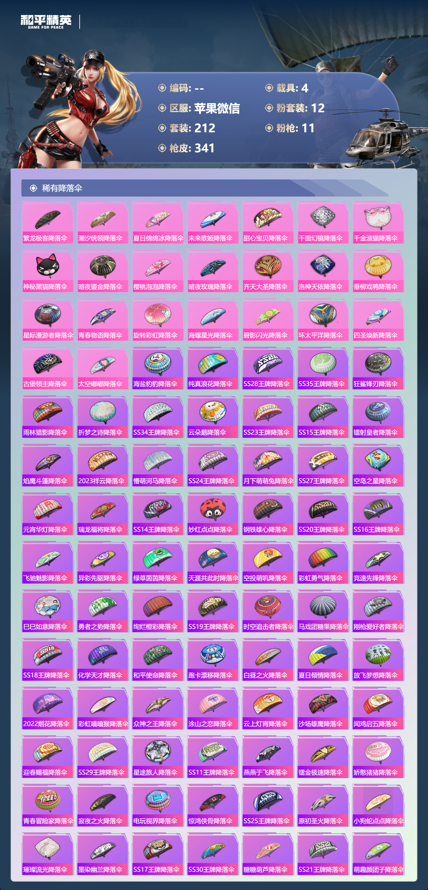 【129稀有降落伞】海盐豹豹降落伞,纯真浪花降落伞,SS28王牌降落伞,SS35王牌降落伞,狂鲨锋刃降落伞,雨林猎影降落伞,折梦之诗降落伞,SS34王牌降落伞,云朵鹅降落伞,SS23王牌降落伞,SS15王牌降落伞,镭射皇者降落伞,繁龙极客降落伞,焰鹰斗篷降落伞,潮汐统领降落伞,夏日绵绵冰降落伞,2023祥云降落伞,懵萌河马降落伞,SS24王牌降落伞,未来歌姬降落伞,月下萌萌兔降落伞,SS27王牌降落伞,甜心宝贝降落伞,空岛之星降落伞,元宵华灯降落伞,紫菱降落伞,瑞龙福将降落伞,SS14王牌降落伞,妙红点点降落伞,天际突击降落伞,钢铁雄心降落伞,SS20王牌降落伞,SS16王牌降落伞,蝶舞翩翩降落伞,飞驰魅影降落伞,异彩先驱降落伞,绿草茵茵降落伞,青羽降落伞,天涯共此时降落伞,空投萌叽降落伞,彩虹勇气降落伞,竞速先锋降落伞,巳巳如意降落伞,勇者之势降落伞,绚烂橙彩降落伞,SS19王牌降落伞,时空追击者降落伞,普通降落伞,马戏团糖果降落伞,千面幻镜降落伞,刚枪爱好者降落伞,千金淑猫降落伞,SS18王牌降落伞,化学天才降落伞,和平使命降落伞,神秘黑猫降落伞,跑卡漂移降落伞,白昼之火降落伞,夏日倾情降落伞,放飞梦想降落伞,2022烟花降落伞,彩虹嘻嘻猴降落伞,暗夜鎏金降落伞,众神之王降落伞,迷雾突击降落伞,涂山之恋降落伞,云上灯宵降落伞,沙场雄鹰降落伞,闻鸡启五降落伞,樱桃泡泡降落伞,迎春赐福降落伞,SS29王牌降落伞,星途旅人降落伞,SS11王牌降落伞,燕燕于飞降落伞,镭金极速降落伞,娇憨猪猪降落伞,青春冒险家降落伞,寂夜之火降落伞,暗夜玫瑰降落伞,电玩视界降落伞,惊鸿侠骨降落伞,齐天大圣降落伞,SS25王牌降落伞,洛神天依降落伞,原初圣火降落伞,小狗蛇点点降落伞,璀璨流光降落伞,墨染幽兰降落伞,垂柳戏鸭降落伞,SS17王牌降落伞,星际漫游者降落伞,青春物语降落伞,SS30王牌降落伞,糖糖葫芦降落伞,SS21王牌降落伞,萌趣颜团子降落伞,旋转彩虹降落伞,香桃花海降落伞,海螺星光降落伞,SS12王牌降落伞,踏青降落伞,SS26王牌降落伞,快闪甜心降落伞,梨园星光降落伞,光影工厂降落伞,机械英豪降落伞,碧影闪光降落伞,干得PEL亮降落伞,环太平洋降落伞,田园牧歌降落伞,四圣焕新降落伞,乘风破浪降落伞,治愈之星降落伞,深山诡影降落伞,炫光贝贝降落伞,勇者同行降落伞,虎虎生威降落伞,古堡领主降落伞,SS9王牌降落伞,冰河战士降落伞,赤蝎幽灵降落伞,甜心亚梦降落伞,电竞之星降落伞,太空嘟嘟降落伞,蓝海之火降落伞,醒狮欢腾降落伞,2024龙跃降落伞,幻世战舞者降落伞