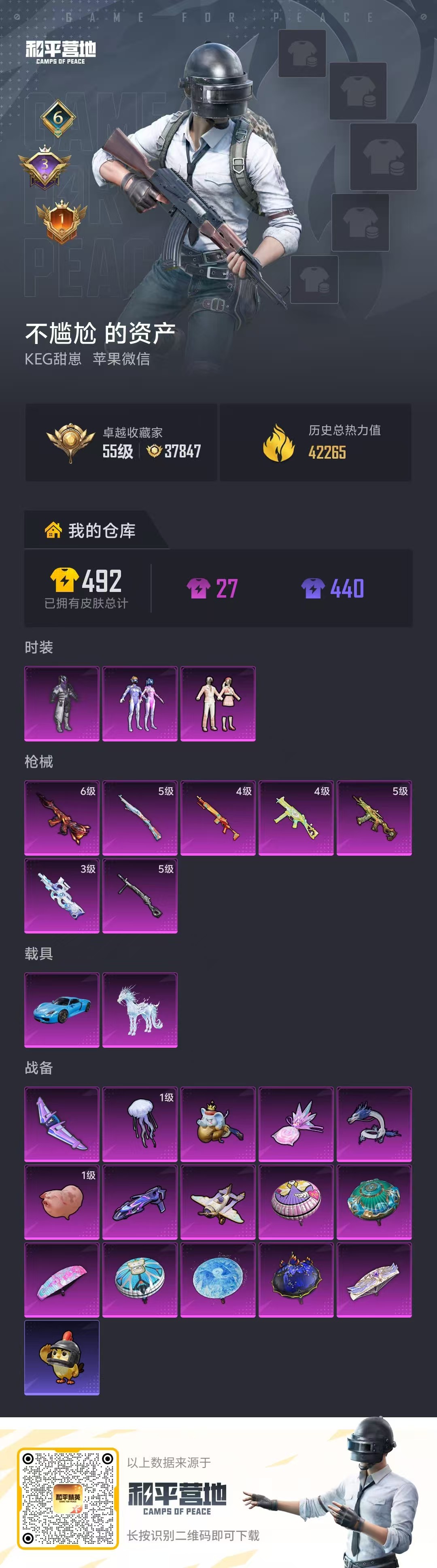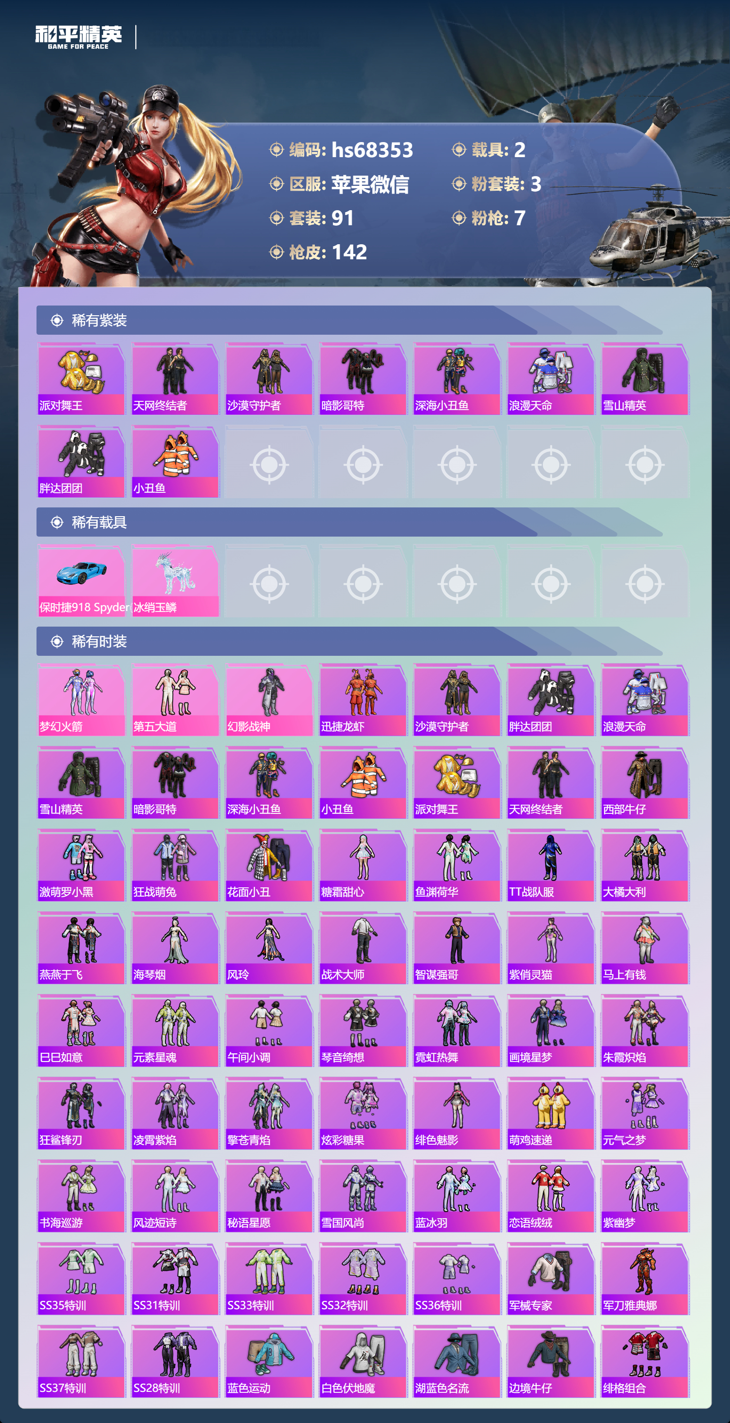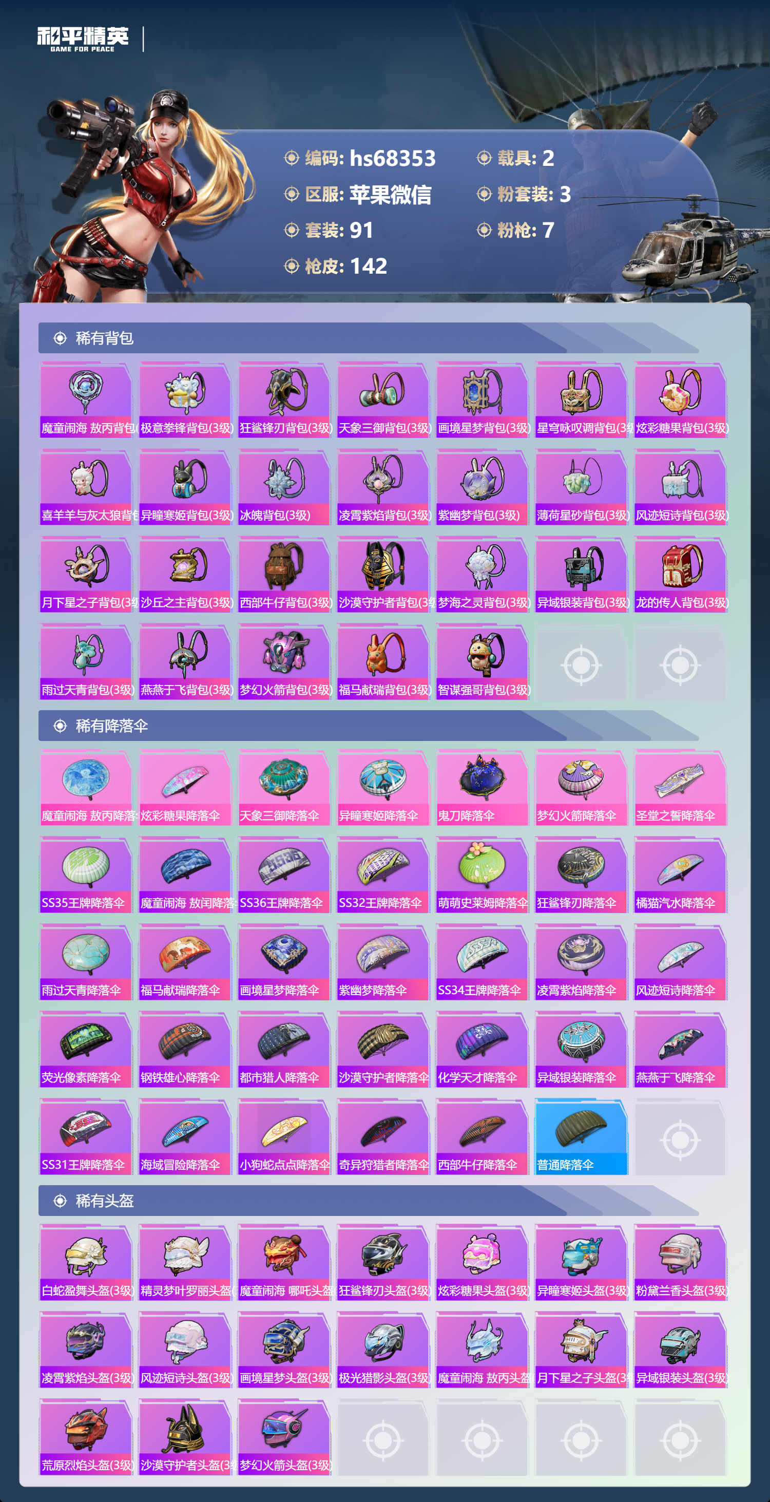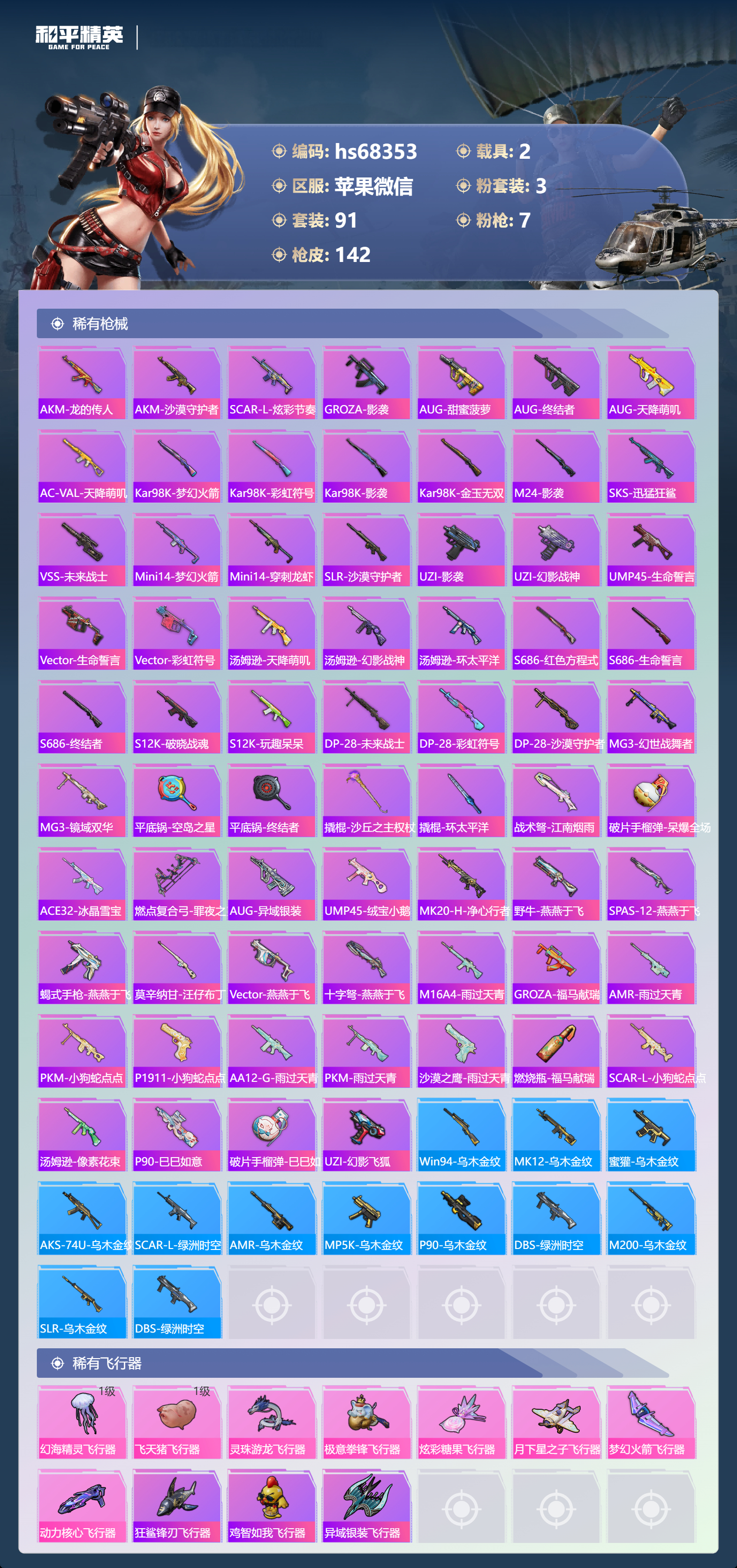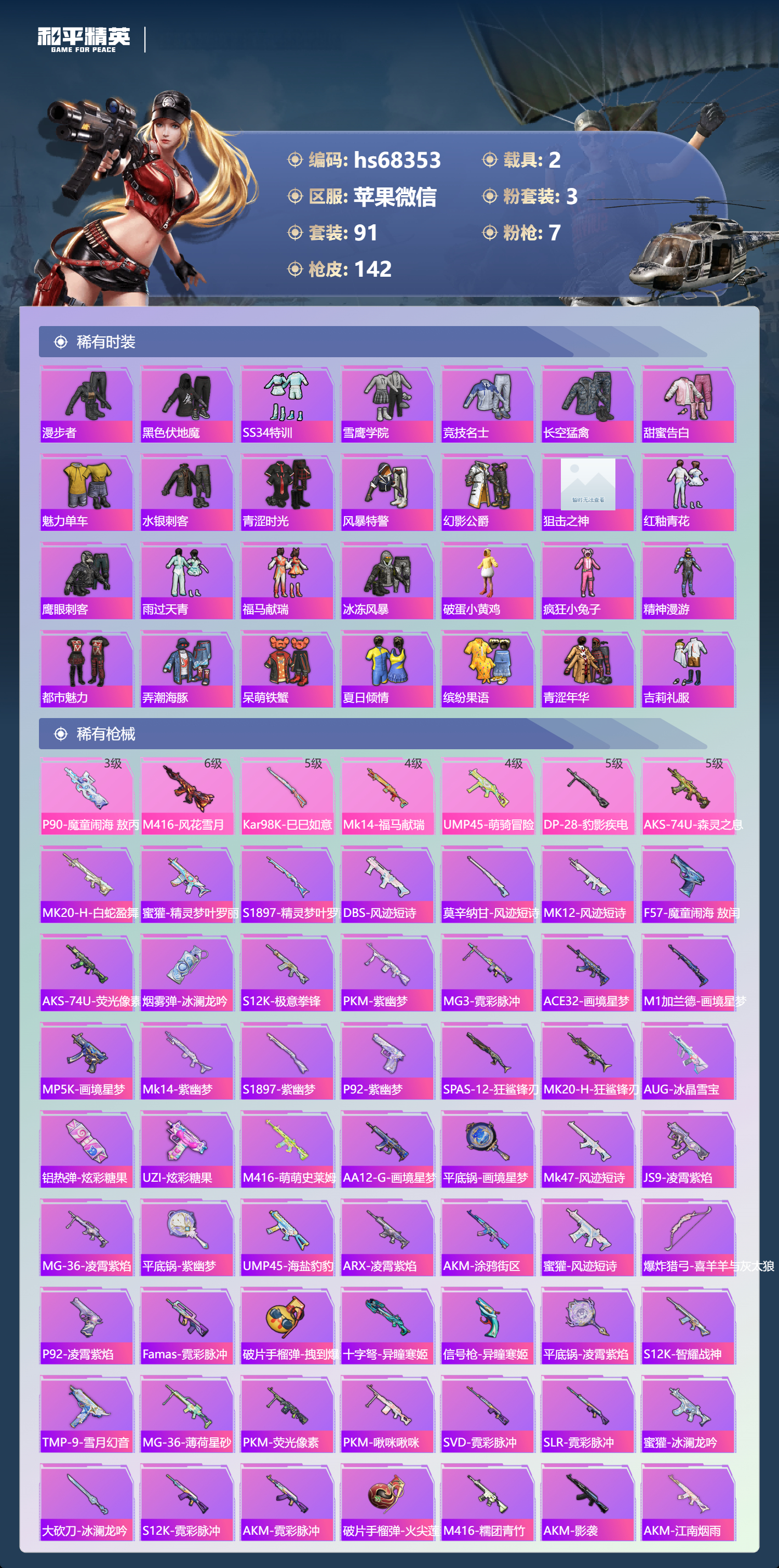 PX_2543228-,苹果微信-6王牌印记-3粉装-7特效枪-2载具-42265热力值-91套装-142枪皮-3卓越印记-1传奇印记