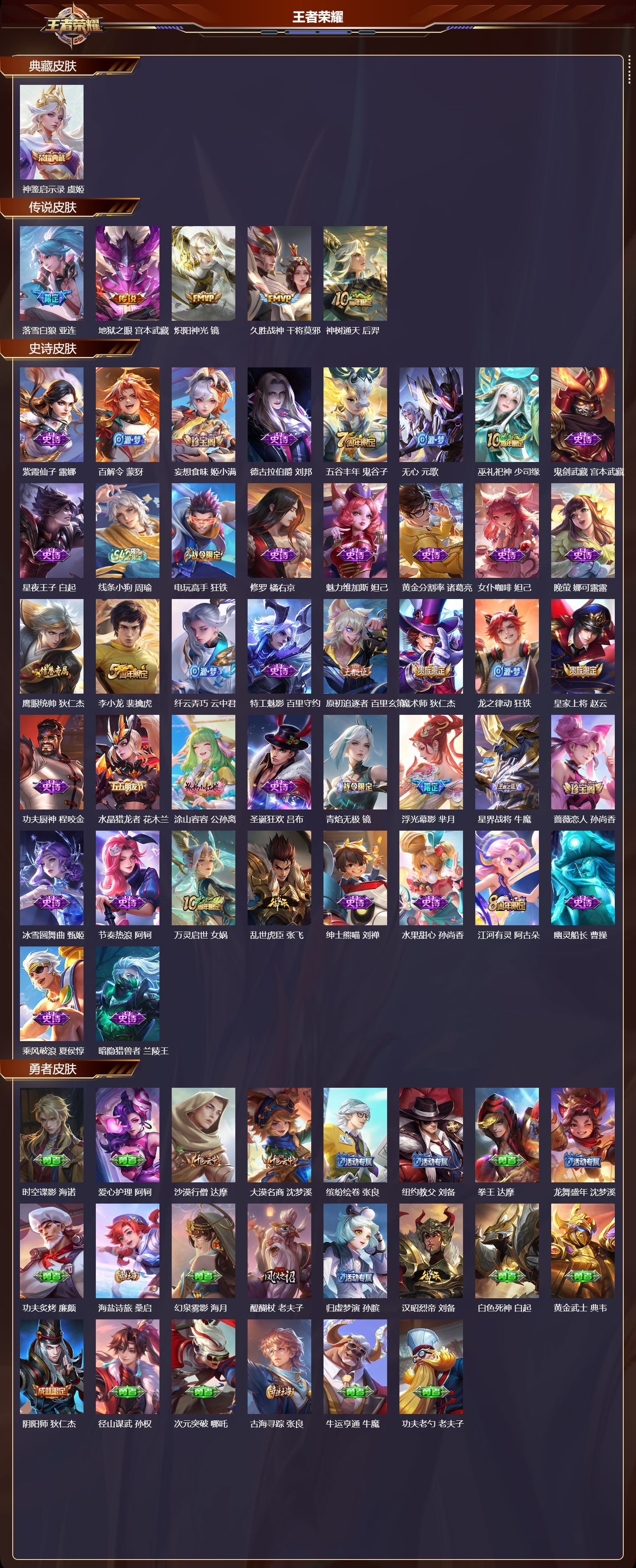 【42,史诗皮肤】紫霞仙子,露娜,百解令,蒙犽,妄想食味,姬小满,德古拉伯爵,刘邦,五谷丰年,鬼谷子,无心,元歌,巫礼祀神,少司缘,鬼剑武藏,宫本武藏,星夜王子,白起,线条小狗,周瑜,电玩高手,狂铁,修罗,橘右京,魅力维加斯,妲己,黄金分割率,诸葛亮,女仆咖啡,妲己,晚萤,娜可露露,鹰眼统帅,狄仁杰,李小龙,裴擒虎,纤云弄巧,云中君,特工魅影,百里守约,原初追逐者,百里玄策,魔术师,狄仁杰,龙之律动,狂铁,皇家上将,赵云,功夫厨神,程咬金,水晶猎龙者,花木兰,涂山容容,公孙离,圣诞狂欢,吕布,青焰无极,镜,浮光幕影,芈月,星界战将,牛魔,蔷薇恋人,孙尚香,冰雪圆舞曲,甄姬,节奏热浪,阿轲,万灵启世,女娲,乱世虎臣,张飞,绅士熊喵,刘禅,水果甜心,孙尚香,江河有灵,阿古朵,幽灵船长,曹操,乘风破浪,夏侯惇,暗隐猎兽者,兰陵王,