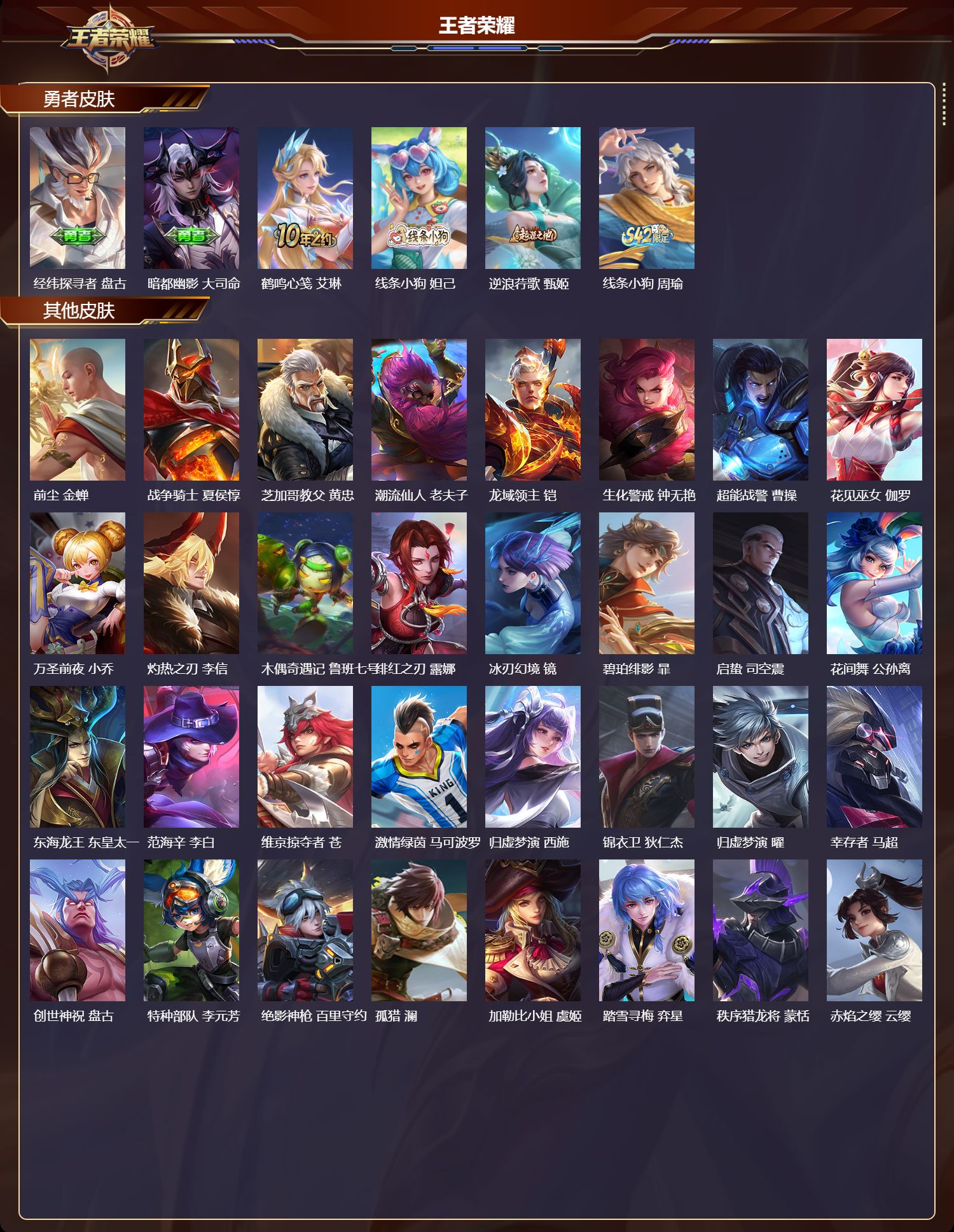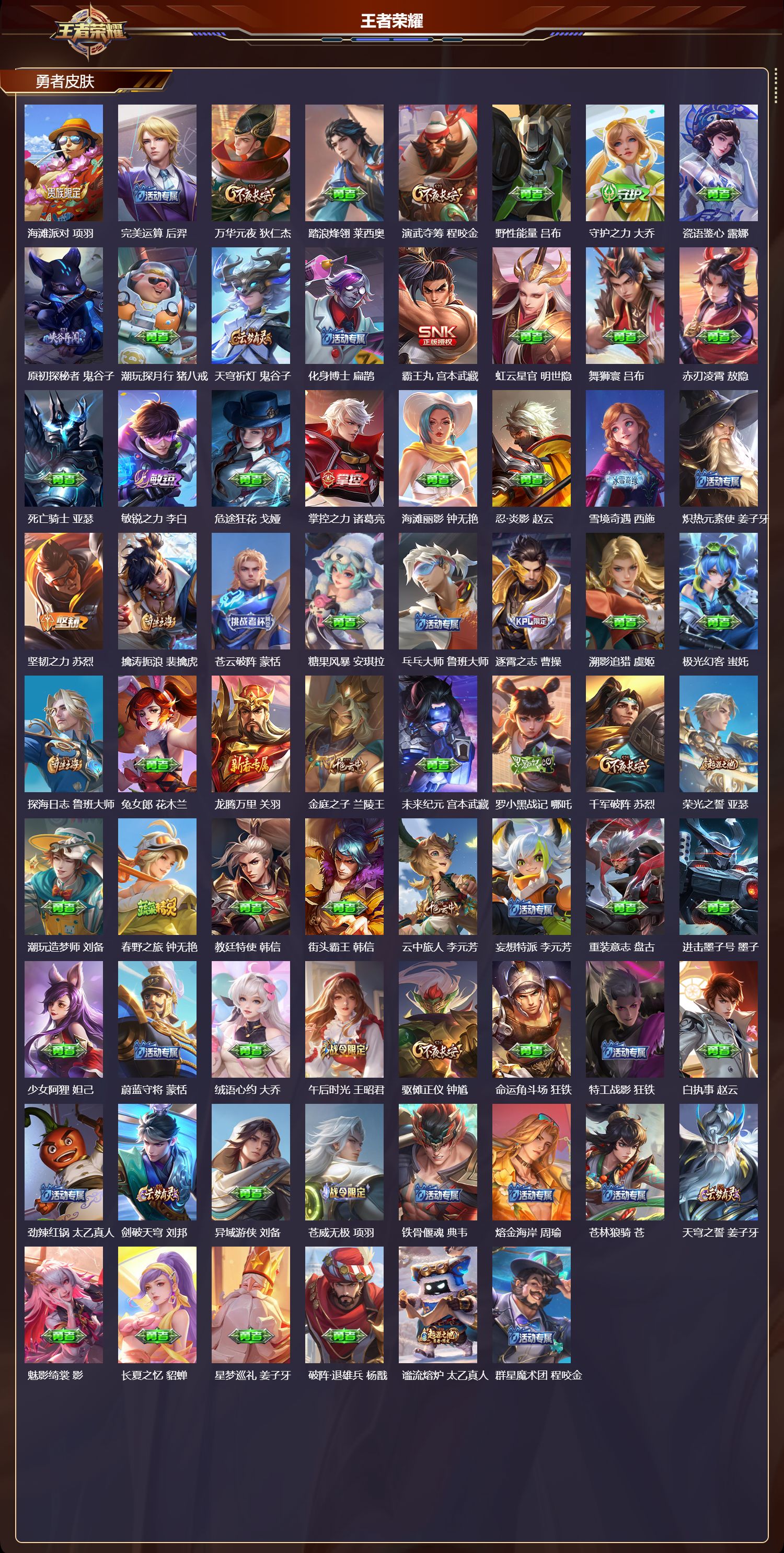 【98,勇者皮肤】时空谍影,海诺,爱心护理,阿轲,沙漠行僧,达摩,大漠名商,沈梦溪,缤纷绘卷,张良,纽约教父,刘备,拳王,达摩,龙舞盛年,沈梦溪,功夫炙烤,廉颇,海盐诗旅,桑启,幻泉雾影,海月,醍醐杖,老夫子,归虚梦演,孙膑,汉昭烈帝,刘备,白色死神,白起,黄金武士,典韦,阴阳师,狄仁杰,径山谋武,孙权,次元突破,哪吒,古海寻踪,张良,牛运亨通,牛魔,功夫老勺,老夫子,海滩派对,项羽,完美运算,后羿,万华元夜,狄仁杰,踏浪烽翎,莱西奥,演武夺筹,程咬金,野性能量,吕布,守护之力,大乔,瓷语鉴心,露娜,原初探秘者,鬼谷子,潮玩探月行,猪八戒,天穹祈灯,鬼谷子,化身博士,扁鹊,霸王丸,宫本武藏,虹云星官,明世隐,舞狮寰,吕布,赤刃凌霄,敖隐,死亡骑士,亚瑟,敏锐之力,李白,危途狂花,戈娅,掌控之力,诸葛亮,海滩丽影,钟无艳,忍·炎影,赵云,雪境奇遇,西施,炽热元素使,姜子牙,坚韧之力,苏烈,擒涛扼浪,裴擒虎,苍云破阵,蒙恬,糖果风暴,安琪拉,乓乓大师,鲁班大师,逐霄之志,曹操,溯影追猎,虞姬,极光幻客,蚩奼,探海日志,鲁班大师,兔女郎,花木兰,龙腾万里,关羽,金庭之子,兰陵王,未来纪元,宫本武藏,罗小黑战记,哪吒,千军破阵,苏烈,荣光之誓,亚瑟,潮玩造梦师,刘备,春野之旅,钟无艳,教廷特使,韩信,街头霸王,韩信,云中旅人,李元芳,妄想特派,李元芳,重装意志,盘古,进击墨子号,墨子,少女阿狸,妲己,蔚蓝守将,蒙恬,绒语心约,大乔,午后时光,王昭君,驱傩正仪,钟馗,命运角斗场,狂铁,特工战影,狂铁,白执事,赵云,劲辣红锅,太乙真人,剑破天穹,刘邦,异域游侠,刘备,苍威无极,项羽,铁骨偃魂,典韦,熔金海岸,周瑜,苍林狼骑,苍,天穹之誓,姜子牙,魅影绮裳,影,长夏之忆,貂蝉,星梦巡礼,姜子牙,破阵·退雄兵,杨戬,谧流熔炉,太乙真人,群星魔术团,程咬金,经纬探寻者,盘古,暗都幽影,大司命,鹤鸣心笺,艾琳,线条小狗,妲己,逆浪荇歌,甄姬,线条小狗,周瑜,