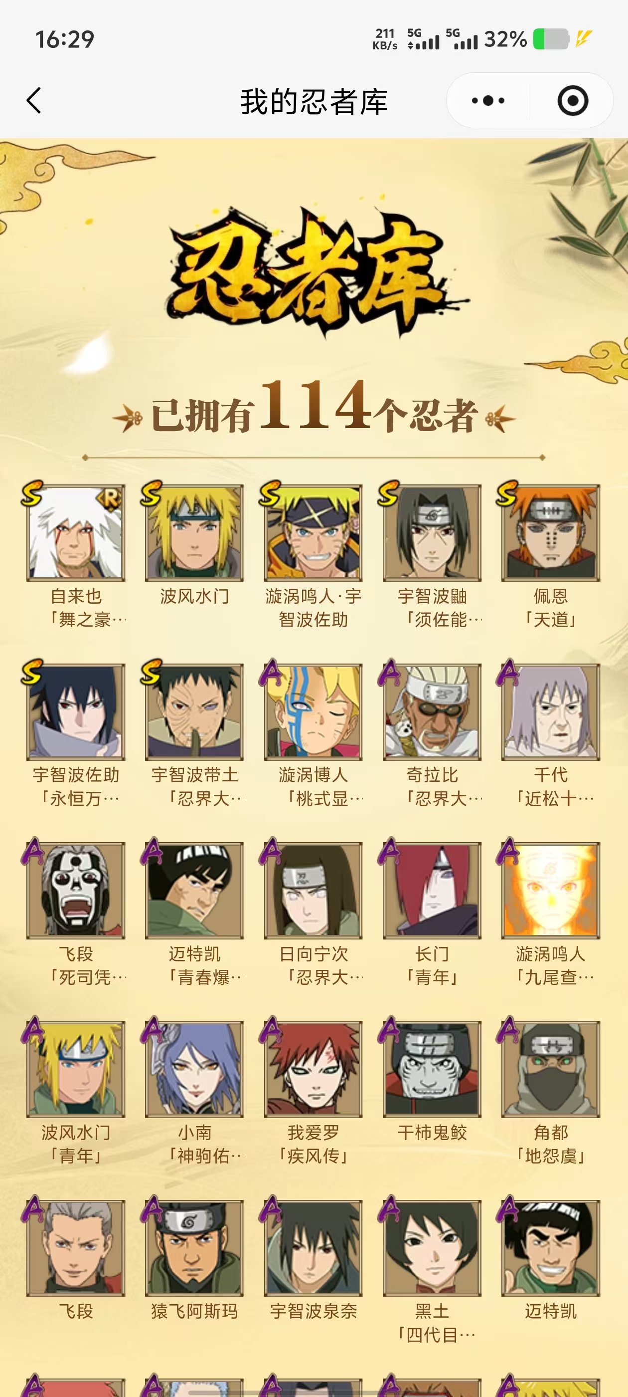 【A忍者】,小南「神驹佑将」,机械鸣人「初始形态」,迈特凯「青春爆炸」,长十郎「六代目水影」,日向宁次「忍界大战」,漩涡博人「桃式显现」,宇智波鼬「夏日限定」,宇智波泉奈,神农「羁绊」,长门「青年」,波风水门「青年」,奇拉比「忍界大战」,黑土「四代目土影」,漩涡鸣人「九尾查克拉」,千代「近松十人卫」,秋道丁次「忍界大战」,波风水门「新春限定」,角都「地怨虞」,飞段「死司凭血」,飞段,我爱罗「疾风传」,蝎,干柿鬼鲛,猿飞阿斯玛,迈特凯,