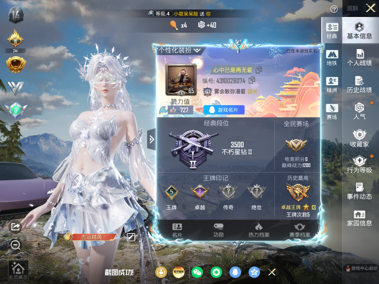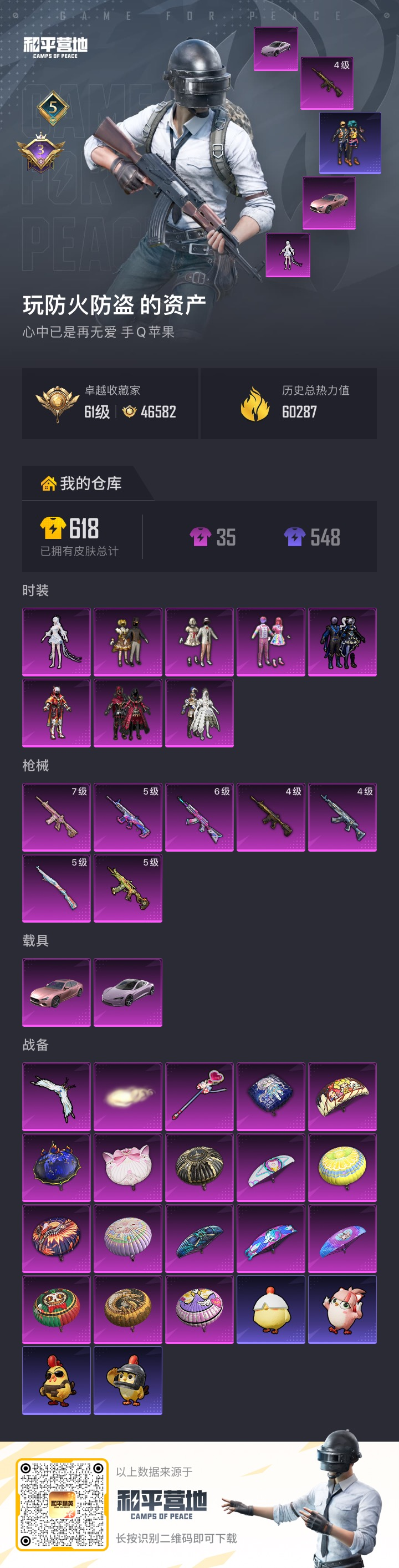 PX_2544475-2载具-115套装-171枪皮-1稀有2载具8粉装7特效枪12热门115套装171枪皮,60287热力值,5印记,历史卓越王牌13星,【1稀有】,AKM-百万伏特,【2载具】,玛莎拉蒂粉色,特斯拉R沁心粉,【8粉装】,宝贝奶油派,天使彩虹糖,甜心巧克力,月中灵,冰霜白皇,炙焰红王,桀骜红莲,暗夜玫瑰,【7特效枪】,M416-五爪金龙,(4级),M416-心之恋语,(7级),AKM-炫紫旋律,(6级),AKS-74U-森灵之息,(5级),Kar98K-巳巳如意,(5级),M762-激战未来,(4级),SCAR-L-机甲封神,(5级),【12热门】,雪山精英,深海小丑鱼,梦起落英,暗影哥特,醒狮腾龙,团圆交子,瑞龙福将,薄荷蓝莓,M762-瑞龙福将,M24-奇异狩猎者,S686-奇异狩猎者,AWM-激战未来,【3飞行器】,童趣迷兔飞行器,齐天大圣飞行器,天之羽翼飞行器,【4头盔】,童趣迷兔头盔,梦幻火箭头盔,木曜青龙头盔,甜心宝贝头盔,【3背包】,梦幻火箭背包,甜心宝贝背包,夏日绵绵冰背包,营地ID: