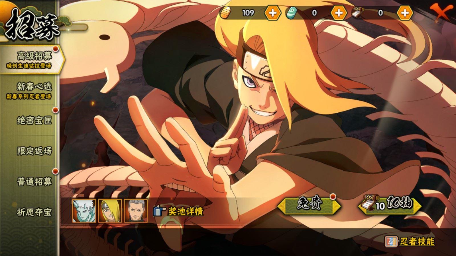 【A忍者】,小南「神驹佑将」,旗木卡卡西「神威对决」,机械鸣人「初始形态」,巳月「仙人模式」,迈特凯「青春爆炸」,土台「忍界大战」,漩涡博人「桃式显现」,宇智波鼬「夏日限定」,宇智波泉奈,神农「羁绊」,宇智波止水,波风水门「青年」,宇智波佐助「须佐能乎」,迪达拉「秽土转生」,猿飞木叶丸「博人传」,角都「晓创生」,千代「近松十人卫」,药师兜「半蛇斗篷」,地陆,我爱罗「忍界大战」,秋道丁次「忍界大战」,大蛇丸「晓」,猿飞日斩「火影继承人」,宇智波佐助「万花筒写轮眼」,漩涡鸣人「仙人模式」,飞段「死司凭血」,飞段,我爱罗「疾风传」,蝎,干柿鬼鲛,宇智波鼬,猿飞阿斯玛,迈特凯,
