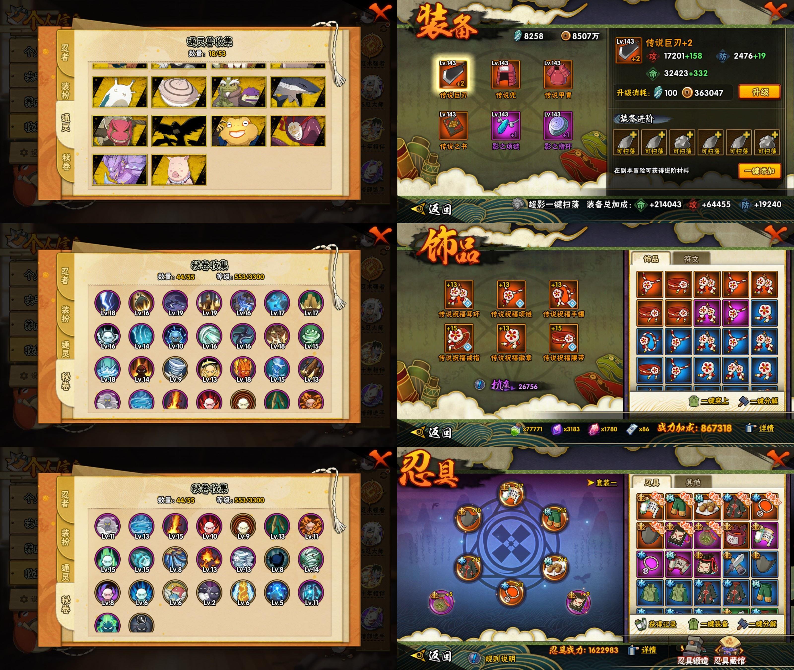 【A忍者】,宇智波带土「漂泊浪客」,小南「神驹佑将」,旗木卡卡西「神威对决」,机械鸣人「初始形态」,巳月「仙人模式」,迈特凯「青春爆炸」,日向宁次「忍界大战」,漩涡博人「桃式显现」,旗木卡卡西「幻之真容」,李洛克「忍界大战」,蝎「绯流琥」,宇智波泉奈,神农「羁绊」,桃地再不斩「秽土转生」,角都「秽土转生」,艾「青年」,达鲁伊「五代目雷影」,波风水门「青年」,宇智波止水「新春限定」,黑土「四代目土影」,宇智波佐助「须佐能乎」,宇智波带土「暴怒」,漩涡鸣人「九尾查克拉」,千代「近松十人卫」,秋道丁次「忍界大战」,大蛇丸「晓」,漩涡鸣人「仙人模式」,飞段「死司凭血」,飞段,我爱罗「疾风传」,蝎,干柿鬼鲛,宇智波鼬,猿飞阿斯玛,迈特凯,卑留呼「火之意志继承者」,