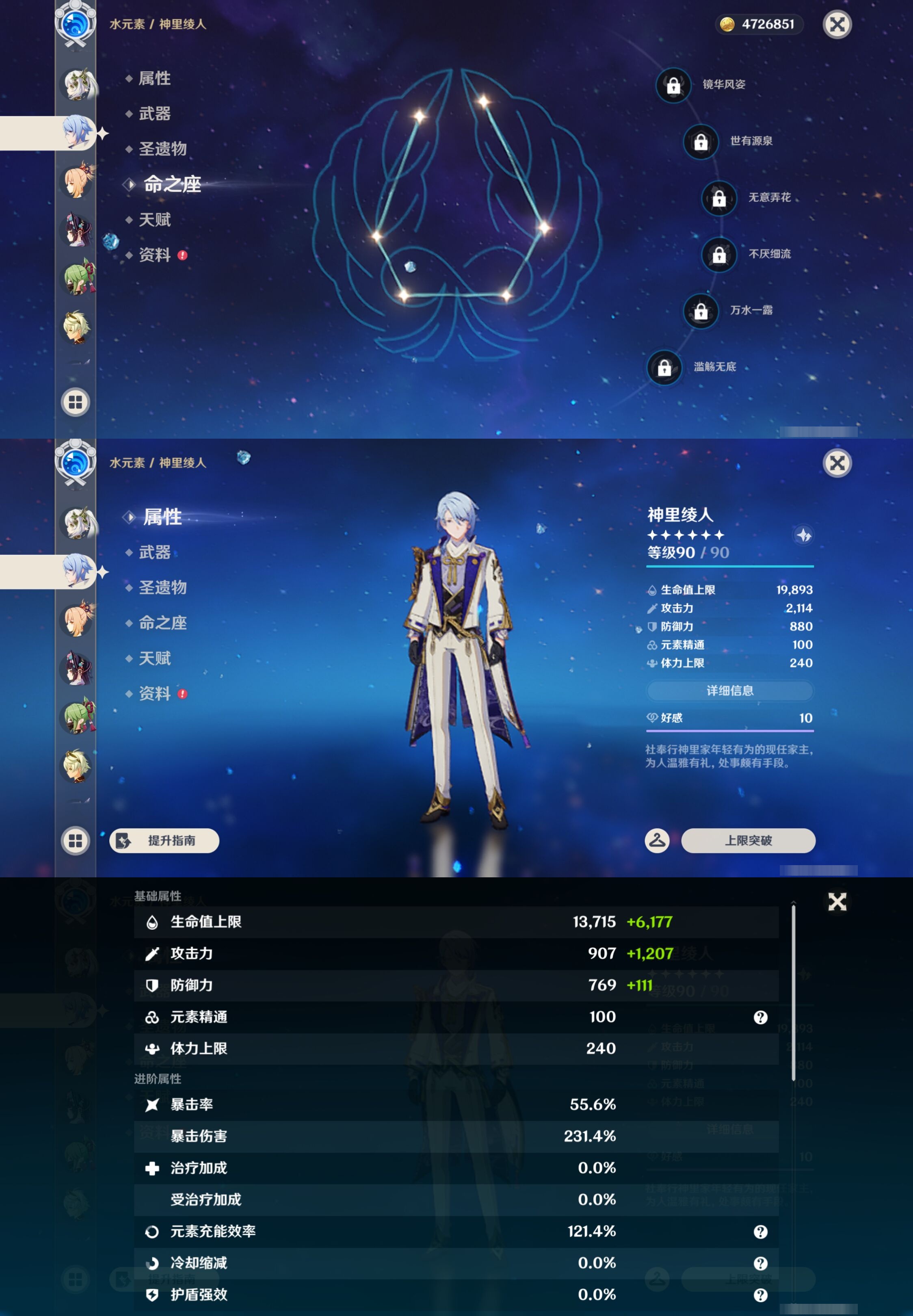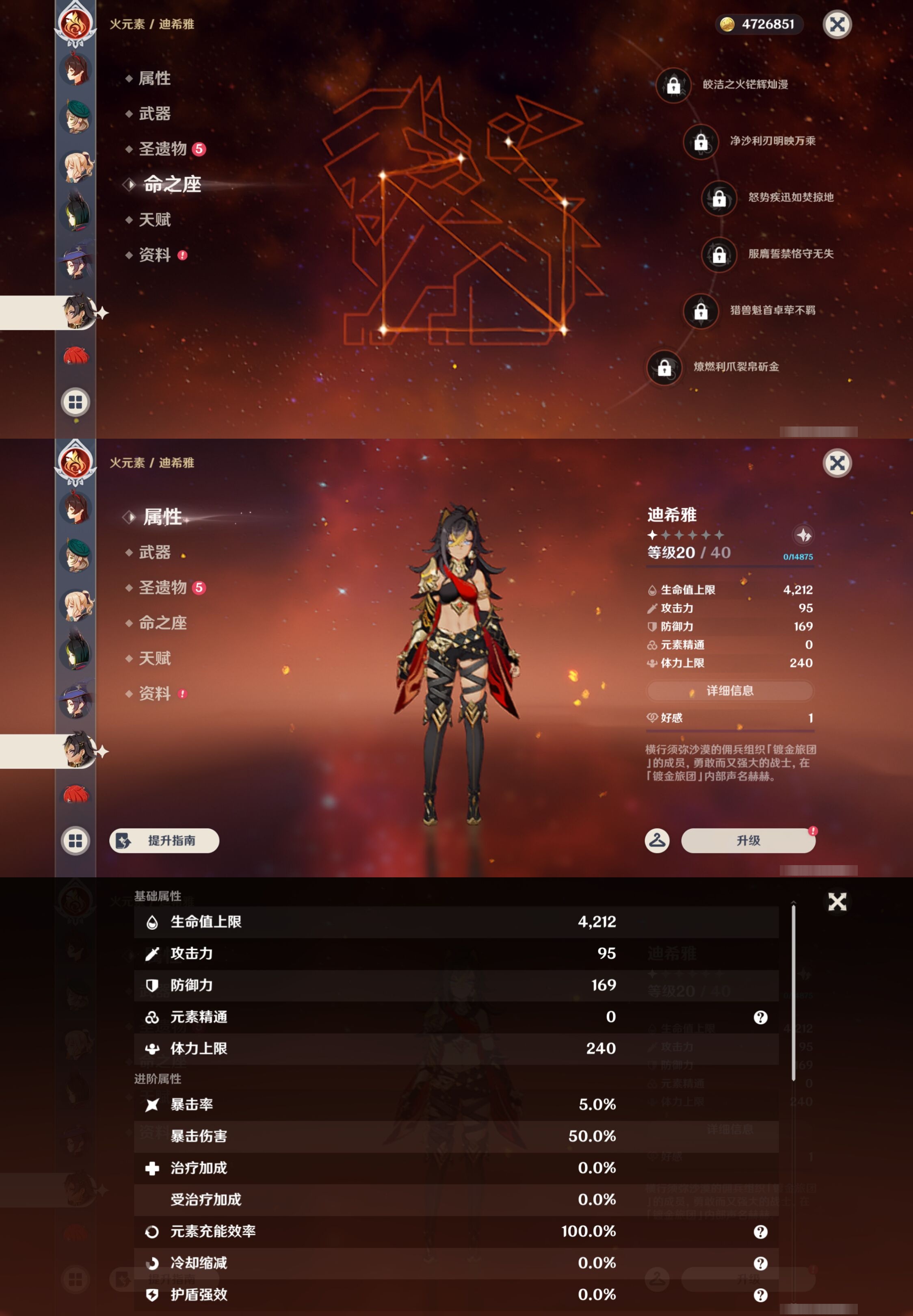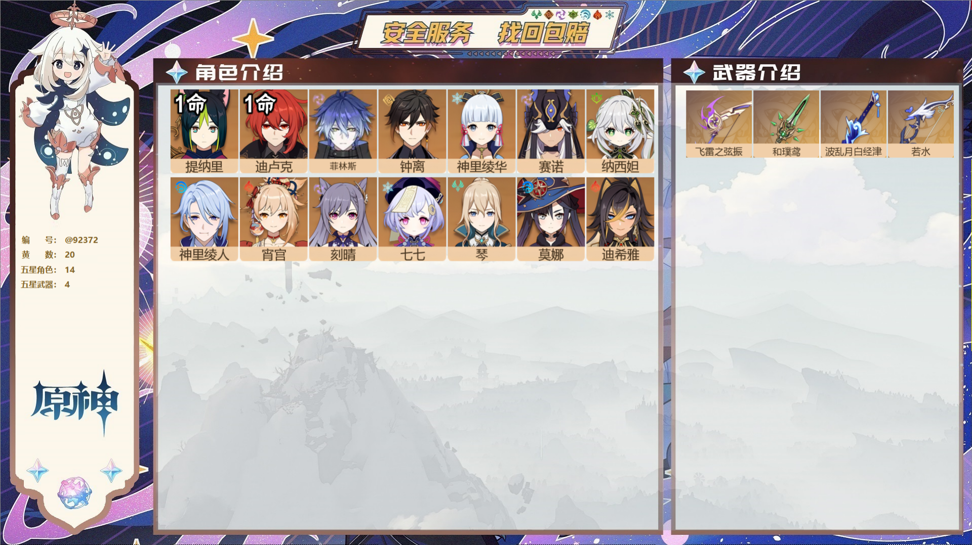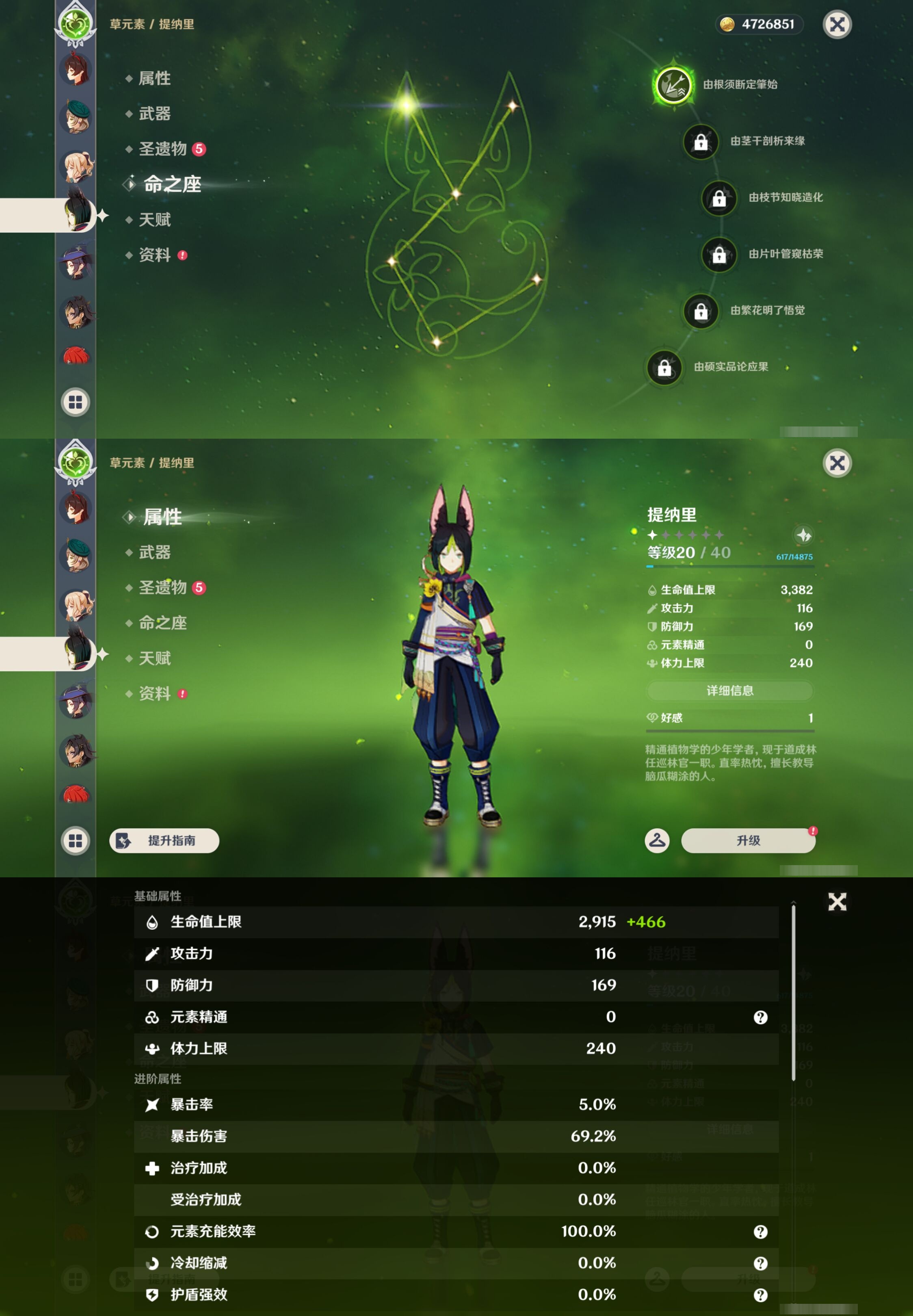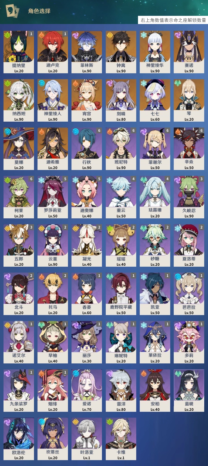 【14个五星角色】,1命提纳里,1命迪卢克,0命菲林斯,0命钟离,0命神里绫华,0命赛诺,0命纳西妲,0命神里绫人,0命宵宫,0命刻晴,0命七七,0命琴,0命莫娜,0命迪希雅,