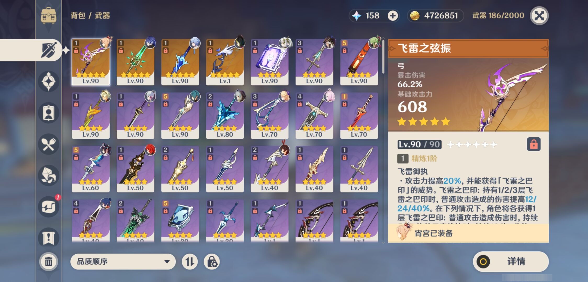 【4个五星武器】,精1飞雷之弦振,精1和璞鸢,精1波乱月白经津,精1若水,2套,