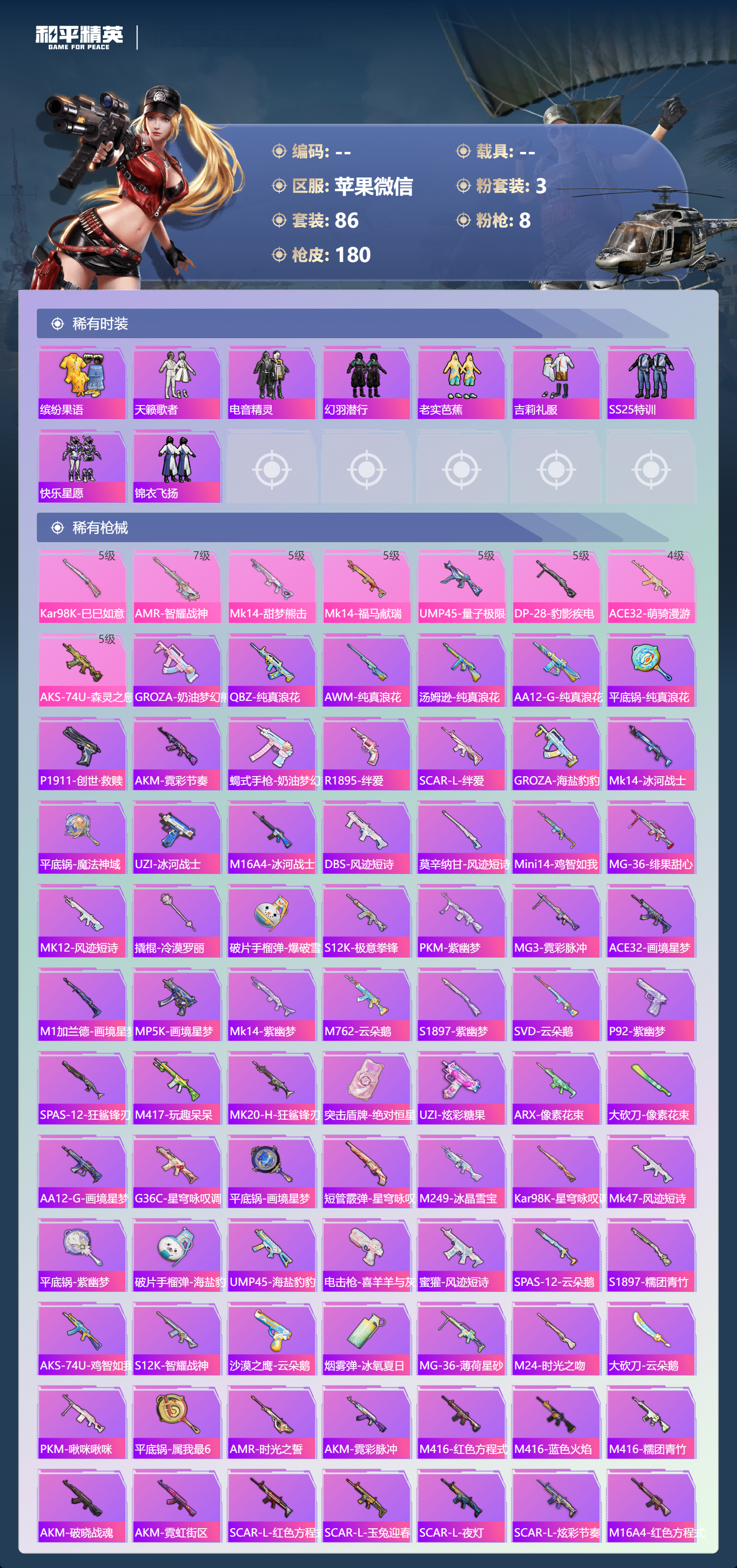 【179稀有枪械】Kar98K-巳巳如意/5级,AMR-智耀战神/7级,Mk14-甜梦熊击/5级,Mk14-福马献瑞/5级,UMP45-量子极限/5级,DP-28-豹影疾电/5级,ACE32-萌骑漫游/4级,AKS-74U-森灵之息/5级,GROZA-奶油梦幻熊,QBZ-纯真浪花,AWM-纯真浪花,汤姆逊-纯真浪花,DBS-乌木金纹,AA12-G-纯真浪花,平底锅-纯真浪花,P1911-创世·救赎,AKM-霓彩节奏,蝎式手枪-奶油梦幻熊,R1895-绊爱,SCAR-L-绊爱,GROZA-海盐豹豹,Mk14-冰河战士,平底锅-魔法神域,UZI-冰河战士,M16A4-冰河战士,MK20-H-乌木金纹,DBS-风迹短诗,莫辛纳甘-风迹短诗,Mini14-鸡智如我,MG-36-绯果甜心,Win94-乌木金纹,MK12-风迹短诗,MK12-乌木金纹,撬棍-冷漠罗丽,破片手榴弹-爆破雪人,S12K-极意拳锋,PKM-紫幽梦,MG3-霓彩脉冲,ACE32-画境星梦,M1加兰德-画境星梦,MP5K-画境星梦,Mk14-紫幽梦,蜜獾-乌木金纹,M762-云朵鹅,S1897-紫幽梦,SVD-云朵鹅,P92-紫幽梦,SPAS-12-狂鲨锋刃,M417-玩趣呆呆,MK20-H-狂鲨锋刃,突击盾牌-绝对恒星,UZI-炫彩糖果,ARX-像素花束,大砍刀-像素花束,AA12-G-画境星梦,G36C-星穹咏叹调,平底锅-画境星梦,短管霰弹-星穹咏叹调,M249-冰晶雪宝,Kar98K-星穹咏叹调,Mk47-风迹短诗,平底锅-紫幽梦,破片手榴弹-海盐豹豹,UMP45-海盐豹豹,AKS-74U-乌木金纹,电击枪-喜羊羊与灰太狼,蜜獾-风迹短诗,Famas-乌木金纹,SPAS-12-云朵鹅,S1897-糯团青竹,AKS-74U-鸡智如我,S12K-智耀战神,沙漠之鹰-云朵鹅,烟雾弹-冰氧夏日,MG-36-薄荷星砂,M24-时光之吻,大砍刀-云朵鹅,PKM-啾咪啾咪,平底锅-属我最6,AMR-时光之誓,AKM-霓彩脉冲,M416-红色方程式,M416-蓝色火焰,M416-糯团青竹,AKM-破晓战魂,AKM-霓虹街区,SCAR-L-红色方程式,SCAR-L-玉兔迎春,SCAR-L-夜灯,SCAR-L-炫彩节奏,M16A4-红色方程式,M16A4-蓝色火焰,M16A4-莲影清波,AUG-耀粉歌者,AUG-青春冒险家,QBZ-洛神天依,M762-彩虹符号,M762-天降萌叽,Mk47-洛神天依,AC-VAL-天降萌叽,AC-VAL-快闪甜心,蜜獾-天降萌叽,Kar98K-红色方程式,Kar98K-洛神天依,Kar98K-彩虹符号,AWM-天降萌叽,AWM-焰鹰斗篷,AMR-乌木金纹,M200-惊鸿侠骨,Mini14-耀粉歌者,M417-惊鸿侠骨,MK20-H-快闪甜心,UZI-红色方程式,UZI-啾咪啾咪,UMP45-蓝色火焰,UMP45-生命誓言,UMP45-猪猪侠,Vector-田园牧歌,Vector-焰鹰斗篷,汤姆逊-耀粉歌者,汤姆逊-天降萌叽,MP5K-乌木金纹,P90-乌木金纹,P90-快闪甜心,P90-玩趣呆呆,S686-红色方程式,S12K-破晓战魂,S12K-玩趣呆呆,DBS-焰鹰斗篷,M249-破晓战魂,M249-彩虹符号,M249-糯团青竹,DP-28-焰鹰斗篷,DP-28-彩虹符号,MG3-惊鸿侠骨,MG3-幻世战舞者,P1911-粉锦千层,蝎式手枪-闲梦青缨,沙漠之鹰-快闪甜心,大砍刀-青空秋雨,平底锅-惊鸿侠骨,平底锅-空岛之星,平底锅-快闪甜心,平底锅-焰鹰斗篷,爆炸猎弓-惊鸿侠骨,破片手榴弹-呆爆全场,GROZA-暮色玫影,AKM-橘猫汽水,AWM-暮色玫影,AA12-G-橘猫汽水,撬棍-暮色玫影,突击盾牌-虎痴许褚,AUG-异域银装,汤姆逊-樱桃泡泡,MK20-H-樱桃泡泡,M24-樱桃泡泡,野牛-燕燕于飞,M200-乌木金纹,SPAS-12-燕燕于飞,蝎式手枪-燕燕于飞,十字弩-异域银装,大砍刀-鬼刀,S686-巳巳如意,SPAS-12-乌木金纹,Vector-燕燕于飞,十字弩-燕燕于飞,M16A4-雨过天青,GROZA-福马献瑞,蜜獾-启元战纹,AMR-雨过天青,SLR-乌木金纹,AA12-G-雨过天青,PKM-雨过天青,沙漠之鹰-雨过天青,燃烧瓶-福马献瑞,VSS-香桃花海,汤姆逊-像素花束,P90-巳巳如意,破片手榴弹-巳巳如意