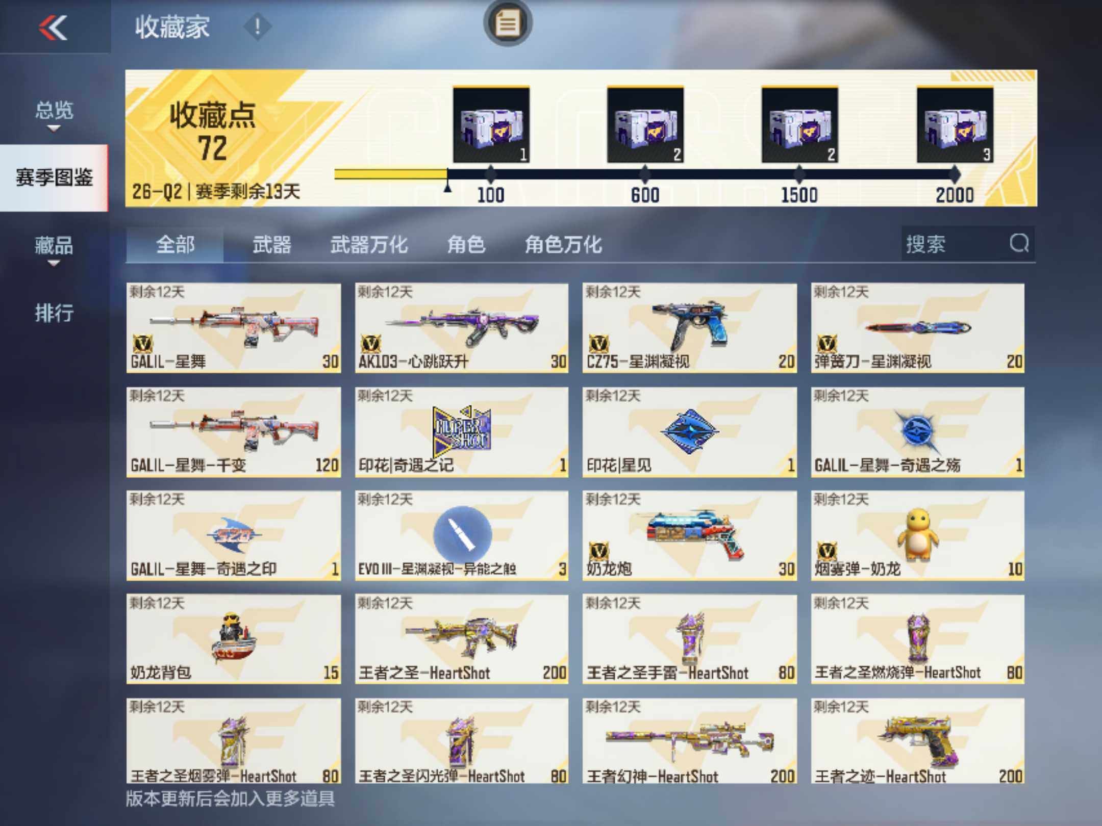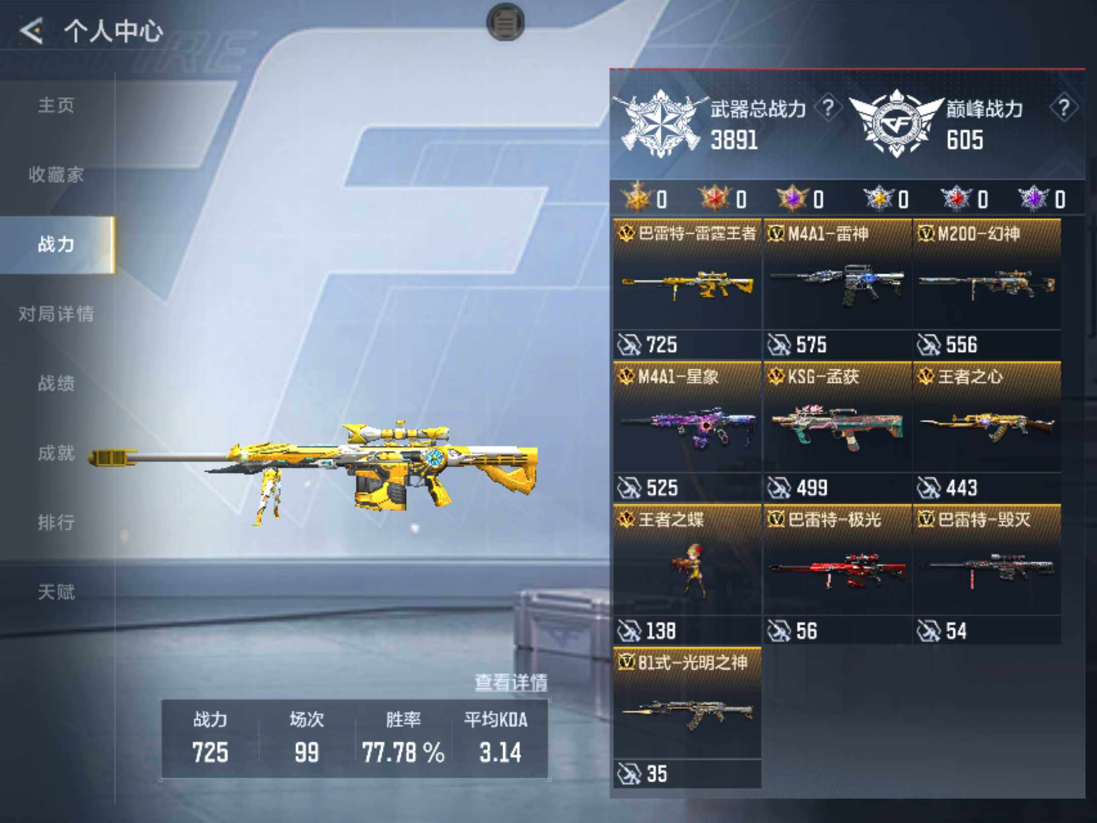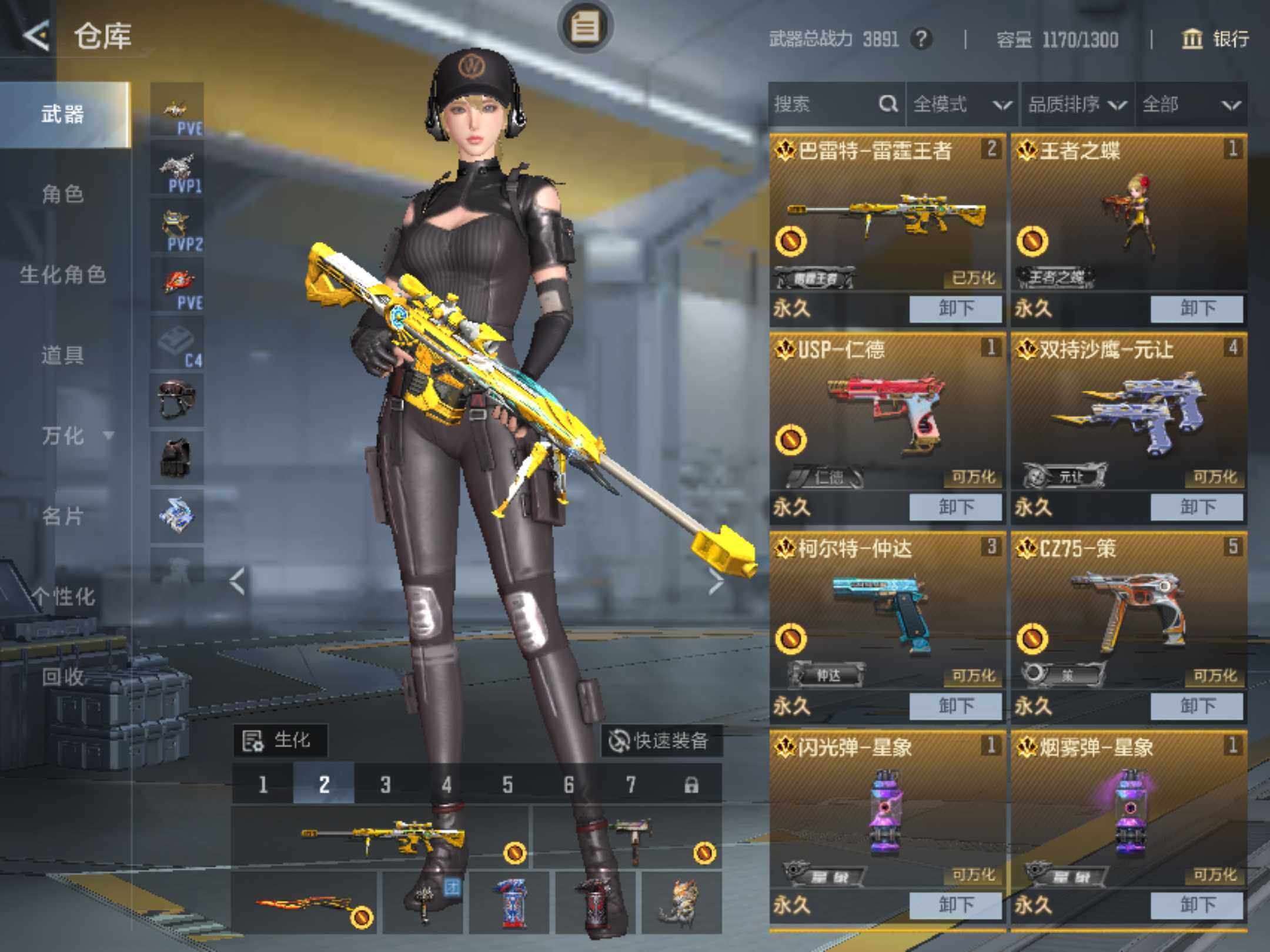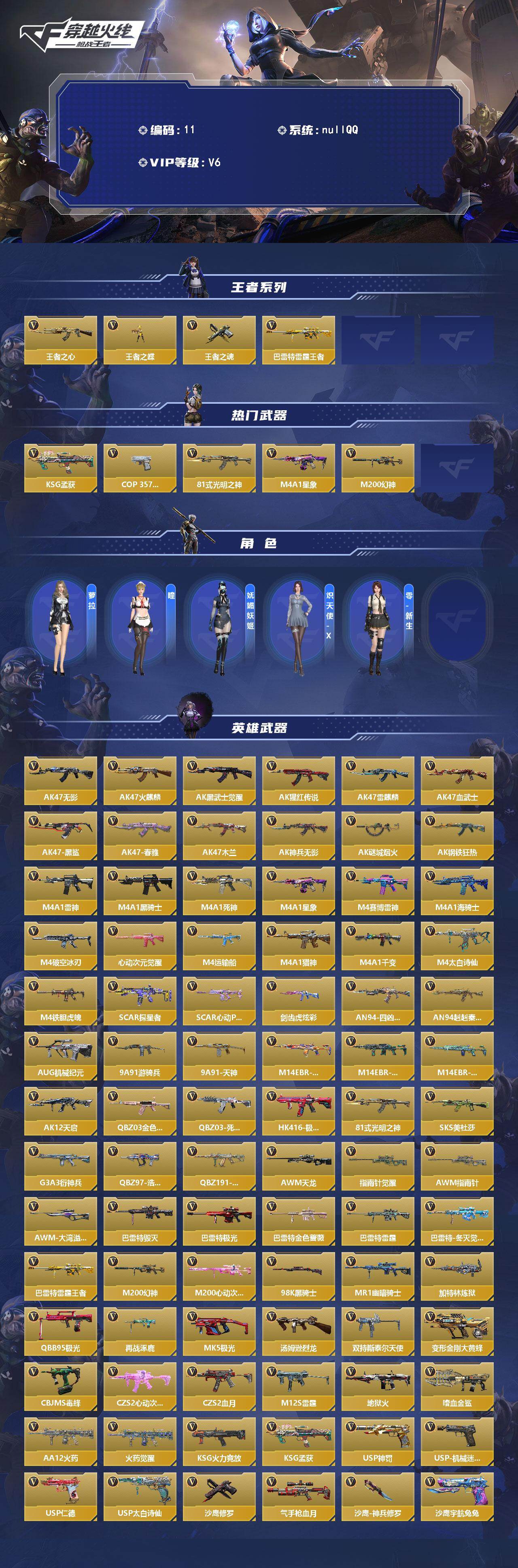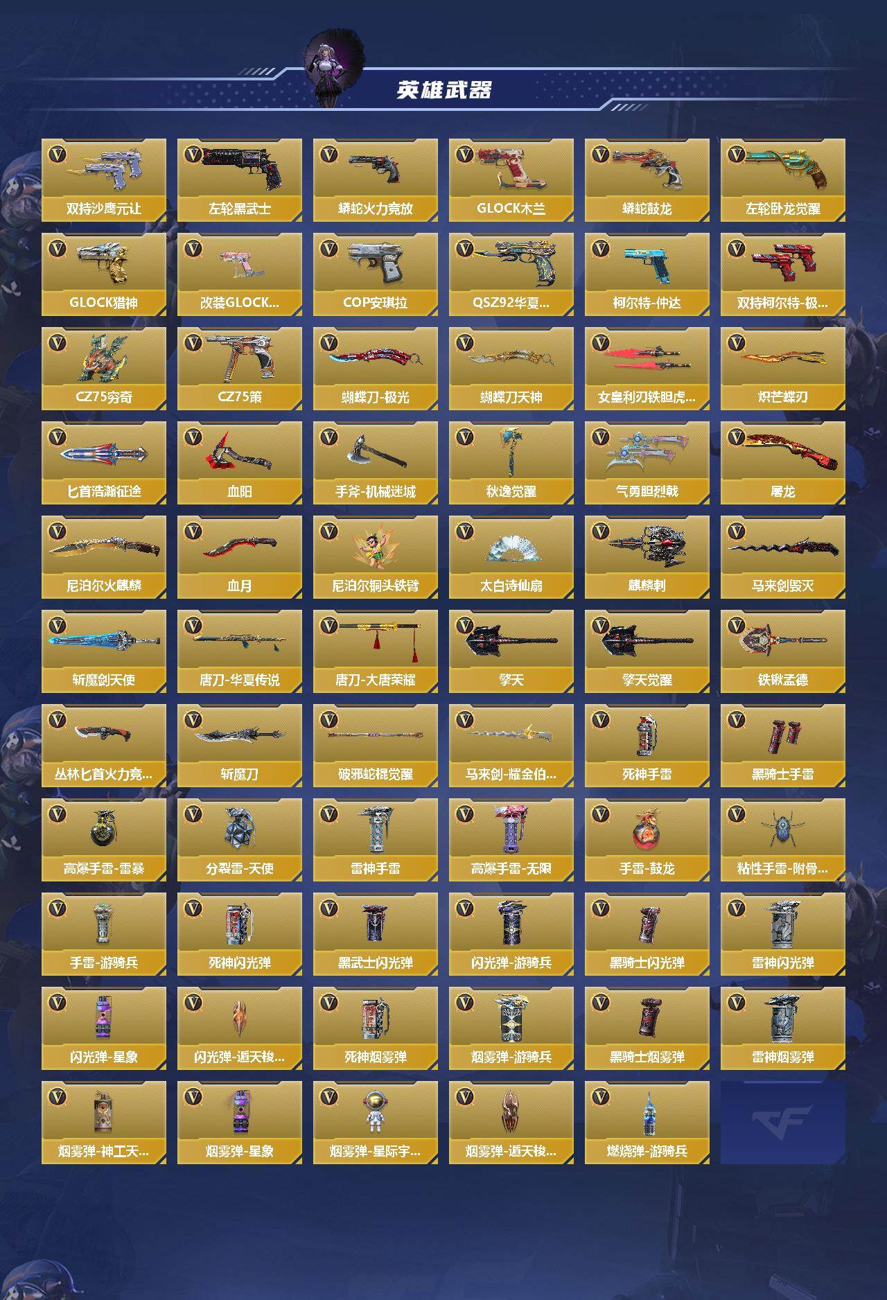 【英雄武器】:AK47-无影,AK47-火麒麟,AK47-黑武士觉醒*2,AK47-猩红传说,AK47-雷麒麟,AK47-血武士,AK47-黑鲨,AK47-春雅,AK47-木兰*2,AK47-神兵无影,AK47-谜城烟火,AK47-钢铁狂热,M4A1-雷神,M4A1-黑骑士*2,M4A1-死神,M4A1-星象,M4A1-赛博雷神,M4A1-海骑士,M4A1-破空冰刃,M4A1-心动次元觉醒,M4A1-运输船,M4A1-猎神,M4A1-千变,M4A1-太白诗仙,M4A1-铁胆虎魄,SCAR-探星者,SCAR-心动PICK,剑齿虎-炫彩,AN94-四凶觉醒,AN94-赳赳秦师,AUG-机械纪元,9A91-游骑兵,9A91-天神,M14EBR-拂影,M14EBR-玄武,M14EBR-葫芦山庄,AK12-天启,QBZ03-金色蔷薇*3,QBZ03-死神,HK416-极光,81式-光明之神,SKS-美杜莎,G3A3-衍神兵,QBZ97-浩瀚征途,QBZ191-封神榜,AWM-天龙,AWM-指南针觉醒,AWM-指南针,AWM-大湾溢彩,巴雷特-毁灭*4,巴雷特-极光,巴雷特-金色蔷薇,巴雷特-雷霆,巴雷特-冬灭觉醒,巴雷特-雷霆王者,M200-幻神,M200-心动次元,98K-黑骑士*2,MR1-幽暗骑士,加特林-炼狱,QBB95-极光,QBB95-再战涿鹿,MK5-极光,汤姆逊-烈龙*2,双持斯泰尔-天使,QCW05-变形金刚·大黄蜂,CBJ-MS-毒蜂,CZS2-心动次元*2,CZS2-血月,M12S-雷霆,地狱火,嗜血金鲨,AA12-火药,AA12-火药觉醒,KSG-火力竞放,KSG-孟获,USP-神罚*2,USP-机械迷城,USP-仁德,USP-太白诗仙,沙鹰-修罗*4,气手枪-血月,沙鹰-神兵修罗,沙鹰-宇航兔兔,双持沙鹰-元让,左轮-黑武士,蟒蛇-火力竞放,改装GLOCK-木兰,蟒蛇-鼓龙,左轮-卧龙觉醒,GL