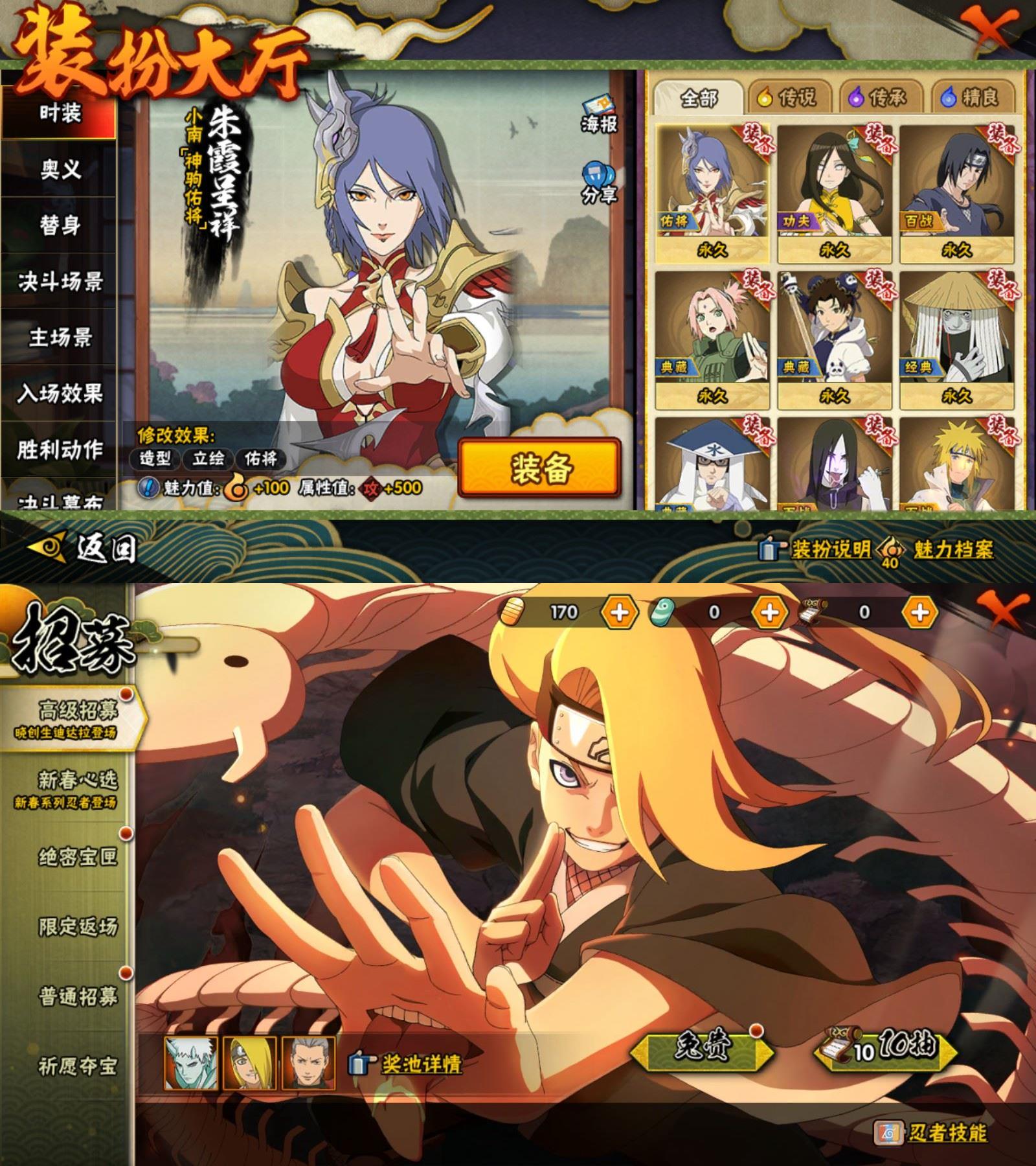 【A忍者】,佩恩·六道「漂泊浪客」,千手扉间「漂泊武士」,小南「神驹佑将」,旗木卡卡西「神威对决」,机械鸣人「初始形态」,大野木「侠隐江湖」,巳月「仙人模式」,迈特凯「青春爆炸」,土台「忍界大战」,长十郎「六代目水影」,不缘,日向宁次「忍界大战」,漩涡博人「桃式显现」,日向雏田「最终章」,旗木卡卡西「幻之真容」,李洛克「忍界大战」,不动,蝎「绯流琥」,宇智波泉奈,神农「羁绊」,桃地再不斩「秽土转生」,长门「青年」,艾「青年」,达鲁伊「五代目雷影」,波风水门「青年」,猿飞日斩「三忍之师」,宇智波佐助「须佐能乎」,漩涡鸣人「九尾查克拉」,千代「近松十人卫」,药师兜「半蛇斗篷」,宇智波佐助「疾风传咒印」,秋道丁次「忍界大战」,春野樱「百豪」,宇智波佐助「万花筒写轮眼」,奇拉比,飞段「死司凭血」,小南,飞段,迪达拉,我爱罗「疾风传」,蝎,干柿鬼鲛,宇智波鼬,猿飞阿斯玛,迈特凯,