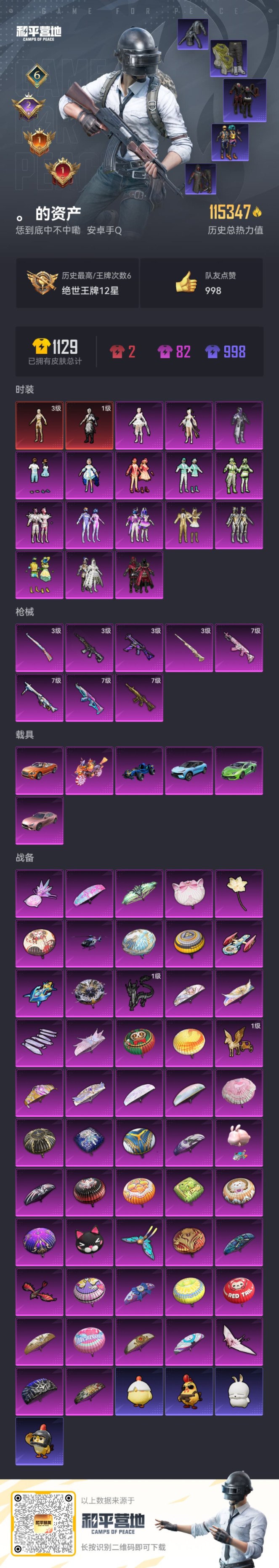 PX_2547462-6载具-191套装-303枪皮-图卡盟3级,敖渊,都市猎人,2红装2稀有8载具16粉装8特枪热力值6印记【2红装】,墨龙九天-敖渊,(1级),沙丘之主-图卡盟,(3级),【2稀有】,奇异狩猎者,都市猎人,【8载具】,路特斯EL蓝色,宾利欧陆GT火焰橘,玛莎拉蒂粉色,兰博SVJ绿色,合金龙骨蓝色,鬼马风驰,空客蔚蓝之翼僚机,萌兔起飞僚机,【16粉装】,梦幻火箭,绝色倾城,千金淑猫,洛天依,幻影战神,金属狂野,妙趣可丽,仲夏莫吉托,极致幻想,香水柠檬,绚金战神,冰霜白皇,炙焰红王,薄荷物语,海渊国主,碧影闪光,【8特效枪】,M416-五爪金龙,(7级),M416-墨龙九天,(3级),UMP45-宇宙意志,(3级),Kar98K-巳巳如意,(3级),M762-甜蜜誓约,(7级),M24-镜域双华,(3级),AKM-梦之光华,(7级),MG3-洛神天依,(7级),【28热门】,Mark.06,龟仙人,鹰眼刺客,迅捷狂鲨,深海小丑鱼,梦起落英,暗夜契约,暗影哥特,团圆交子,瑞龙福将,纯白誓言,粉红小猪,忍者信条,狂沙舞者,漫步者,冰爽海盐,梦之呓语,白虎圣者,安第斯皇冠,破蛋小黄鸡,军刀雅典娜,英勇保护者,AKM-奇异狩猎者,M762-瑞龙福将,S686-奇异狩猎者,Kar98K-古效堡领主,M24-香水柠檬,M762-风花雪月,【4飞行器】,龙翔九天飞行器,春暖花开飞行器,甜蜜誓约飞行器,焰龙焚天飞行器,【6头盔】,童趣迷兔头盔,九霄头盔,梦幻火箭头盔,甜心宝贝头盔,幻影战神头盔,甜蜜誓约头盔,【6背包】,梦幻火箭背包,幻影战神背包,金属狂野背包,神秘黑猫背包,古堡领主背包,甜蜜誓约背包,营地ID: