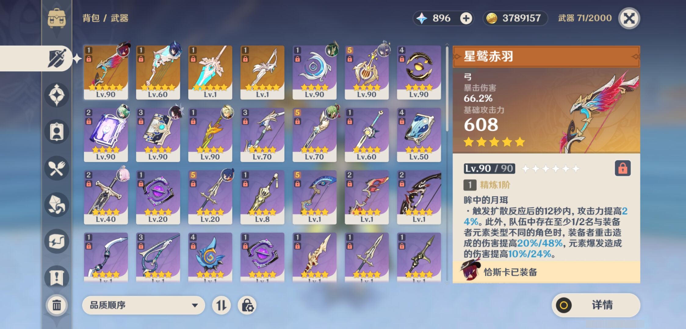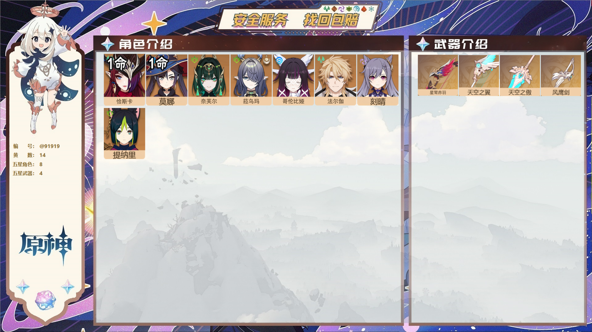 PX_2525938-,邮箱不出售,,冒险等级55级,男主,14黄,8个五星角色,4个五星武器,纠缠之源0--原石89--圣遗物71, 【8个五星角色】,1命恰斯卡,1命莫娜,0命奈芙尔,0命菈乌玛,0命哥伦比娅,0命法尔伽,0命刻晴,0命提纳里, 【4个五星武器】,精1星鹫赤羽,精1天空之翼,精1天空之傲,精1风鹰剑,