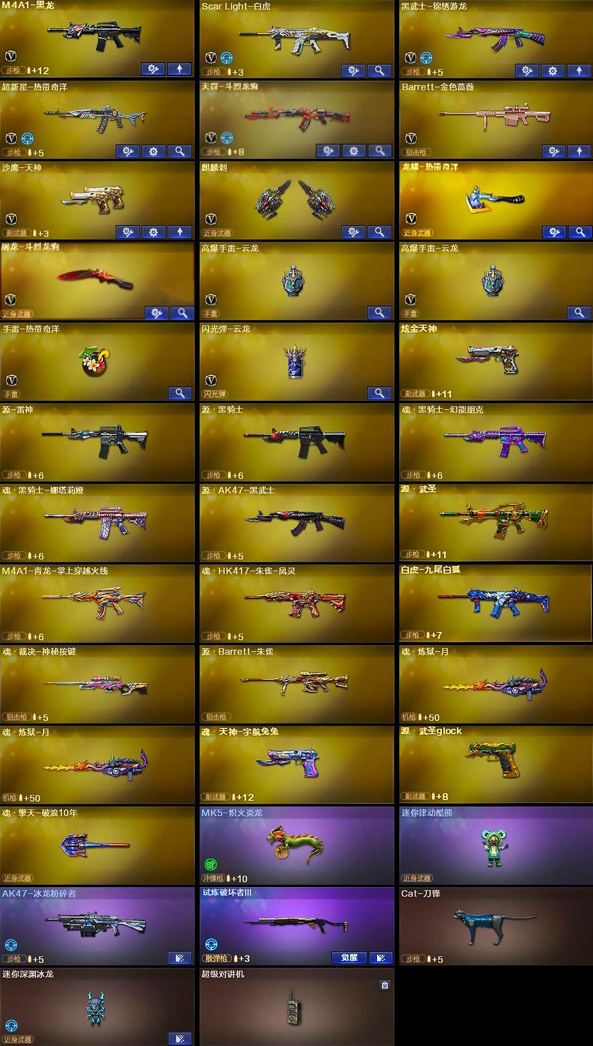 【热门武器】:Scar,Light-白虎,金色小号,Cat-刀锋,5-炽火炎龙