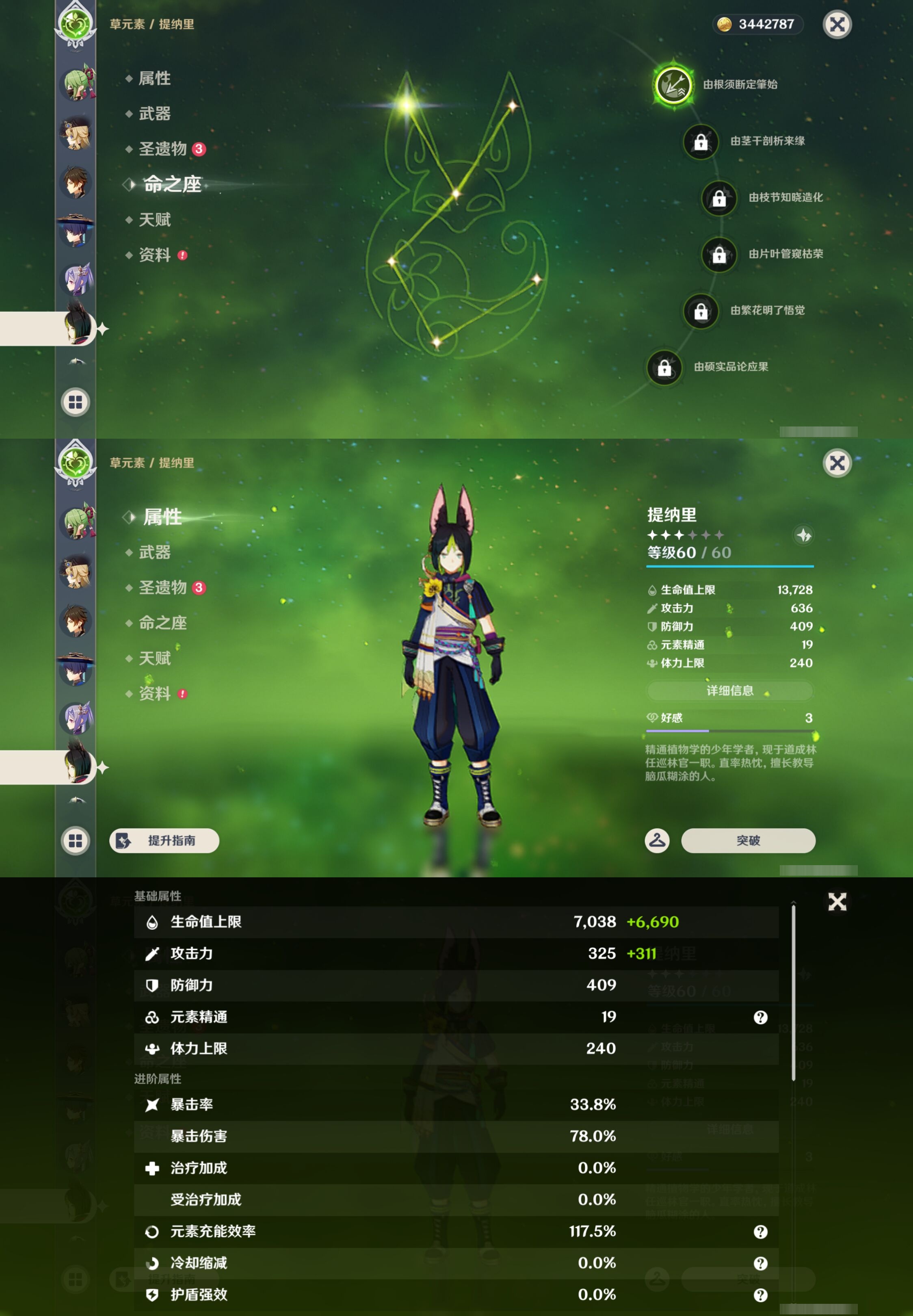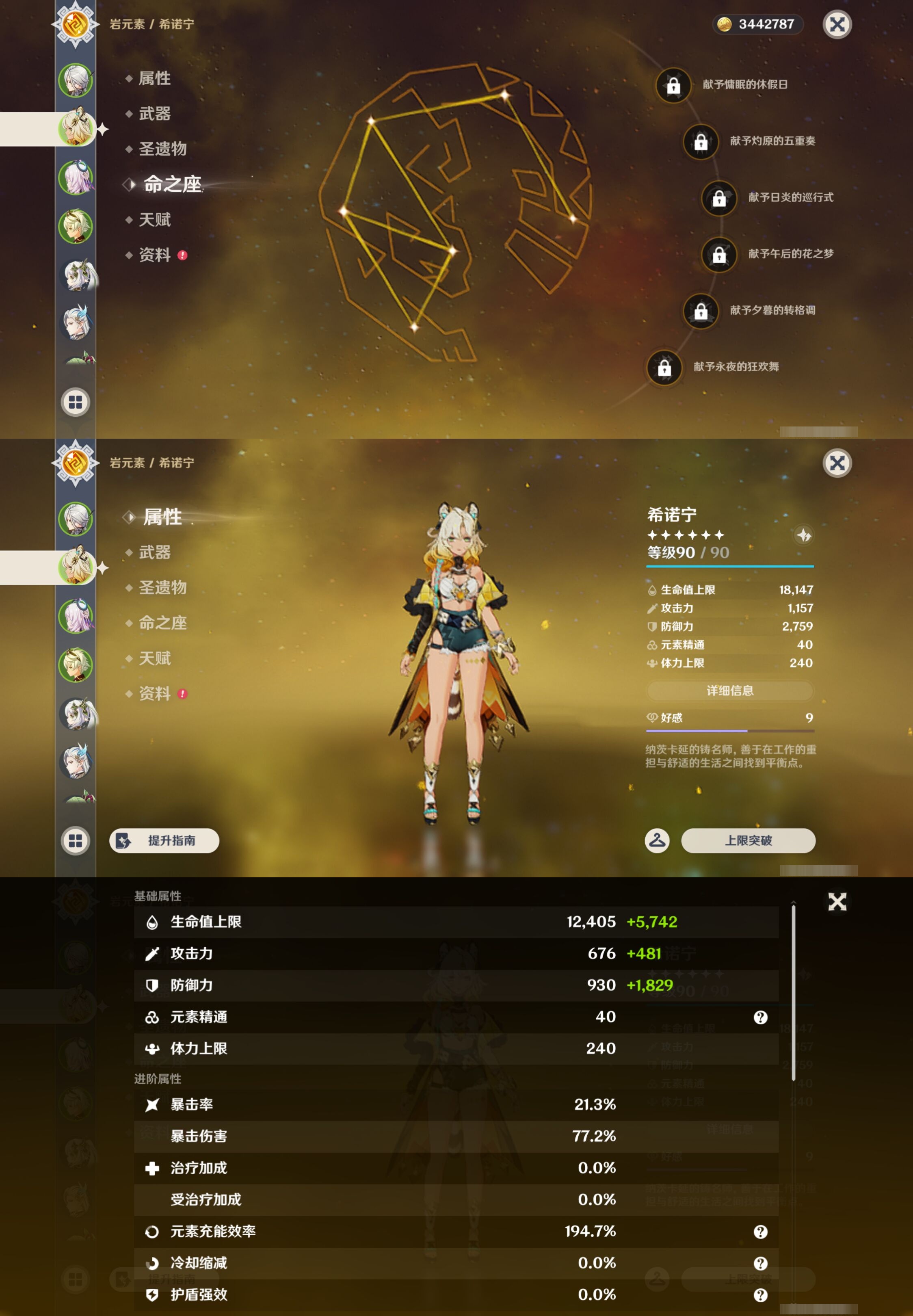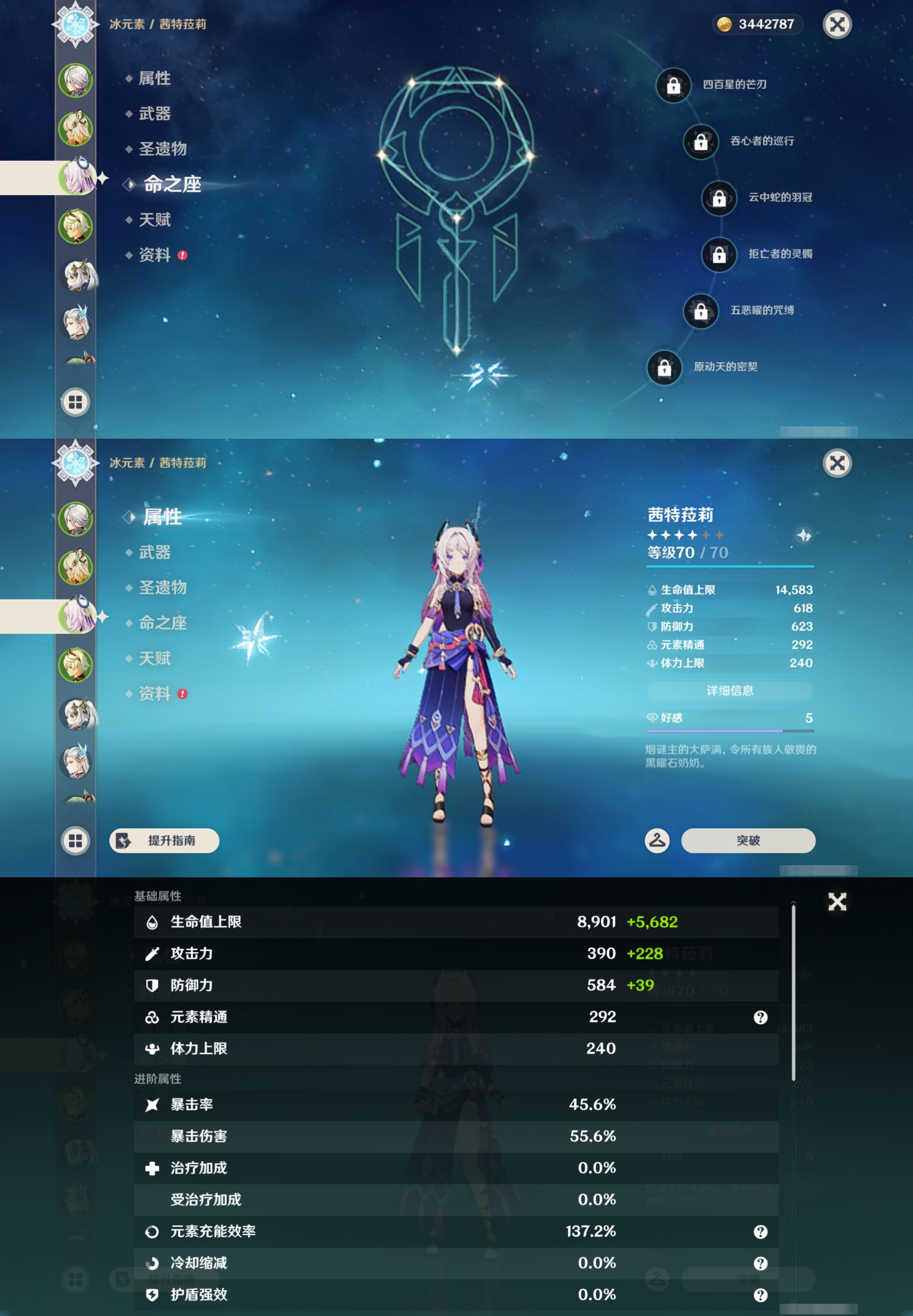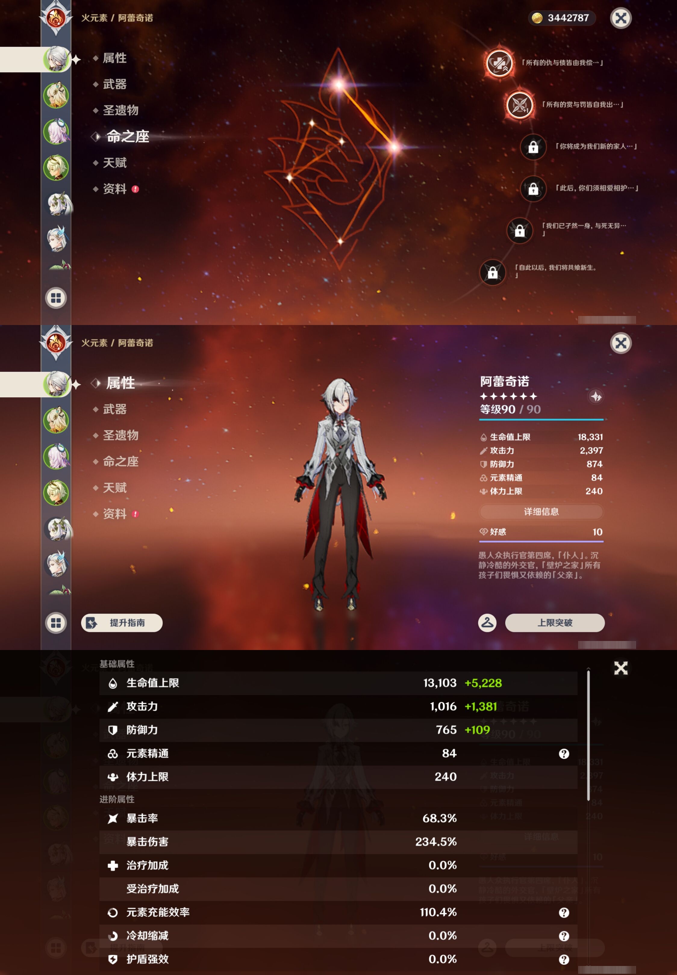【13个五星角色】,2命阿蕾奇诺,1命纳西妲,1命提纳里,1命琴,1命迪卢克,0命希诺宁,0命茜特菈莉,0命那维莱特,0命娜维娅,0命钟离,0命流浪者,0命刻晴,0命哥伦比娅,