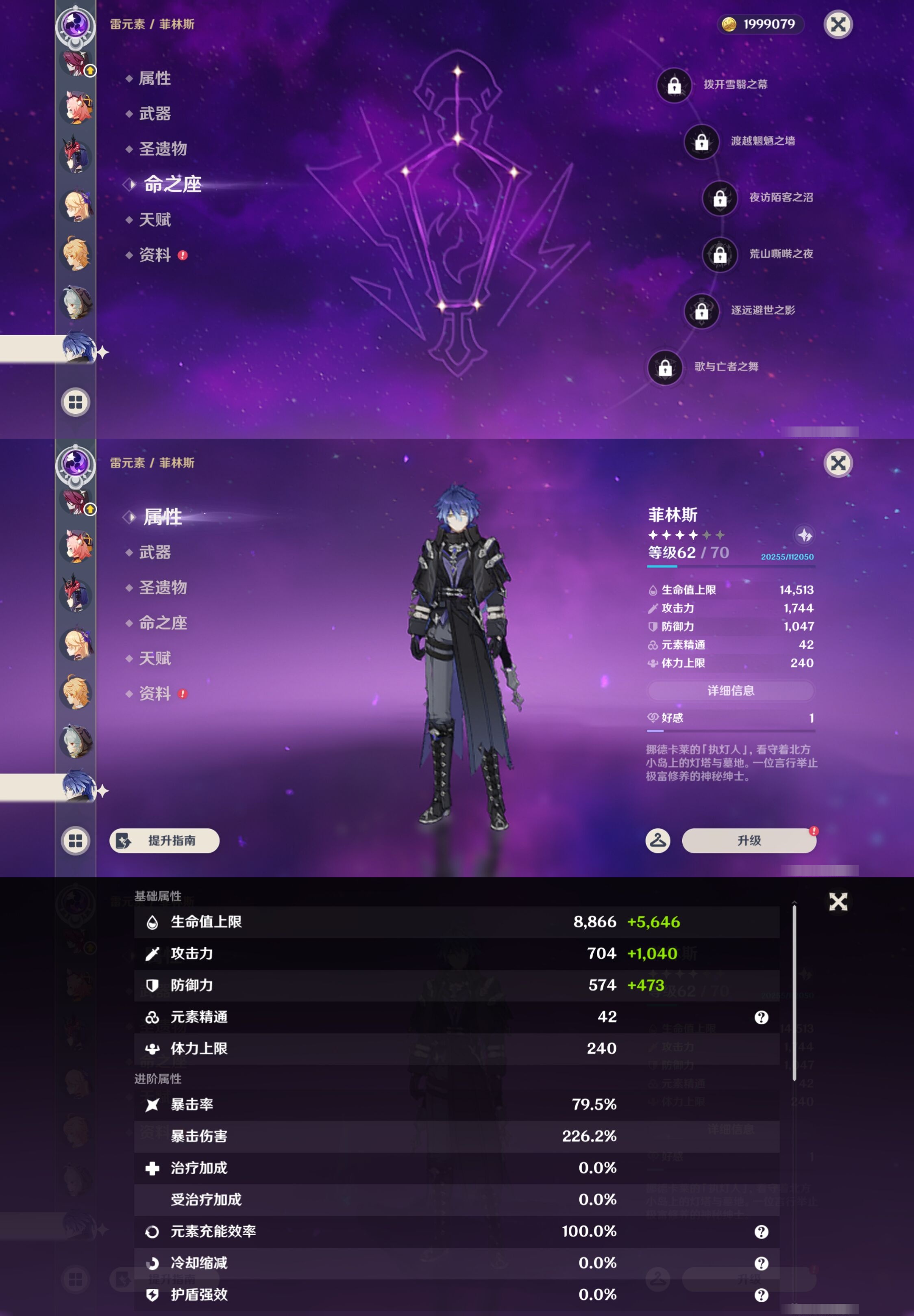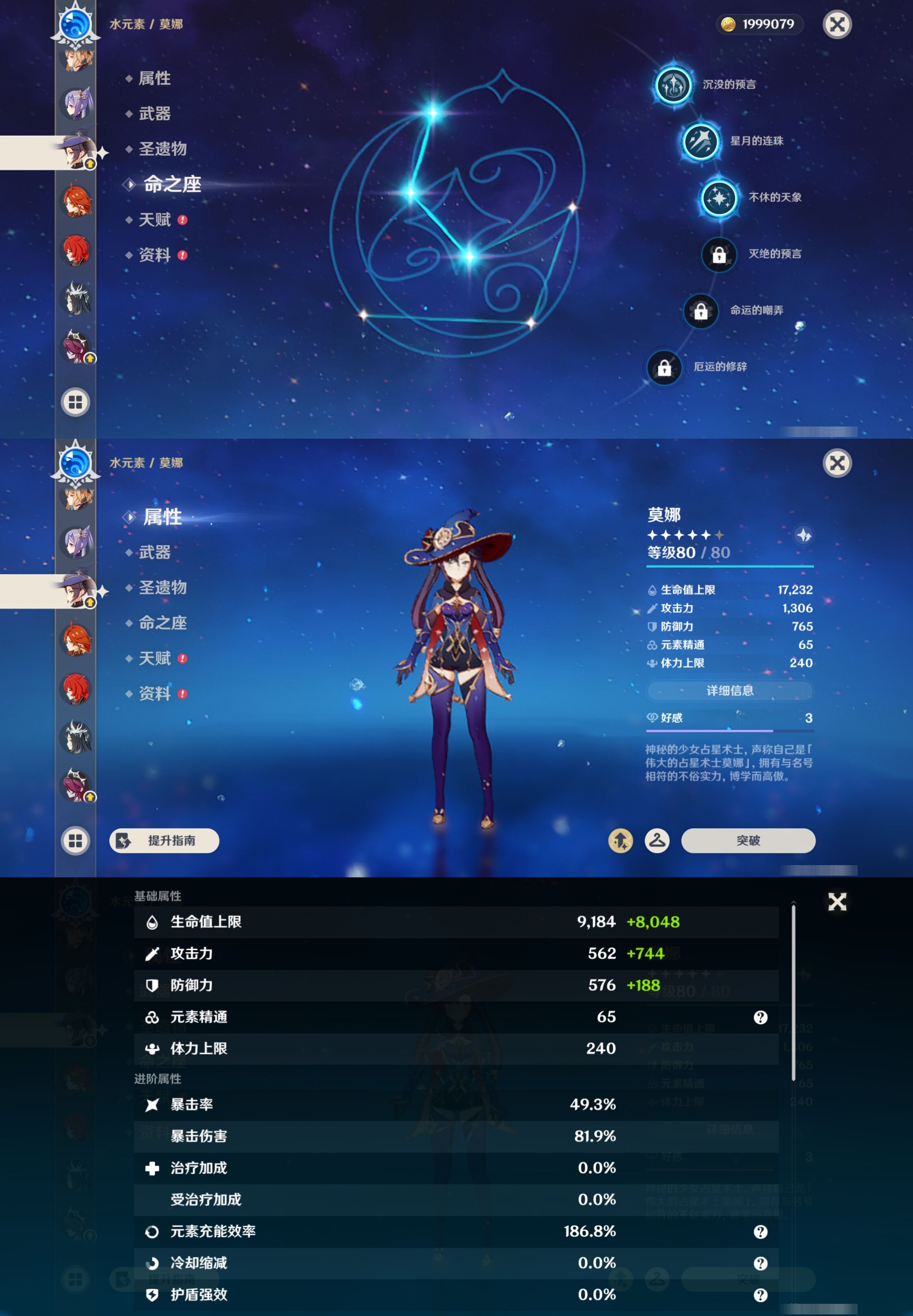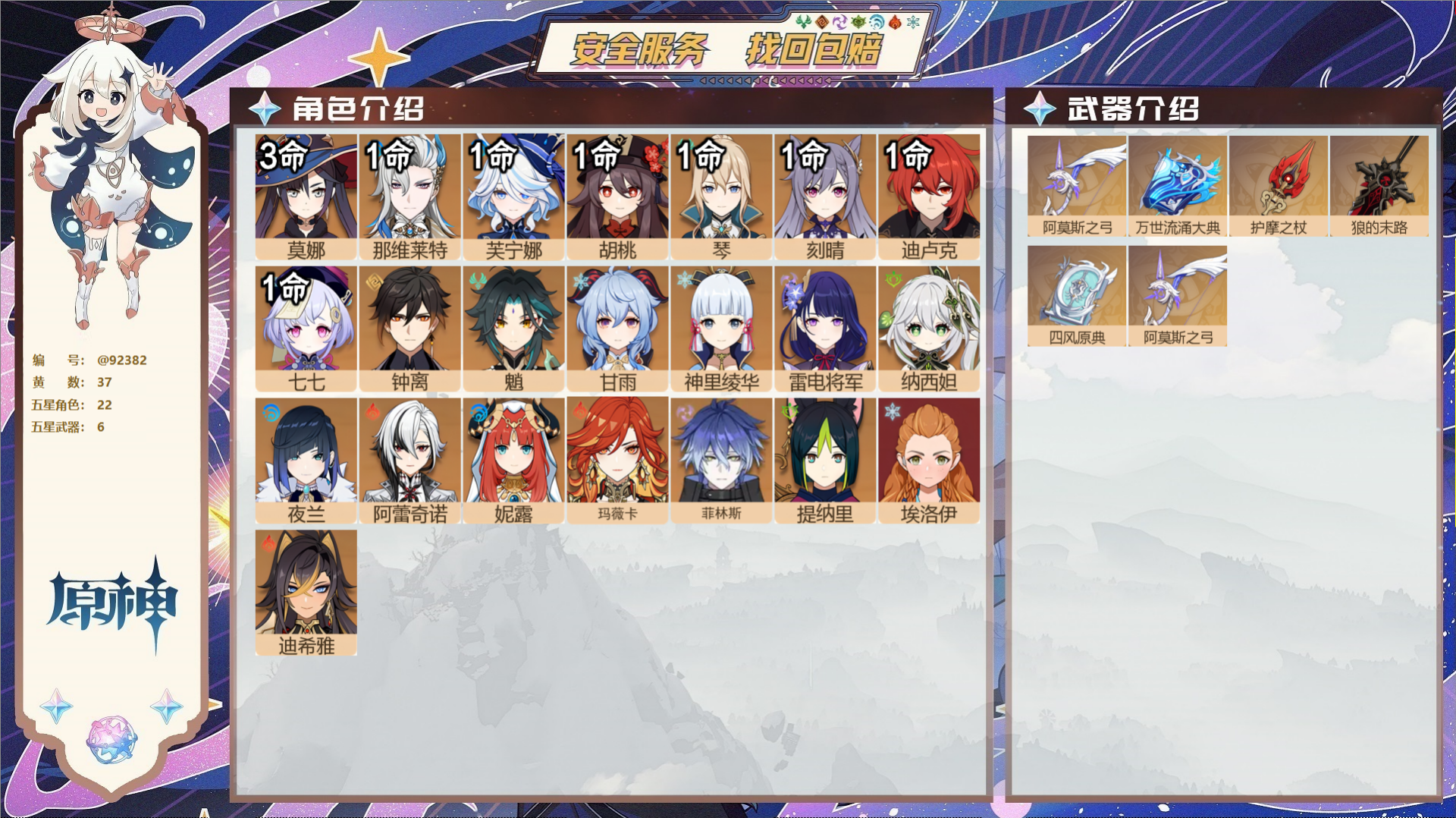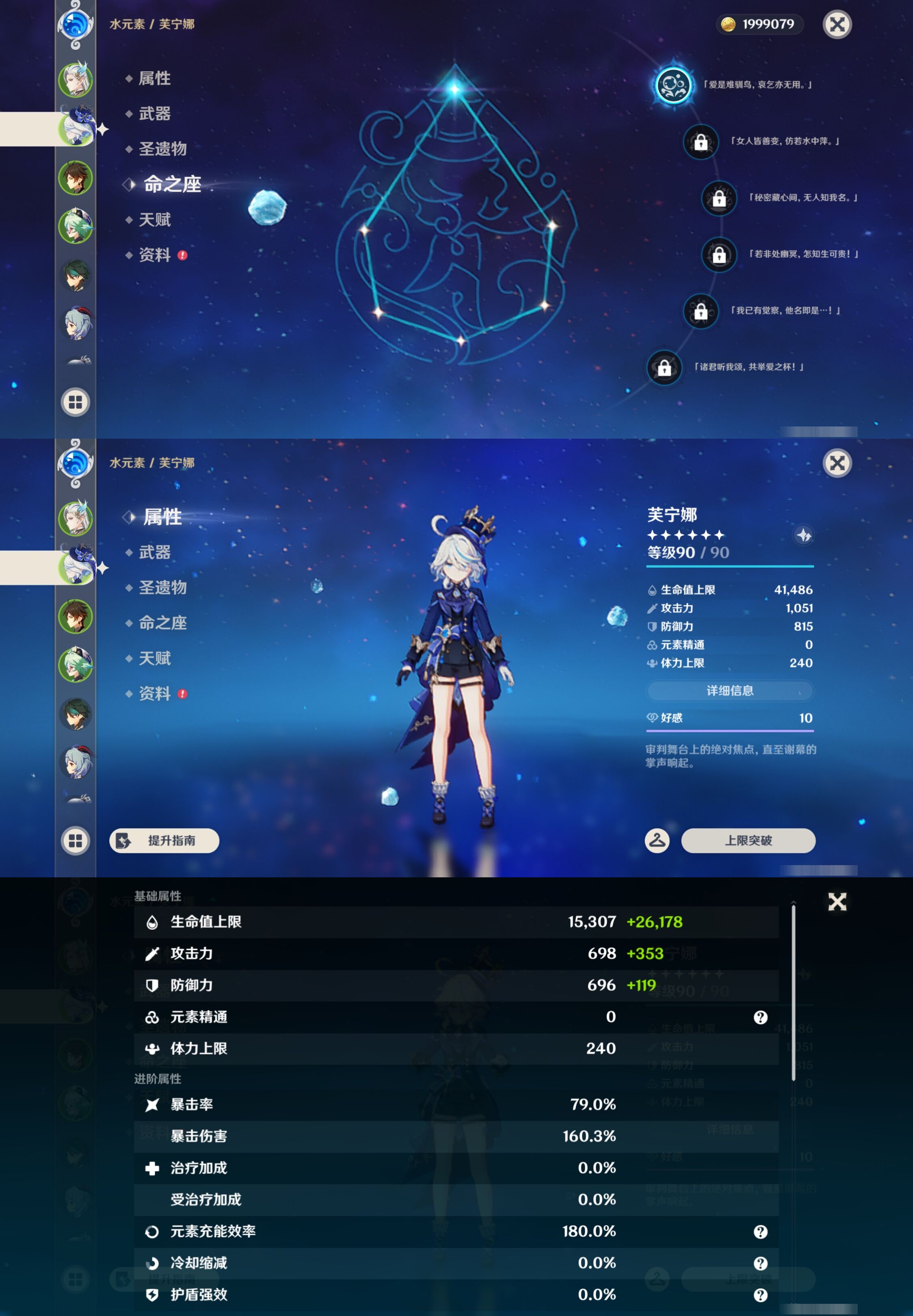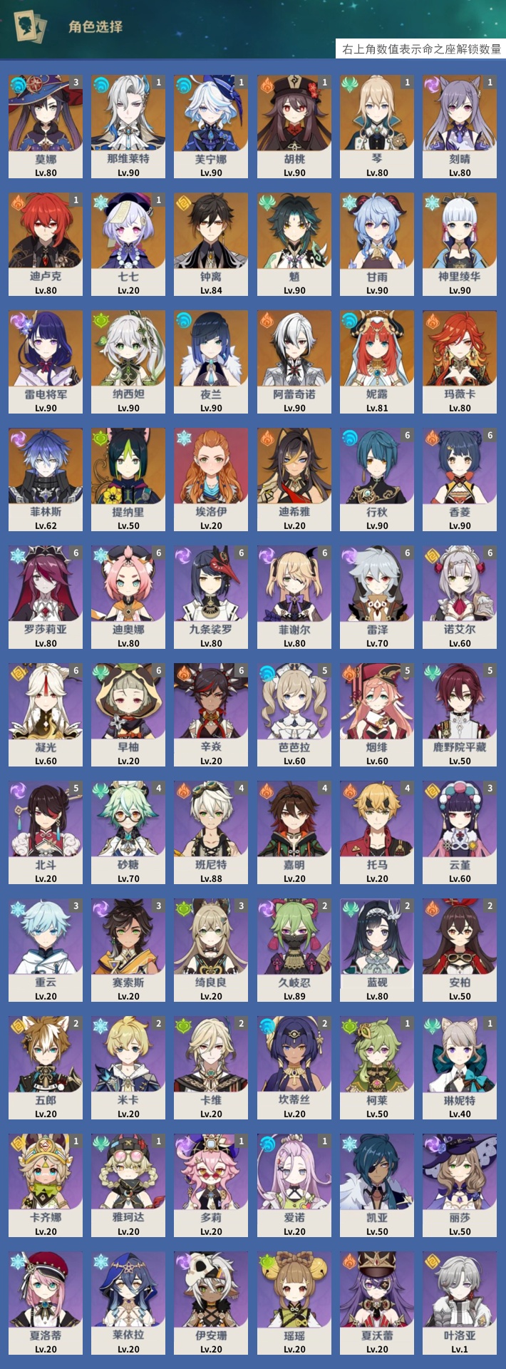 【22个五星角色】,3命莫娜,1命那维莱特,1命芙宁娜,1命胡桃,1命琴,1命刻晴,1命迪卢克,1命七七,0命钟离,0命魈,0命甘雨,0命神里绫华,0命雷电将军,0命纳西妲,0命夜兰,0命阿蕾奇诺,0命妮露,0命玛薇卡,0命菲林斯,0命提纳里,0命埃洛伊,0命迪希雅,