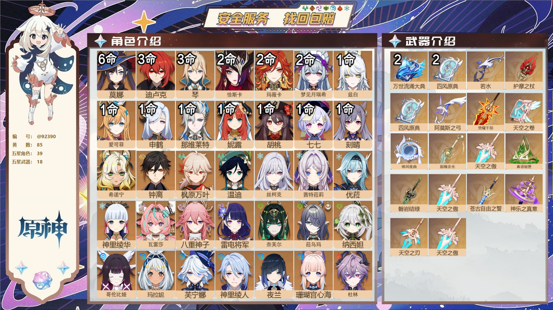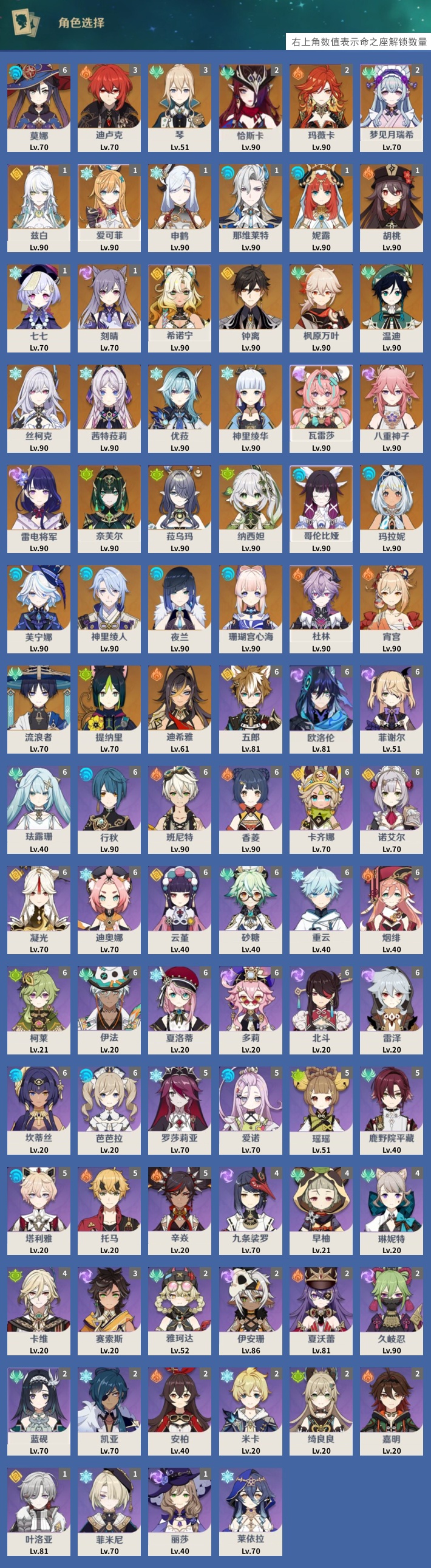 【39个五星角色】,满命莫娜,3命迪卢克,3命琴,2命恰斯卡,2命玛薇卡,2命梦见月瑞希,1命兹白,1命爱可菲,1命申鹤,1命那维莱特,1命妮露,1命胡桃,1命七七,1命刻晴,0命希诺宁,0命钟离,0命枫原万叶,0命温迪,0命丝柯克,0命茜特菈莉,0命优菈,0命神里绫华,0命瓦雷莎,0命八重神子,0命雷电将军,0命奈芙尔,0命菈乌玛,0命纳西妲,0命哥伦比娅,0命玛拉妮,0命芙宁娜,0命神里绫人,0命夜兰,0命珊瑚宫心海,0命杜林,0命宵宫,0命流浪者,0命提纳里,0命迪希雅,